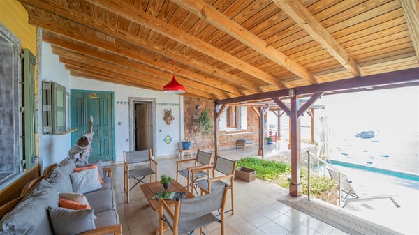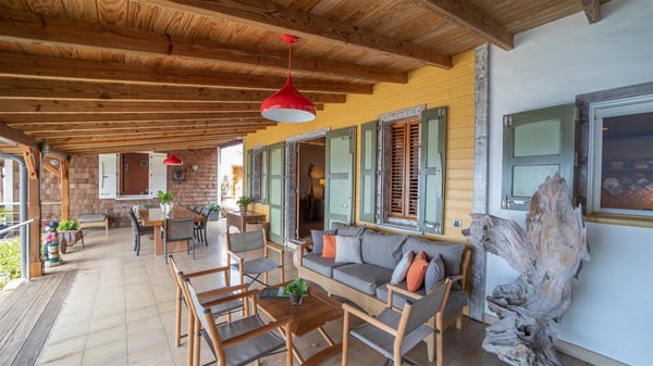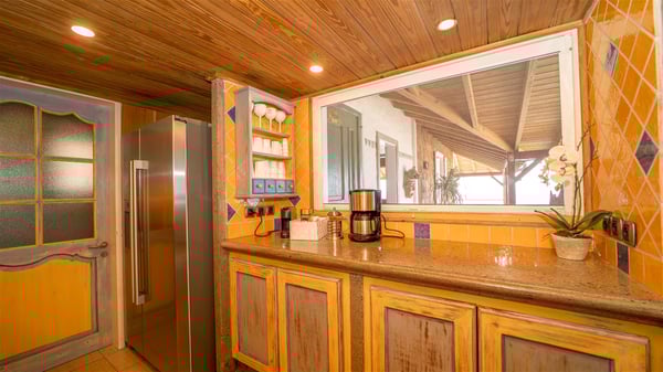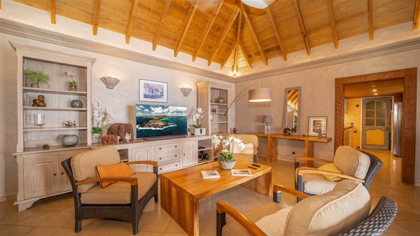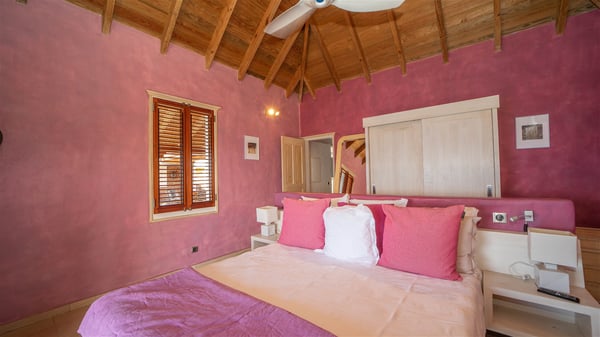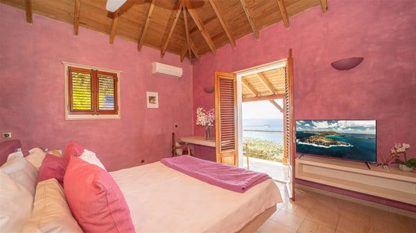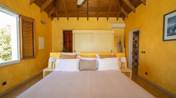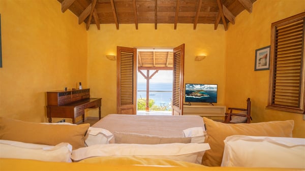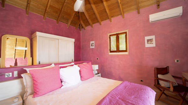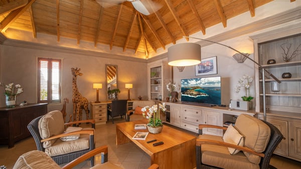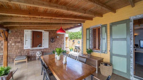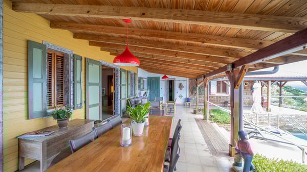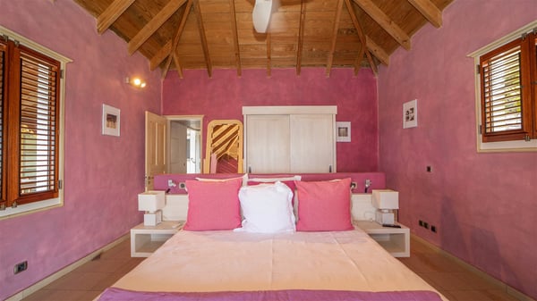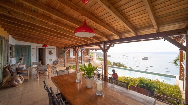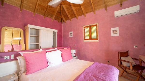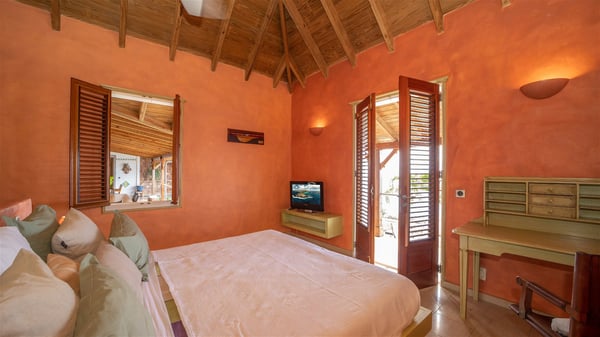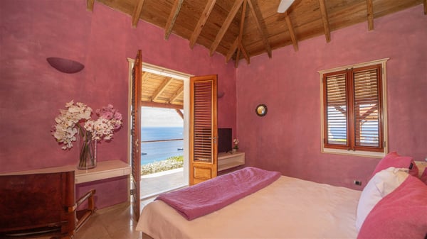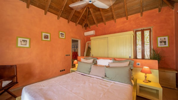 The vacation villa rental Hurakan is a charming property located in Colombier’s tropical beauty. Ideally facing west, this holiday home with a swimming pool is the perfect place to enjoy the glorious sunsets over the ocean. Comfortable and very private, villa Hurakan welcomes up to six guests in an elegant setting for an unforgettable stay in the Caribbean. Built on one level over two buildings connected by a shaded terrace, the vacation villa Hurakan is a Caribbean-style property ideally located in Colombier in front of the ocean. Its outstanding location makes it the perfect place to enjoy the sun all day long, until the evening when its glowing light shines in the golden sky. As soon as you come into the living room, you’ll love the serene and refined atmosphere in the spaces open onto both the front and back. The lounge is furnished with a sofa, armchairs and ceruse furniture under a vaulted ceiling with a beautiful honey-coloured woodwork. Close to it, the kitchen offers all the best appliances to cook meals and prepare cocktails. At the front, facing the sparkling ocean, the covered terrace shelters the al fresco dining room for eight guests, in a warm and private atmosphere protected by the building's side facades. There is also an outdoor lounge in this cozy space, perfect to sip a cocktail in front of the sunset over the ocean. A few steps ahead, you’ll enjoy the swimming pool with sunbeds on the large sunny terrace, above the deep-blue ocean and the breathtaking view over the horizon. In an idyllic scenery, umbrellas create a heavenly atmosphere, a best place to rest in a relaxing and very private ambience. The vacation rental villa Hurakan consists of three comfortable bedrooms with queen-sized beds and en-suite bathrooms spread throughout the property. In a warm decor with soft colours and silky fabrics, all three bedrooms open onto a stunning ocean view, and onto the terrace where you’ll love chilling and unwinding in a quiet and soothing atmosphere. In the heart of St-Barths’ beauty, villa Hurakan welcomes you for an idyllic stay with family or friends in the Caribbean.