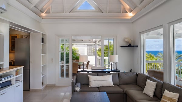 Located only a few steps away from the beautiful Flamands beach, the charming vacation rental Art offers a splendid view over the ocean, the beach and the surrounding islands. Located in the private domain of Roc Flamands, the property is built on two levels and features comfortable and modern spaces, in an architecture in perfect harmony with nature and tropical vegetation. On the first floor, the bright, fully glazed and air-conditioned living room features modern and comfortable furniture with a large sofa covered with cushions and a coffee table under a mansard ceiling providing a pleasant sense of volume. The kitchen is well equipped for meals preparation that can be enjoyed under the covered terrace with a large dining table in rattan and glass for six guests. A space with high stools welcomes you next to the gas barbecue for delightful gastronomic evenings. A little further along this outdoor gallery facing the view, there is a lovely space perfect for talking comfortably installed in the outdoor lounge. Take a few steps below via the indoor or outdoor staircase, and you’ll find the magnificent terrace with a fantastic view over Flamands Beach and the ocean. The large heated lagoon-coloured swimming pool is surrounded by lounge chairs for relaxing moments. Coming with wooden floor and garden furniture, this terrace is a true dream place in the heart of a green and lush environment. On the lower level of villa Art, three beautiful air-conditioned rooms welcome you for a stay with family or friends in St. Barths. All three have a king-size bed that can be converted into twin beds upon request. The first bedroom has its own private bathroom while the other two share a comfortable one with double sinks and rain shower. The clean and bright decoration creates a quiet and serene atmosphere for your stay in Saint-Barthelemy.