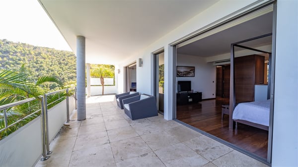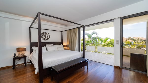 Built on the hills of Flamands, the sumptuous rental villa Matajagui offers a high range of services in a refined and modern atmosphere. Located only a few steps away from the Flamands beach, this charming property is built over two storeys and has an open-air and sleek design, making it the ideal place for unforgettable holidays in St-Barths. As soon as you get in the house, you will be mesmerized by the sweeping view over the ocean and the island of Bonhomme. Everything melds nicely in a perfect harmony of elements between indoor and outdoor spaces. The light and uncluttered decoration lets your mind escape for a total change of scenery in St-Barthelemy. The living room furnished with comfortable white leather sofas faces the terrace and the pool, overlooking the Flamands Bay. This large room entirely opens onto the outside, in the gentle trade winds. This is also the perfect place to enjoy a movie or just relax in the couches. The contemporary and well-equipped kitchen has a bar through which you can have breakfast under the covered terrace, a few steps from the pool. Outside, the large terrace gracefully merges with the indoor living room. The dining room can accommodate up to six guests around a woven fibre table, facing the panorama of Flamands Bay and the neighbouring islands. In the heart of the hills, the Saint-Barth wooded landscape is stunningly beautiful. At the front, there is a splendid heated infinity swimming pool for delicious moments of swimming and relaxing. You’ll also enjoy the outdoor living room on the gallery, as well as the lounge chairs lined up on the terrace along the white walls of this contemporary vacation home, facing the horizon. Ideal for a family or two couples travelling together, the rental villa Matajagui has two beautiful air-conditioned bedrooms located on the lower level of the villa. Each room has a king-size four-poster bed, a private bathroom and a stunning ocean view. Dark wood, cream-coloured textiles, selected objects, soft cushions: the atmosphere of the rooms is elegant and cozy. A well-equipped fitness room is also at your disposal whenever you wish to do some exercises. The nearby road may sometimes make villa Matajagui a noisy place.