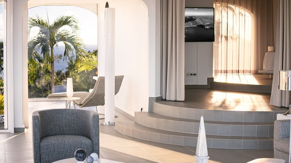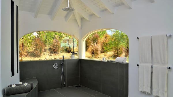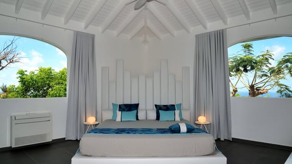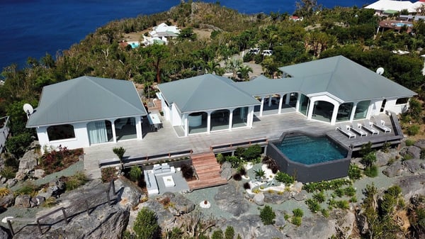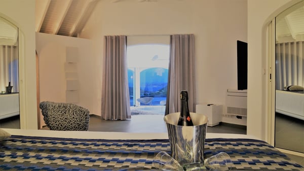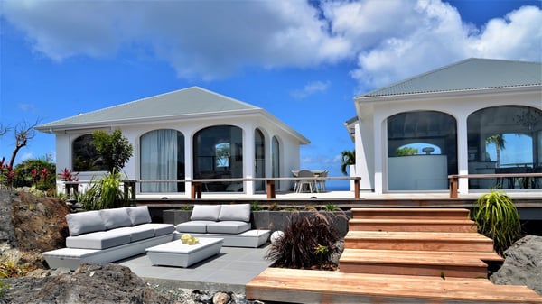 Located at the top of Colombier Hill, the luxurious vacation rental Byzance is an outstanding property opening onto a spectacular view over the ocean and the green landscapes of St-Barthelemy. In an ancient Greek striking white decor coming with columns and hand-painted frescoes, the atmosphere is most peaceful and quiet. This luxury property in Saint Barths is built on one level in front of the panoramic view, with large windows opening onto the terrace letting the mild air of St. Barths blow in. The living room is composed of a comfortable sofa and armchairs around a coffee table in the sleek and contemporary style of Villa Byzance. The dining room welcomes guests around a beautiful glass table with comfortable chairs under a beautiful modern hanging light and a vaulted white ceiling. The kitchen is very spacious and well-equipped to cook delicious meals to be enjoyed facing the ocean and the bay of Petite Anse, the island of Bonhomme and the horizon. Outside, there is a large sunny terrace with a beautiful swimming pool and a jacuzzi in front of a stunning ocean view. This is the very best place to enjoy the sumptuous sunrises and sunsets of St. Barths, as a marvellous glowing show. Sun loungers are set up for pleasant relaxing sessions in the quiet. There is also another small terrace very well furnished with sofas and a coffee table perfect for talking and relaxing in front of the unforgettable view in the trade winds gently blowing. The vegetal environment provides a fresh and lovely touch to the whole, with white flowers, cacti and rocky areas also bringing a mineral character. The vacation villa Byzance is ideal for two couples travelling together. There are two beautiful air-conditioned bedrooms located on either side of the living room for utmost privacy. Each bedroom has a king-size bed, a comfortable sitting area and an en-suite bathroom. You will be charmed by the sense of space and volume created in these night spaces, in perfect harmony with the quiet you’re looking for for your next vacation in Saint Barths.