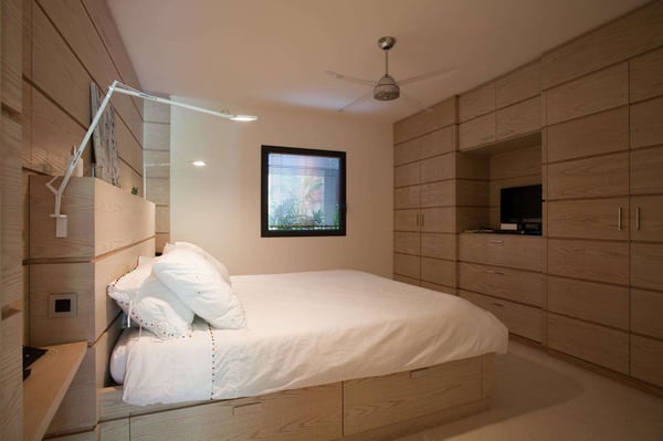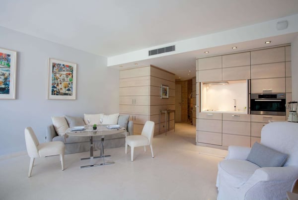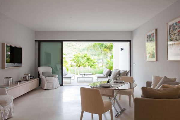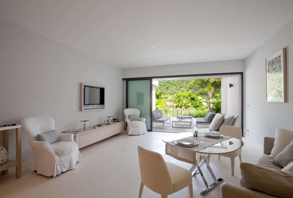 Apartment Camille is a modern 1-bedroom apartment located in Gustavia within a short walk of the beach and shopping. Surrounded by lush vegetation, this apartment has indoor and outdoor living areas furnished with sofas and chairs. The indoor living area opens to a small, well-equipped kitchen area, which is perfect for preparing light meals to be served outdoors on the terrace or at the indoor dining table, which seats two guests. The bedroom has a queen-sized bed and built-in closets with drawers, maximizing the use of the well-designed space. The bathroom, which is designed with clean lines and a soft tone, has an open rain shower with a built-in shower seat. The fully air-conditioned house also comes with WiFi and French satellite TV. Apartment Camille comes with house cleaning services six days a week, except on holidays. This villa does not permit children