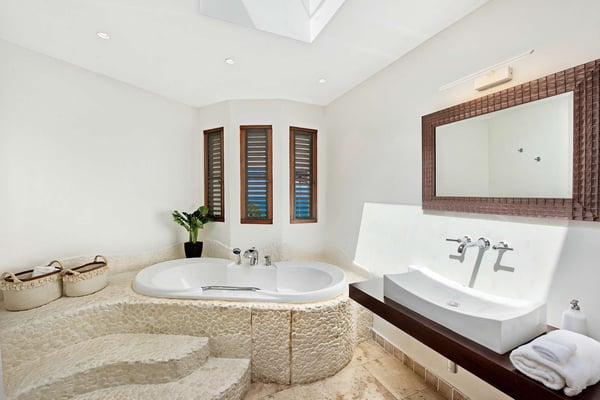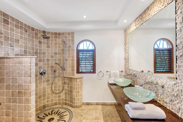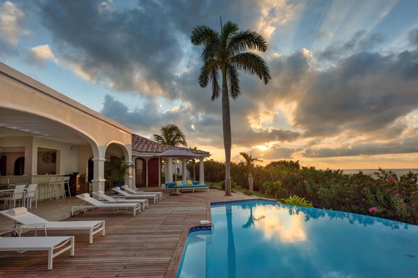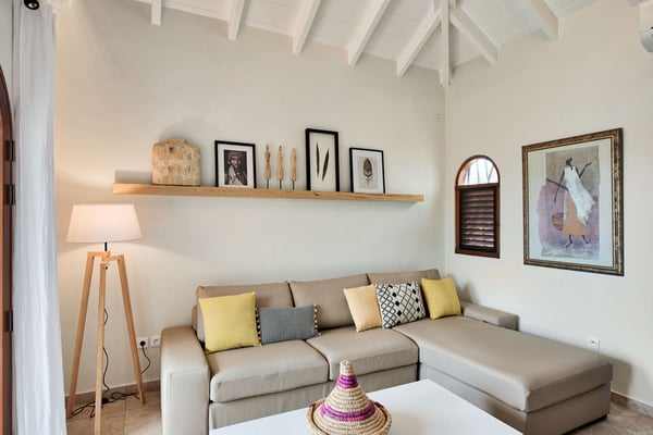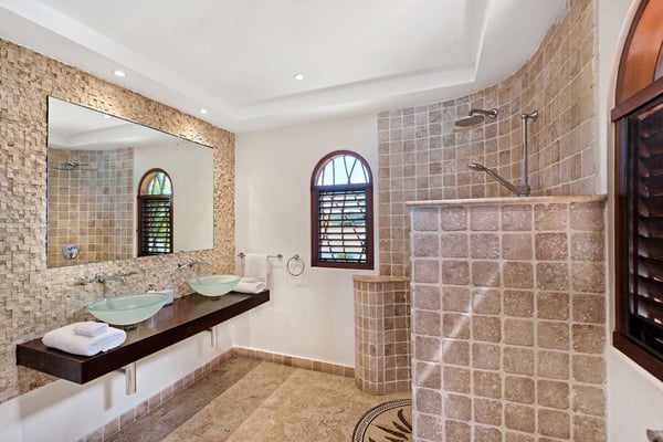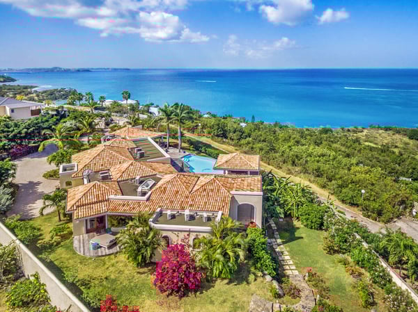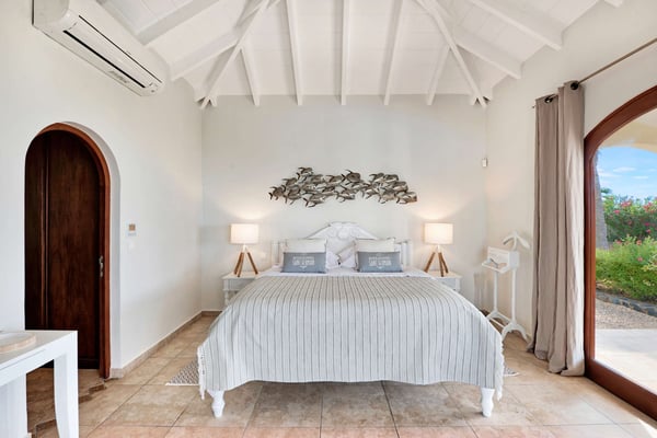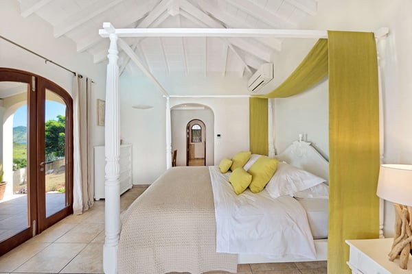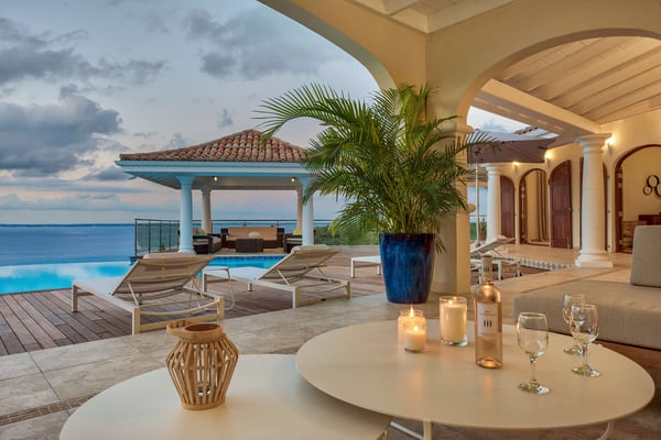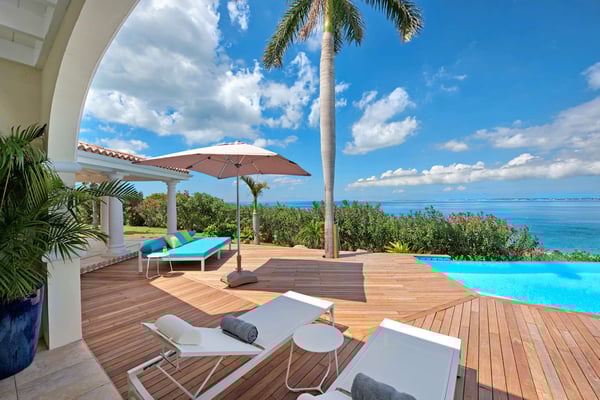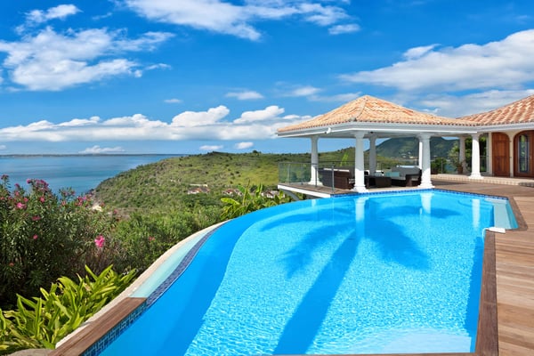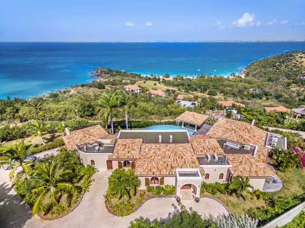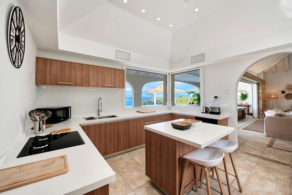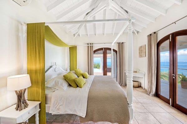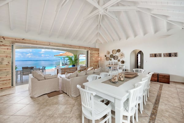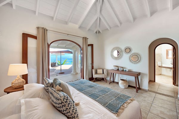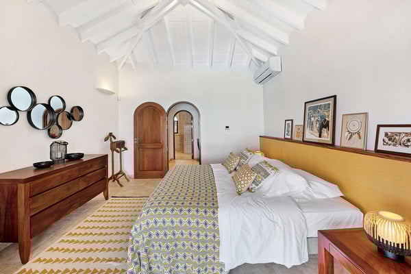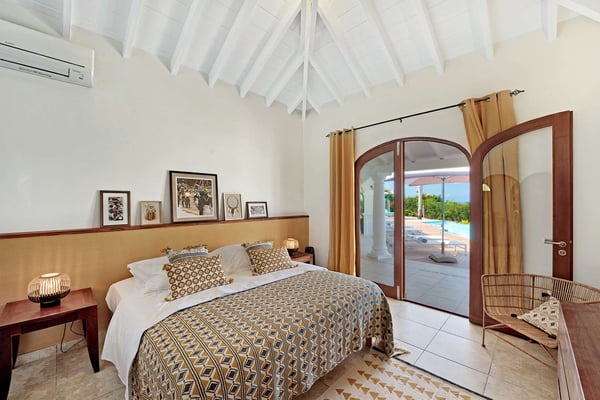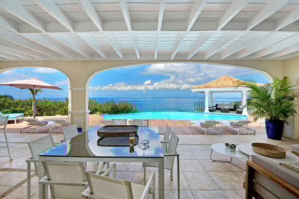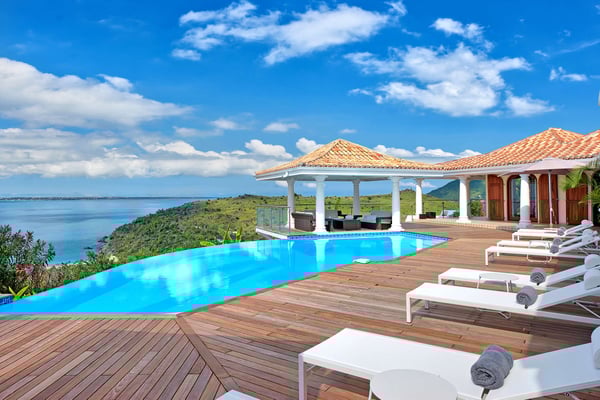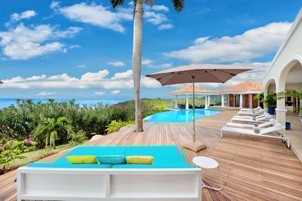 Near the Caribbean's gourmet paradise - Grand Case - sits the exclusive, very private enclave of Mont Choisy, home to the stylish Happy Bay Villa. The home's elegant entrance, with lush tropical gardens and stunning native boulders, creates an inviting stage for this classic French Creole home dressed in soft yellows and trimmed with elegant dark wood details. Entering the villa, the stunning panoramic views dazzle with a brilliant sweep of tropical green mountains and endless blue sea and sky. Anguilla is on the horizon. Just below the deck, you see waves crashing on the beach. Surrounding the villa are colourful gardens filled with tropical flowers as well as papaya and banana trees. The blue endless heated pool connects the amazing view to the villa. The spacious horseshoe-shaped epi wood terrace is filled with outdoor dining and seating to enjoy the view and wonderful breezes. Little seating niches and a large covered gazebo offer quiet places to relax. The interior great room, with spaces for seating and dining, is fully air-conditioned or open fully to the tropical breeze. Floor-to-ceiling glass doors bring in the view. Travertine floors run throughout the interiors. The recently renovated decor has an open and airy attitude in a mix of contemporary and exotic furnishings and accessories in teak woods and soft taupe and cream colours. The modern, fully equipped kitchen, open to the view, is tastefully designed in glass tiles, stainless steel appliances and grey with pops of colour. A fully equipped gym with a bathroom is located on the lower garden level. The four bedrooms, with en-suite bathrooms, are off the main salon and under one roof. Each has interior and exterior doors for access to the pool, a small office/workspace and fabulous sea views. Three bedrooms are accessible off a large media room with a flat-screen TV, perfect for teenagers or kids to share this wing of the villa. The primary bedroom, located on the opposite side of the villa, is its own private oasis. Private for some, but still connected, given all bedrooms are under the same roof and all accessible from the inside. Each bathroom is uniquely designed in interesting mixes of materials and stylish fixture,s plus they are fully air-conditioned. Although secluded, Frair's Bay and Happy Bay beaches are steps away. A three-minute drive takes you to the charming town of Grand Case, filled with fabulous restaurants, plus the Hope Estate area with a terrific French grocery store and Bacchus, one of the island's best restaurants and wine merchants. SXM Music Festival: Please note that at the beginning of March each year (exact dates TBD), there is an Electronic Music Festival on Happy Bay beach. There will be loud noise pollution during this time. Check the dates of the festival prior to booking if this is not something you're looking for in your SXM vacation experience.
