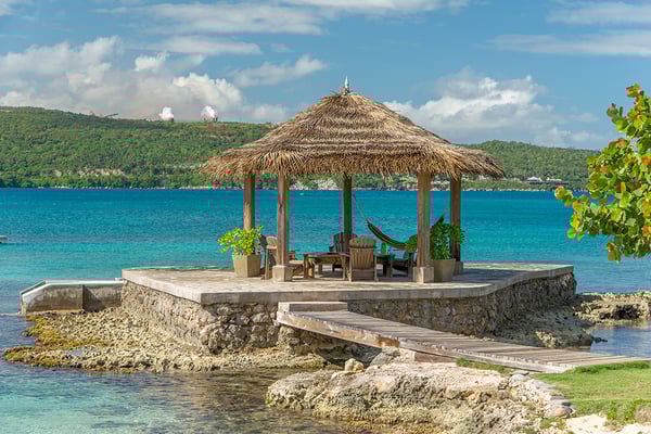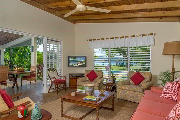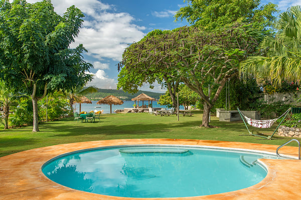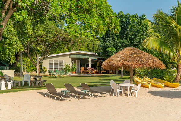This three-bedroom casual cottage shares a delightful waterfront site with its neighbouring Villa, on the clear waters of Discovery Bay. Linga-Awile sits on a lovely, long, large lawn. Beyond the lawn and swimming pool is its sugary white sand beach with two thatched-roof umbrellas for shade. Interiors have been designed for put-your-feet-up comfort. The feeling is an at-home, informal, easy lifestyle. Meals are served inside, on an open-air patio, or on picnic tables at the beach. The cook will plan torchlight beach parties with chicken, chops, steaks, lobster, or fresh fish served sizzling from the outdoor grill. Linga Awile has its own pool, outdoor barbecue grill, and seaside rinse-off shower. Kayaks are complimentary. Other water toys include a swim-up deck and a floating bar. More water sports are available just a few minutes’ drive away. In lively Ocho Rios 30 minutes from Linga Awile are night life, excellent restaurants, shops, open-air craft markets, clubs where guests may purchase day passes, more water sports, Prospect Plantation Great House, rafting on the Martha Brae, jitney tours of a working plantation, dramatic Dunn’s River Falls, and Dolphin Cove where guests may swim with the dolphins (reservations required).