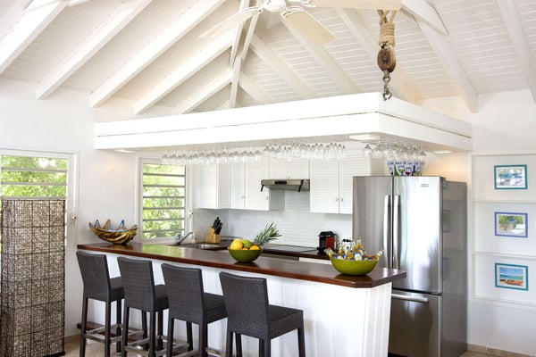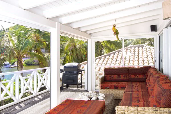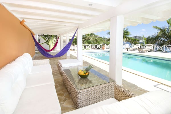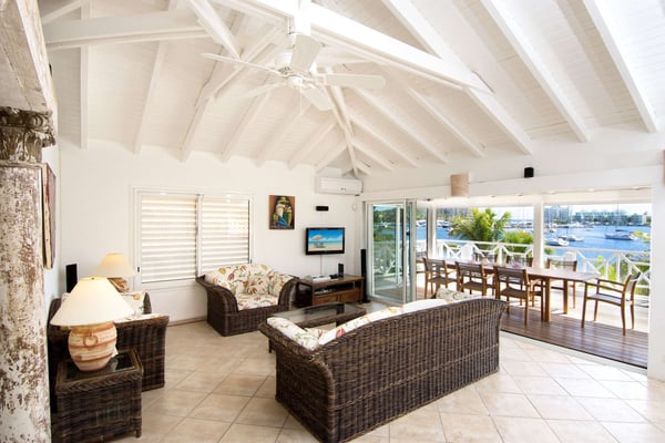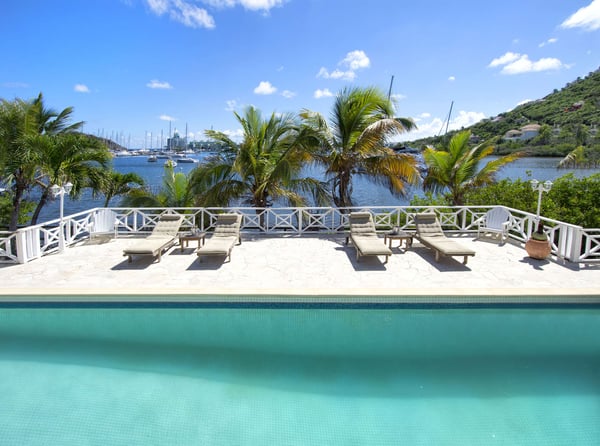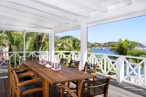 Villa Coralita is situated right in the exclusive French Oyster Pond. This waterfront villa offers maximum privacy, and classic comfort with a superb view of the sailing yachts and the island of St. Barths in the distance. Villa Coralita is a blend of contemporary Creole and timeless Mediterranean style, built on several levels with four independent bedrooms and en suite bathrooms. The entrance opens to the elegant living and dining areas, flanked by an open-plan kitchen and enhanced by lofty ceilings. Sliding doors open out to the half-open sun deck perched above the 40-foot swimming pool and lower sundeck. Via the pool area, you can reach the private boat dock. On one side of this villa is the primary suite, adorned with a romantic bed, an enclosed bedroom for a baby, an en suite bathroom, and a private balcony. The other side offers three independent bedrooms with en suite bathrooms, each with a private balcony. All bedrooms are fully air-conditioned. For your indoor entertainment are satellite televisions, a DVD player, a stereo system, and a high-speed wireless internet connection. Extras include a daily maid except on Sunday and a safe for valuables. Villa Coralita is an ideal bayside villa where you can escape from the busy pace of city life and enjoy the quietness, sipping an afternoon tropical cocktail on your own dock.
