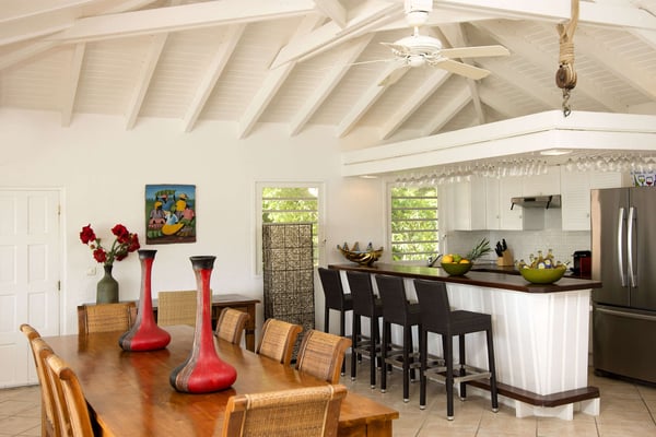 Property needs a little work, but overall a great place to stay. The view is amazing, the entire upper living are opens to the deck with full length glass doors creating a space you never want to leave. The pool is huge and deep, and the surrounding deck has multiple, very comfortable sitting areas in sun or shade any time of the day. A large, new boat dock right on Oyster Pond. Paul the property manager is very attentive to every need or issue and Norma the housekeeper does a great job keeping the place clean. This is the second time we’ve stayed at this villa and it will not be the last.