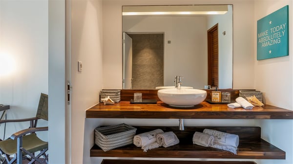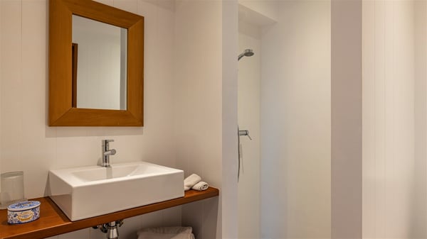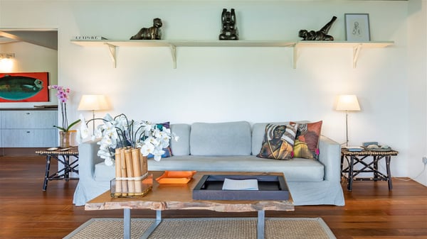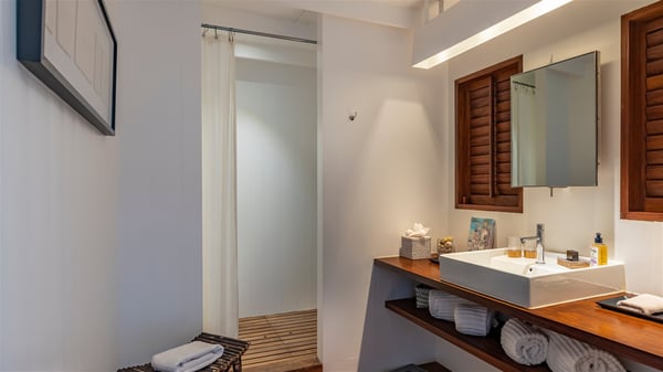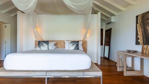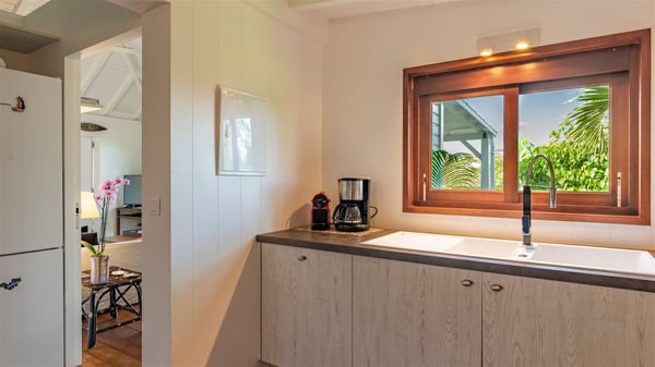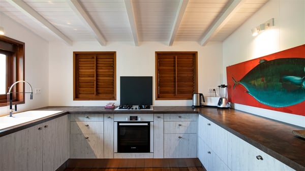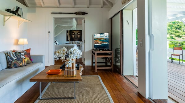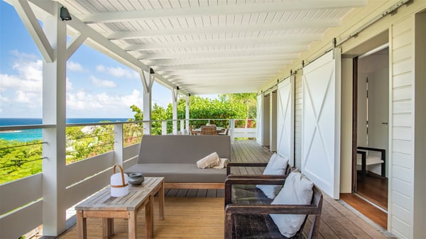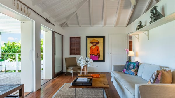 Overlooking Marigot Bay, the charming rental villa Marigot Bay welcomes you for an idyllic vacation in St Barths in a chic and contemporary decoration by the designer Christian Liaigre. Only a few minutes walk from the beach, this holiday home is ideal for a family or for a group of friends right in the heart of the island's beauty. The large and airy living room opens onto the terrace with a breathtaking view over Marigot Bay and the hills of Mont-Jean. Furnished with a sofa and wooden tables in a refined ethnic spirit, the great room is the perfect place for talking, reading or having a rest, while the island's soft breeze blows through the windows. A large recently renovated kitchen is perfectly equipped for the preparation of your gourmet meals or small snacks and offers a beautiful view of the ocean. On the covered terrace, there is a beautiful dining area with a wooden table for your meals. In the extension, as it faces the view over the bay, the outdoor living space is furnished with benches, deckchairs and armchairs in front of the amazing panorama. A lovely swimming pool is located at the front of the wooden terrace, for cool moments at any time of the day or the evening, under the St Barth starry sky. Perfect for a family or for friends travelling together, the vacation home Marigot Bay has three beautiful and comfortable air-conditioned rooms, all with their own private bathrooms. Two of them are furnished with a king bed, and the third one has a queen bed. Two bedrooms are located on the main level on either side of the living room, while the third one can be reached by a relatively steep staircase, and may not be suitable for everyone. You'll enjoy getting back to this cozy cocoon with its linen and wood-inspired decorated bedrooms after beautiful days out discovering the nature and beauty of St Barths. The charming villa Marigot Bay can be rented with a sister home called Teora located below and decorated by the same designer.