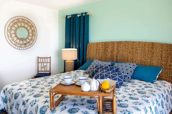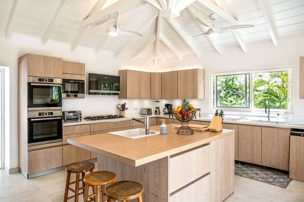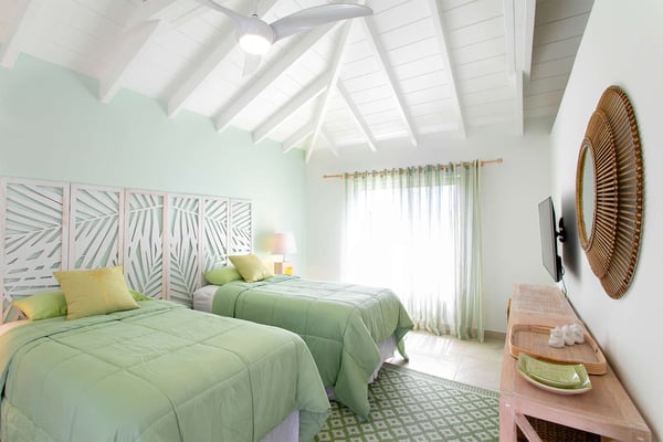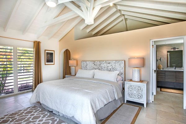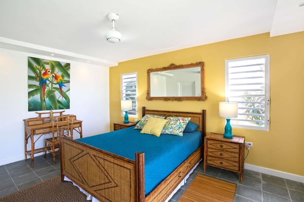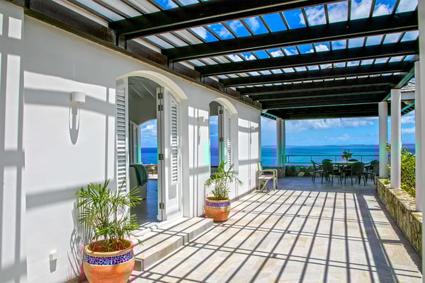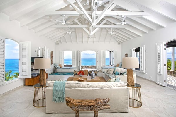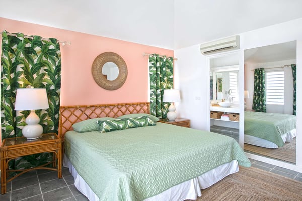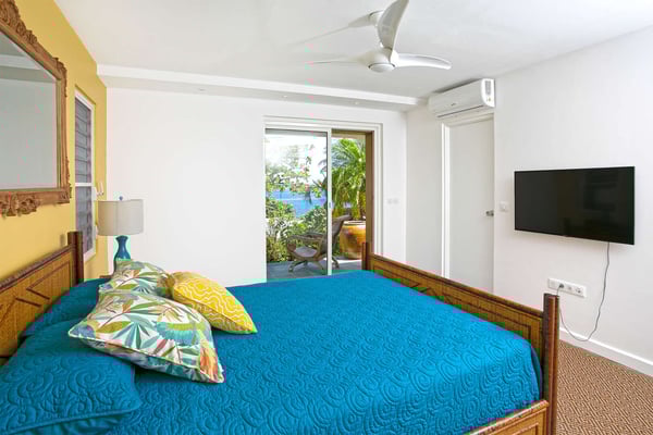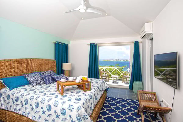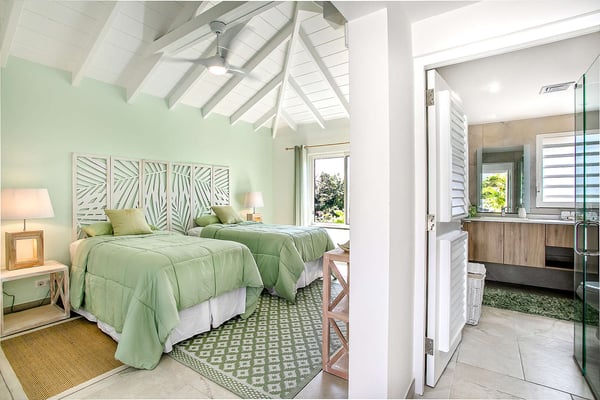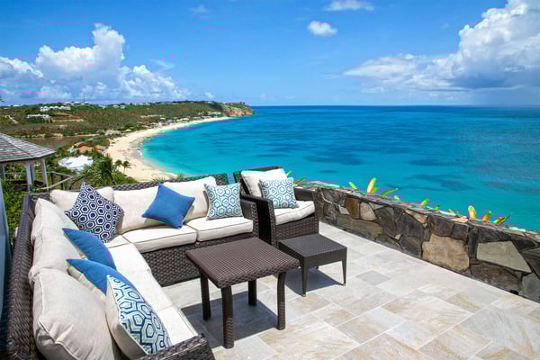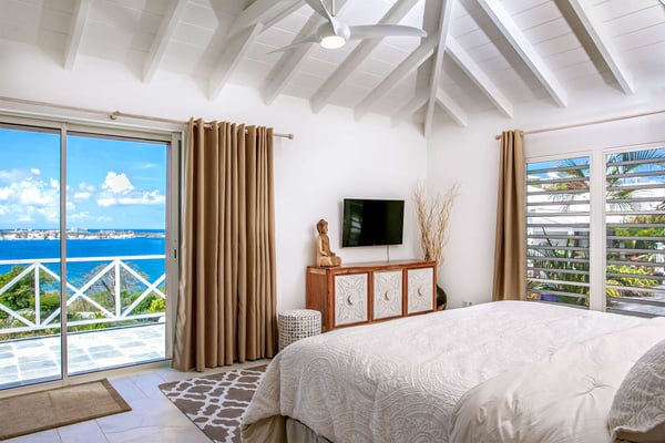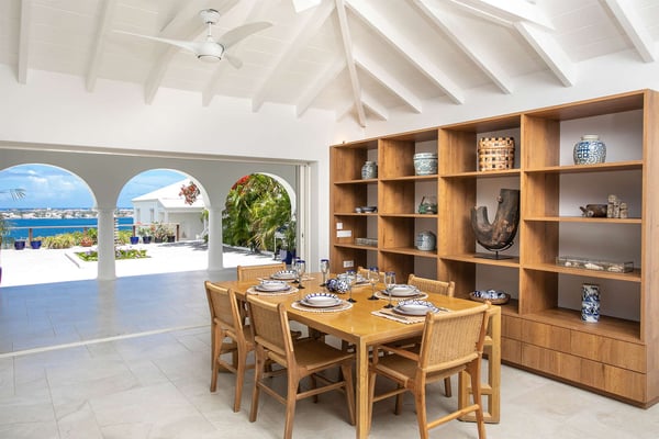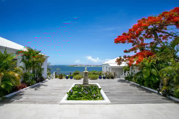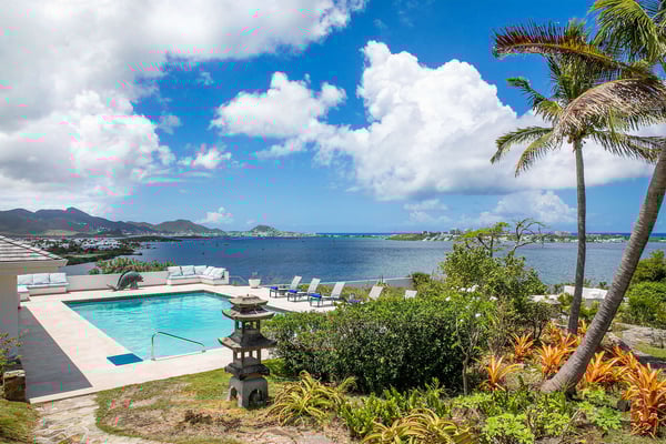 In perhaps one of French St Martin's most beautiful locations, Libellule - The Dragonfly - is an idyllic five-bedroom home sitting high on a promontory in Terres Basses nestled between the Caribbean Sea and the scenic Simpson Bay Lagoon. Situated on five acres of elevated beachfront, Libellule enjoys complete privacy while providing direct access, via a private pathway, to the pristine beach of Baie Rouge. A gently sloping driveway from the gated entrance passes through abundant tropical gardens flanked by a staggering water view over the lagoon and leads up to the main entrance and the glittering view of the Caribbean Sea. To the right of the ascending driveway is the pool house with an impressive pool overlooking the lagoon and the beautiful Caribbean sunsets. There is a covered wet bar with a refrigerator, a surround sound system, and a bathroom with a shower. A lovely fountain courtyard greets you at the main entrance, and an arched opening leads through to Libellule's huge high-ceiling living area lined with traditional Caribbean shutters. A wonderful respite from the daytime heat, this lovely room features cool limestone flooring, several ceiling fans, comfortable seating, and a dining area, and benefits from the cooling trade winds that blow off the sea. At the far end, shuttered doors open to a fabulous seafront terrace with the spectacular backdrop of the Caribbean and the island of Anguilla in the distance. The terrace provides a comfortable lounging area and a covered patio for al fresco dining. Leading off the living area is a large and welcoming kitchen with light wood cabinetry, a central island, double sinks, and Bosch appliances including two large refrigerators, an oven and a microwave, and a Siemens gas cooktop. A stone pathway lined with cashew trees leads from the kitchen to a delightful octagonal breakfast gazebo overlooking the sea and the beach of Baie Rouge just below. Each of the five bedrooms, independent from the main living areas, is accessed from the exterior and follows the natural slope of the property. Two bedrooms are situated on the main level and are accessed from the courtyard, including the brand new primary bedroom with its relaxing beige and white decor, ample closet space, and its own terrace overlooking the lagoon and gardens. The en-suite bathroom features a glass-walled shower, double vanities, and a separate toilet and bidet. Next to the primary is a twin bedroom and en-suite bathroom decorated in cool mint green and overlooking the garden. A few steps down from the main level are two further bedrooms, both with king-size beds, one featuring a colorful jungle decor and the other a marine blue and seashell theme. Both rooms have small terraces and walk-in closets, and en-suite bathrooms with slate grey tiled open showers. The final fifth bedroom is on a lower level and has a king-size bed, a terrace overlooking the garden, and an en-suite bathroom with an open shower. All five bedrooms are air-conditioned and have ceiling fans and Smart TVs. Libellule is ideal for groups of friends traveling together or for families with older children. The villa is conveniently located within the exclusive residential enclave of Terres Basses in French St Martin and is close to restaurants, a gourmet French bakery, and a grocery store on the French side. The casino and bars of the village of Maho and the restaurants of Porto Cupecoy are just across the border on the Dutch side of Sint Maarten and an easy ten-minute drive. The Princess Juliana International Airport, also on the Dutch side of the island, is just a short fifteen-minute drive from the villa.
