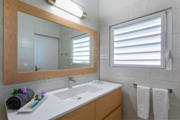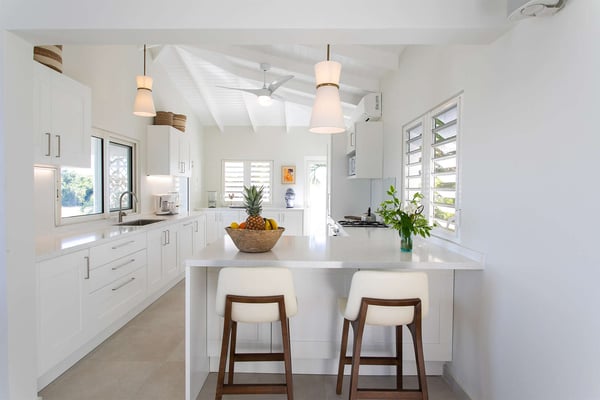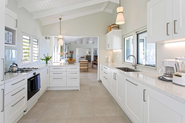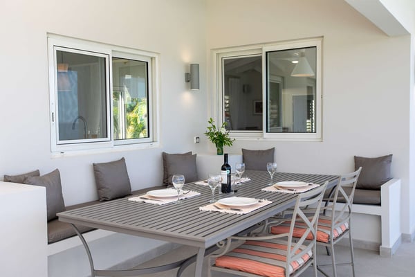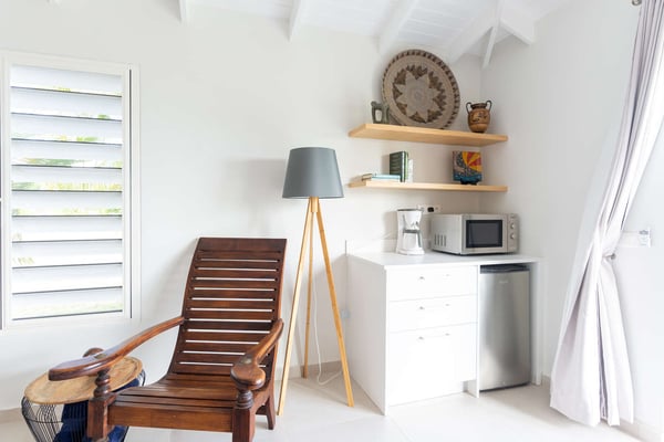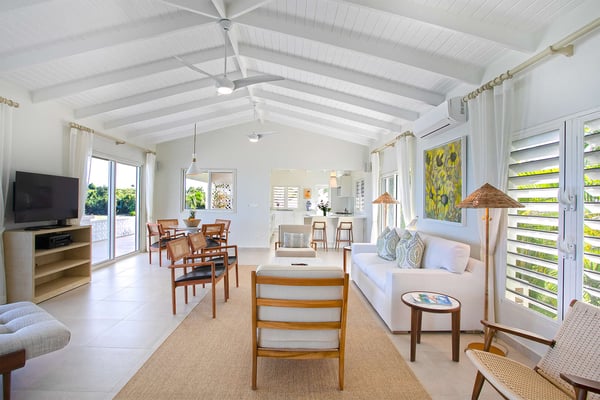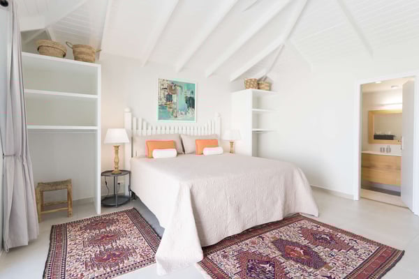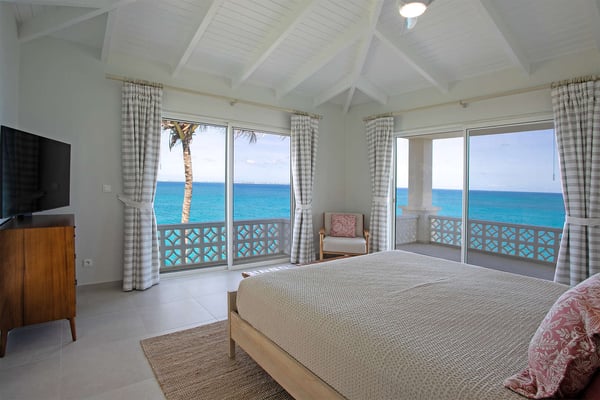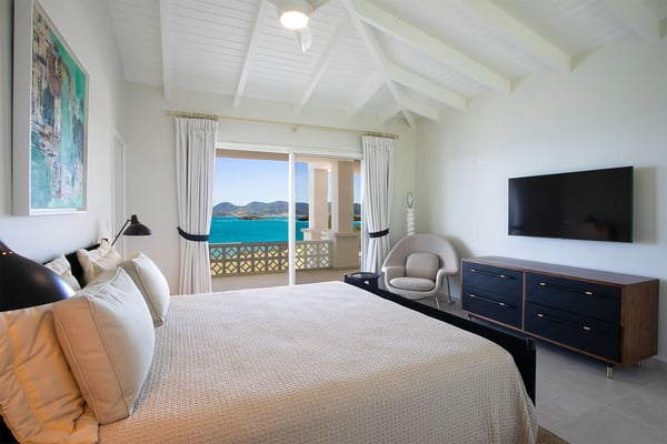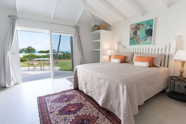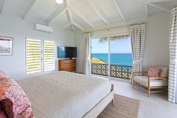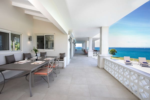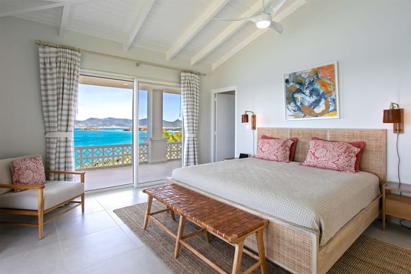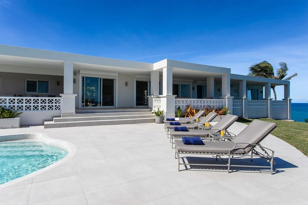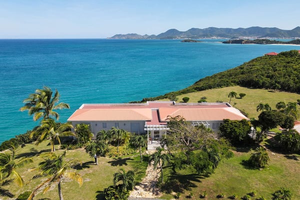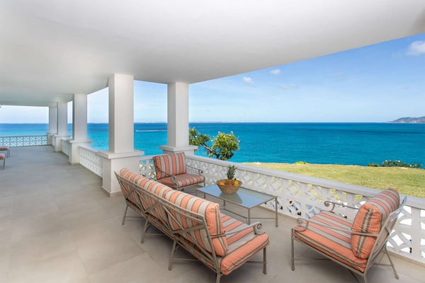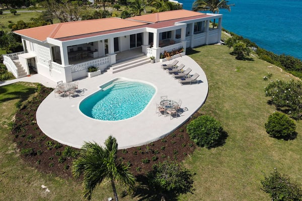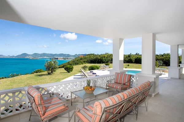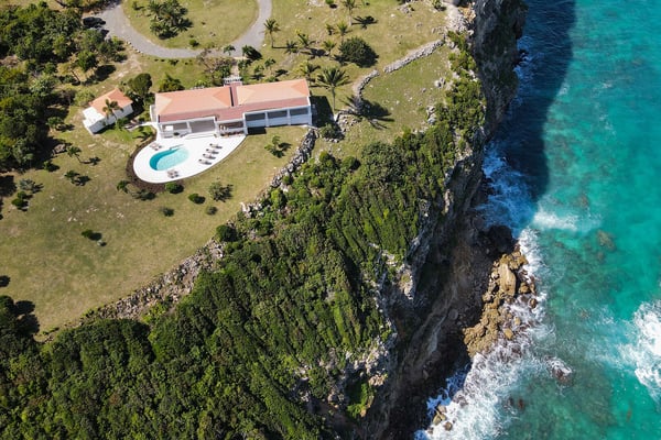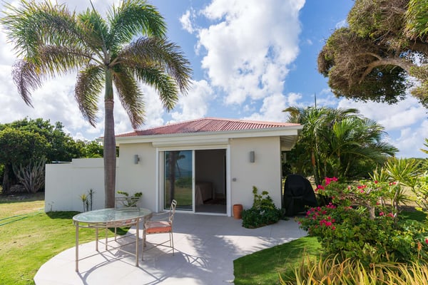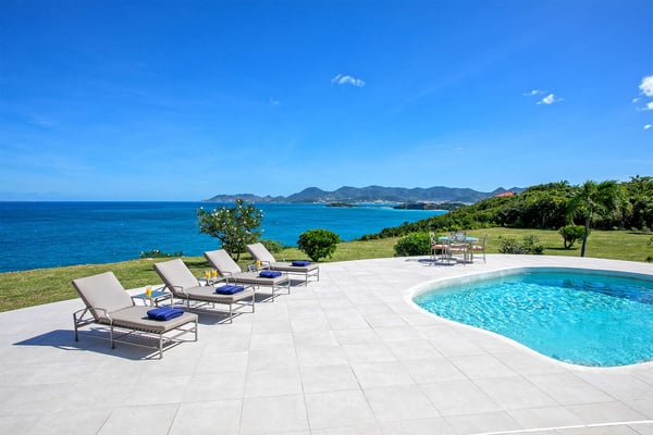 From its dramatic cliff-top location, on the northern coastline of French St. Martin in Terres Basses, villa Falaise des Oiseaux enjoys sublime water views across the ocean to the neighboring island of Anguilla on the distant horizon. Just recently completely refurbished this lovely three-bedroom home sits on nearly five acres of land in total privacy and offers a private pool, three king-size bedrooms with en-suite baths, and an open-plan living room and kitchen. A veranda running the entire length of the property enjoys incredible 180° views over the ocean and provides covered areas for outside living and dining. Steps lead down to a sun terrace with a free-form pool and comfortable lounge chairs and further areas for outside dining. Large glass sliding doors open from the veranda into an open-plan and light-filled interior space comprising a living room with natural wood and white linen furnishings and a pristine, brand-new kitchen with white cabinetry, stainless steel appliances, and marble countertops. Two bedrooms can be accessed from the living room or from the veranda and offer spectacular water views. The third bedroom is located in its own private cottage with a mini kitchen. All rooms feature relaxing neutral decor, widescreen TVs, and brand-new en-suite bathrooms with glass-surround rain showers. Villa Falaise des Oiseaux offers complete privacy in a beautiful and tranquil setting and is just a 10-minute walk away from the lovely natural beach of Plum Bay. The village of Cupecoy in Dutch St. Maarten, for restaurants and grocery shopping, is just a 10-minute drive from the villa.