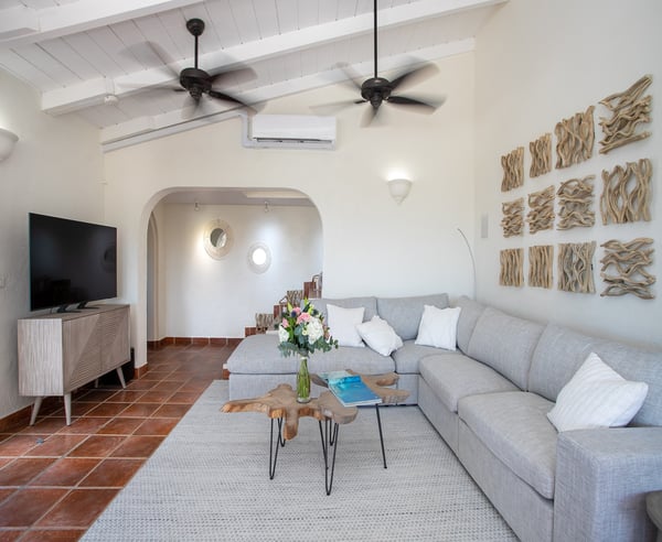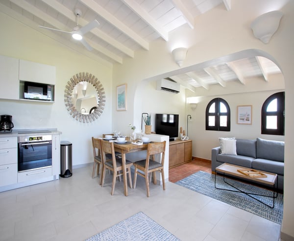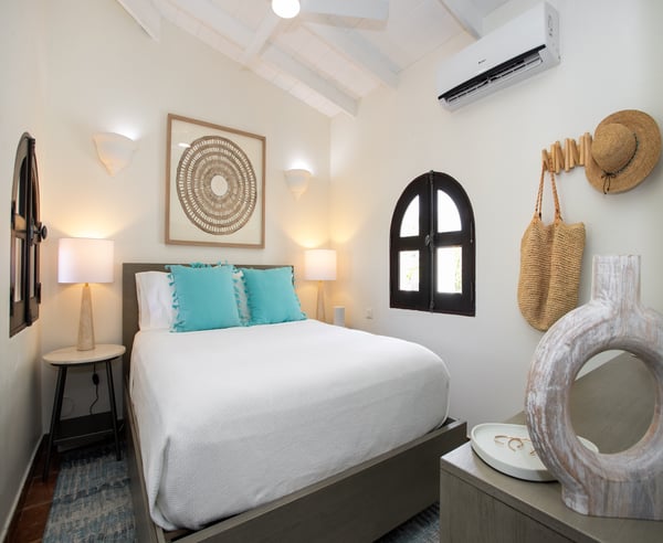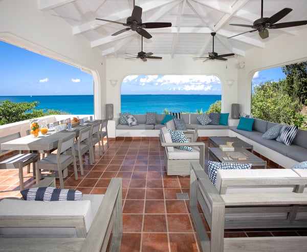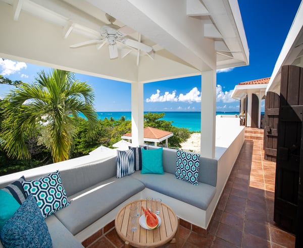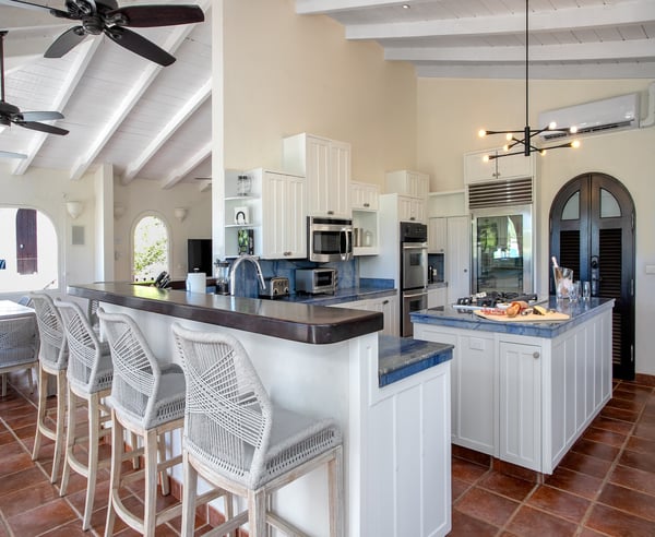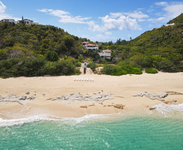 Villa Joie de Vivre is located directly on Baie Rouge beach, one of the most prestigious and serene beaches in French Saint Martin. This exceptionally private villa overlooks four secure acres surrounded by tropical gardens and endless breathtaking views of the ocean. Villa Joie de Vivre is a fully air-conditioned, multi-level villa that has been completely refurbished inside and out for 2024 with a modern coastal aesthetic to complement its Mediterranean architecture. The main living area is comprised of an open-plan living and dining area with a fully-equipped kitchen featuring stainless steel appliances, a gas range, a wine fridge, and a coffee/espresso bar. Step outside to enjoy one of the three covered gazebos for alfresco dining or lounging on one of the multiple plush seating options while enjoying scenic views at every turn of the Caribbean Sea and Anguilla. Ideal for a group of friends or family, you are sure to be happy with whichever of the king-size bedrooms you select. Each has a balcony, walk-in closets, safes, and its own en suite bathroom with double vanities and oversized showers. Wake up refreshed in the villa’s Heavenly® Beds, complete with luxurious linens and pillows. One bedroom also features a sleeper sofa and two rooms have desks. All bedrooms and bathrooms have 110v/220v 60Hz outlets with USB connections. Renovated in 2025, the newly added fourth bedroom is a beautifully remodelled 500-square-foot cottage, located just 150 yards from the main house. This standalone guest house has been completely transformed in the same contemporary style as the villa. Inside, you'll find a queen-size bed, an en-suite bathroom, a kitchen equipped with modern appliances, and a cozy living room with a sofa bed—ideal for a couple and a small child. Adding to its charm, the front porch offers stunning ocean views, while the back sundeck overlooks the tranquil waters of Simpson Bay, creating the perfect setting to relax and unwind. One of the main attractions of Villa Joie de Vivre is its direct access to the very peaceful and secluded Baie Rouge beach. The villa is perfect for those who want to be right on the beach while maintaining their privacy. Guests can snorkel in the calm waters or sunbathe on the provided chaise lounges, then slip back through their private locked gate to relax in the hot tub. The property’s other centerpiece is the pool deck with its 18’ x 35’ heated saltwater pool, lined by double sunbeds, a shaded gazebo lounge, BBQ area with a fridge and bathroom. Guests can stay connected with the Villa Joie de Vivre’s interior and exterior high-speed wireless internet, relax to music via the zoned Sonos speaker system throughout, or binge their favorite show on smart TVs provided in the kitchen, living room, and all bedrooms. Unwind by playing one of the well stocked board games or singing a favorite song on the portable karaoke machine. Baby monitors and an AED defibrillator are also located onsite. There are many ways to experience the “joy of living” at Villa Joie de Vivre. Skip the airport or ferry and have a helicopter pick you up directly in the backyard to fly you within minutes to St. Barths for lunch or Anguilla for a round of golf. The expansive grounds make it an ideal setting to accommodate a glamorous wedding reception after you walk down the aisle on the beach. Or perhaps you are a land-lover seeking a break from a boat charter, where you can easily tender back and forth from your yacht via the beach.