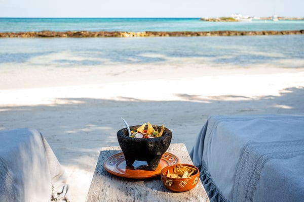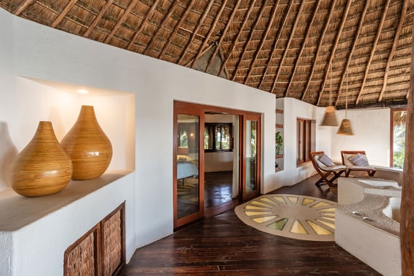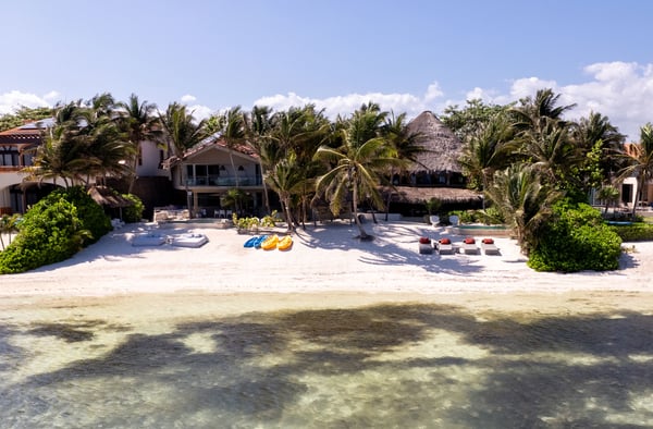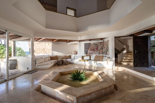 Welcome to one of the finest estates in Mexico. This coupling of villas is located in the world-class residential community of Puerto Aventuras. Known for its award-winning architecture and beautiful Caribbean ocean views, this is the perfect place to relax in a hammock under the lush palm trees that surround the two swimming pools. Originally two separate villas, Casa del Agua and Zacil Na have been combined to cater to larger groups. No need to worry about organizing a trip to town for dinner, just let the on-site chef cater to your taste and serve you at leisure. Or perhaps the barman can shake up some sunset cocktails. Puerto Estate's staff will cater to your every need. The only difficult choice will be where to relax, be it the incredible three-way infinity pool or settling into the big round sofas on the terrace. Either way you will always be able to enjoy stunning views over the turquoise waters. Located just 45 minutes south of Cancun's international airport and in the heart of the Yucatan's majestic archaeological sites and natural parks. Just five minutes walking distance to the village of Puerto Aventuras and its world-class marina. Peurto Estate is secluded; yet is ideal for those who enjoy golf, deep sea fishing, scuba diving, fitness activities, and shopping conveniently within one resort. A few more nearby sites of interest include Playa del Carmen, Tulum, Xcaret, and Cozumel.
