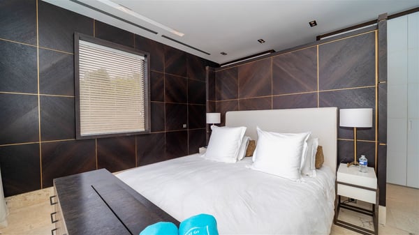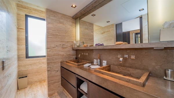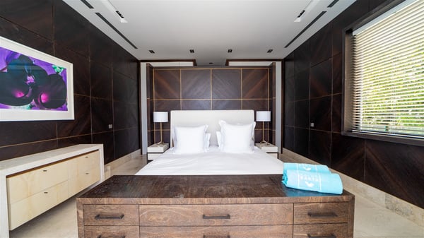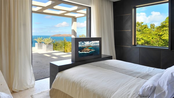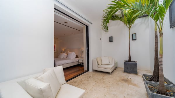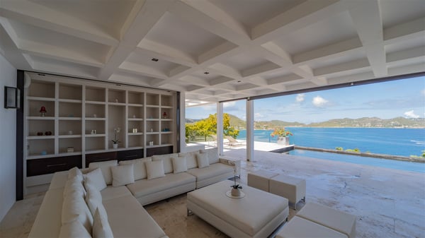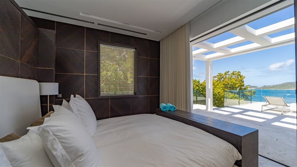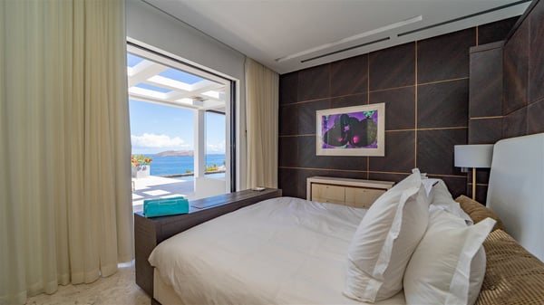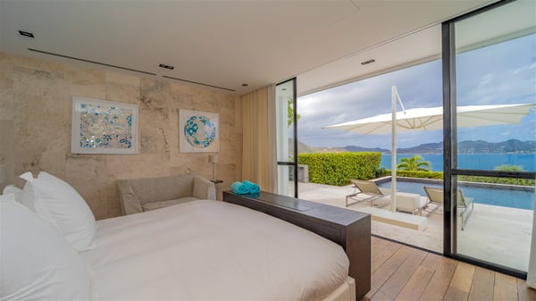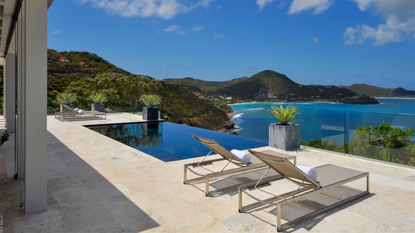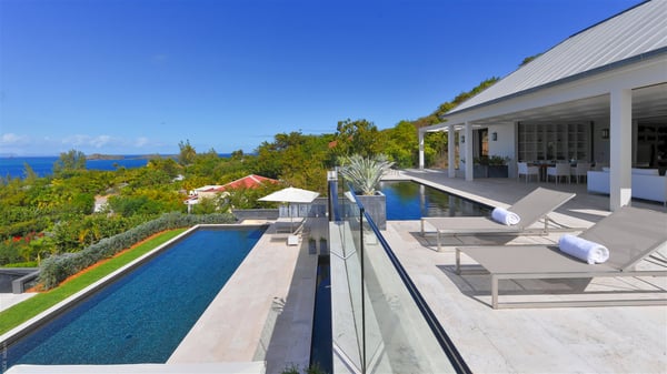 Villa La Petite Sereine is a sumptuous five-bedroom property ideally located in Pointe-Milou. A panoramic view over the ocean and the glowing sunsets make this luxurious house with two swimming pools an outstanding place for a fantastic stay in St-Barths. Built over two levels, La Petite Sereine is a most finely decorated contemporary-style villa. The air-conditioned living room is composed of a large lounge with a gray and beige sofa, and is extended by a second lounge open onto the terrace furnished with wide, striking white sofas. The dining room which can accommodate ten guests is also located in this bright space with a splendid view over the infinity pool and the ocean. The kitchen is well equipped to cook meals and cocktails or to call upon a private chef for any event. A terrace with an outdoor kitchen is also available at the back of the villa, on the hillside. The terrace offers a fabulous view over the ocean and St. Barths’ nature. On the main level, the infinity swimming pool looks like the deep blue Caribbean waters, which you will love watching from the deckchairs around the pool. This is the perfect place to admire the sunsets as the sky glows with golden lights. A second swimming pool is located on the lower level in front of two of the villa's five bedrooms, which can be accessed via an exterior staircase. This lovely second pool is surrounded by sunbathing areas shaded by cream-colored umbrellas, in the utmost quiet. La Petite Sereine consists of five air-conditioned bedrooms with en-suite bathrooms. They are all furnished with queen size beds and open onto the terrace with views over the ocean or the vegetation. Three of them are on the main level, while the other two ones are connected and are located on the lower level with direct access to the second pool. Office areas and a tasteful decoration make these bedrooms true havens of peace where you will love resting at any time. In front of a splendid view over the ocean and the sunsets, La Petite Sereine is the privileged place for an unforgettable vacation in St-Barths.