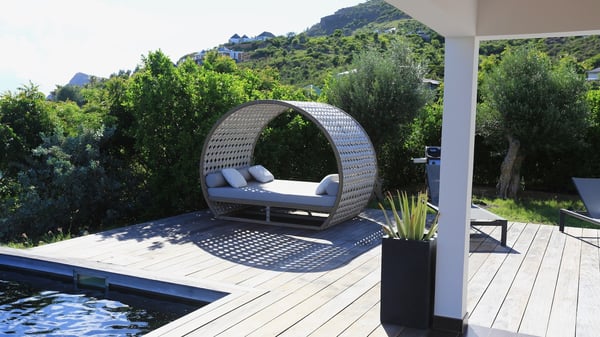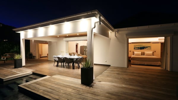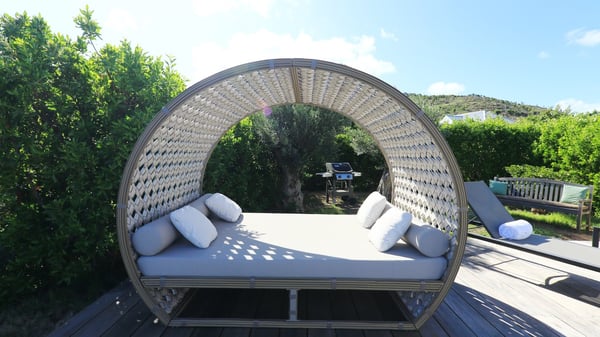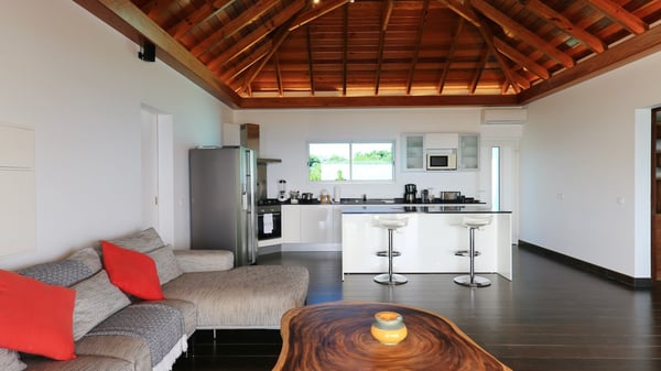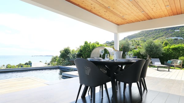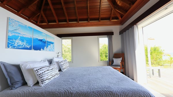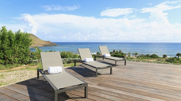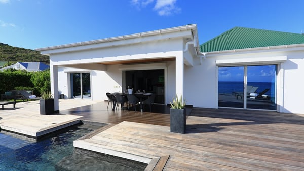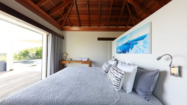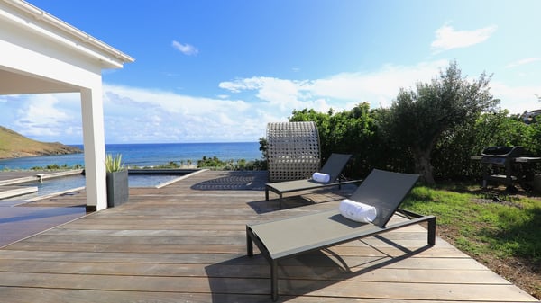 Located in Toiny facing the beach and the stunning panorama, the vacation villa Ti Chato is a charming seaside property built on one level. In a style combining both modern decoration and architectural tradition, this two-bedroom vacation home nestled in an enchanting setting is the perfect place for a family or two couples vacationing together in Saint Barths. This contemporary property features an air-conditioned living room furnished with a comfortable sofa facing a large television ideal for movie nights. The window opens onto the view over the swimming pool, the lush tropical environment and the ocean. In the same open space, under a beautiful vaulted patinated-wood ceiling, there is the lovely kitchen with a well-equipped breakfast bar, for meals to be prepared with the best appliances. In a pleasant environment of tropical vegetation, the atmosphere is soothing, relaxing and peaceful. At the front, under the covered part of the terrace, the dining room can accommodate up to six guests around a beautiful table in the gentle trade winds of St. Barths. A lovely swimming pool is set in front of the fantastic ocean view, for relaxing and swimming sessions under the sun. Listening to the sound of waves, guests feel comfortable on the luxurious and spacious wooden deck furnished with a pleasant day bed perfect for resting. Palm trees, olive trees and tropical vegetation bring a fresh touch to this most idyllic scenery. The vacation rental in St. Barths Ti Chato has two beautiful air-conditioned bedrooms with breathtaking ocean views. Located on either side of the living room, they are both equipped with king-size beds, dressing rooms, private bathrooms and direct access to the terrace with a swimming pool. The beige-toned fabrics and cushions provide the rooms a delightful sense of comfort and privacy. Nearby, the sandy beach of Toiny welcomes you and your guests whenever you wish to walk and breathe the mild Caribbean air.