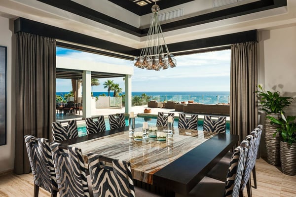 Welcome to Villa Renata, where endless vistas of the Sea of Cortez and the brilliant Baja skies above inspire true harmony and relaxation. Here at Villa Renata, breathtaking natural surroundings combine with stunning design to create the ultimate in luxury living. This spectacular ocean view home is located on the Golden Corridor, just two miles north of downtown Cabo San Lucas in the private gated community of Santa Carmella. Bold, exotic, and supremely stylish, Villa Renata's design impresses indoors and out. A creation of renowned designer Adriana Hoyos, this modern hacienda perfectly blends cool contemporary with sultry sophistication. Fine fixtures, elegant furnishings, and an expertly crafted layout showcase an eye for detail that has landed this home in some of North America's premier design magazines. Crisp white walls and silky cream-toned flooring allow the impressive art pieces, playful pops of animal print, and vibrant accent colors in the decor to be the center of attention in every room. Each of Villa Renata's seven beautifully decorated bedroom suites has a soothing ambiance with soft tones, plush beds, and luxurious linens. Gorgeous beyond compare, the master suite has a King bed, private lounge area, and amazing views of the Cortez, with an ensuite bath that includes features like delicately coated glass teardrop fixtures, floating sinks, and a freestanding tub next to a window looking out to the ocean. For even more indulgence, guests can unwind in the sauna and steam room and then be pampered with in-villa spa services in the comfort of Renata's very own spa suite, complete with salon chairs, a mani/Pedi station, and massage bed. With a view of the pool terrace and ocean waves peeking through swaying palm trees, Villa Renata's ultra-luxe living area is a beautiful space that features designer decor and a chic wet bar and lounge. The home also has a media room with a massive flat screen and ample seating, as well as a separate study/office with a desk, sofa, and coffee table where guests can work or relax. Pocket doors throughout the home disappear to reveal stunning ocean views and allow warm sunlight and fresh sea breezes to fill every room. Uniting beauty and functionality, Villa Renata's gourmet kitchen features a sleek, modern design, complete with premium Viking appliances, dark wood cabinets, elegant white marble countertops, and a marble-topped island with breakfast bar seating. Wood panel privacy screens around the dining room provide an intimate setting to enjoy a delicious sunset meal overlooking views of the glistening Sea of Cortez. Linger at the table and watch the stars come out and the moonlight reflects off the waters of the pool. A floating walkway just beneath the pool's surface leads from the dining room across to a covered outdoor lounge area where a casual dining table, sofas, chairs, and massive outdoor fireplace create a cozy spot to sip cocktails in the evening. The rooftop terrace at Villa Renata is true perfection in design. In addition to the large fireside lounge and dining area, a series of lounge beds and chairs stretches across the terrace with a blazing fire pit as its centerpiece. Plexiglas barriers allow for unobstructed ocean views, and a small privacy hedge of blue agave brings a bit of desert ambiance to the terrace, enhancing the natural beauty that surrounds the home. The rest of the terrace is dominated by Renata's exquisite pool which extends to the edge of the exterior spaces - flowing like a moat along with the living and dining areas of the home. A hidden Jacuzzi bubbles away at the far end of the pool, welcoming a relaxing sunset soak, and the fire pits begin to glow, bathing the terrace in warm light. Come and experience heaven on earth at Villa Renata.