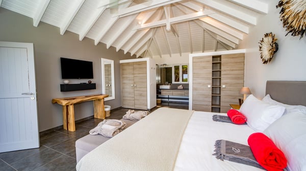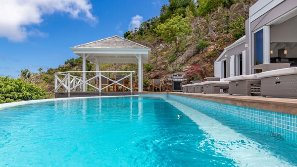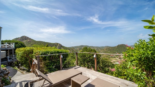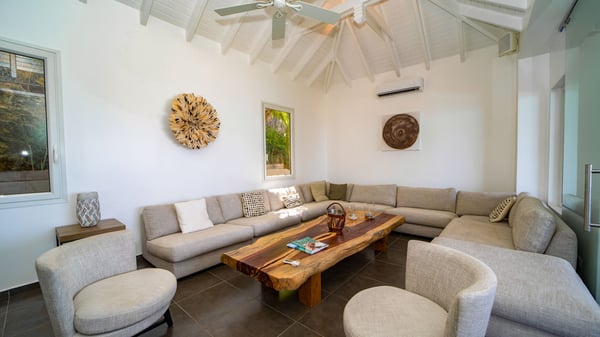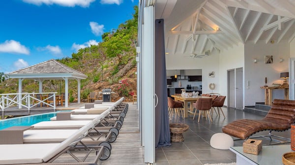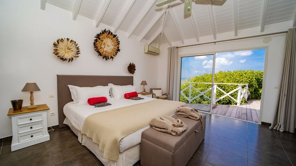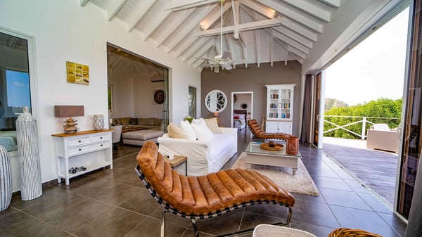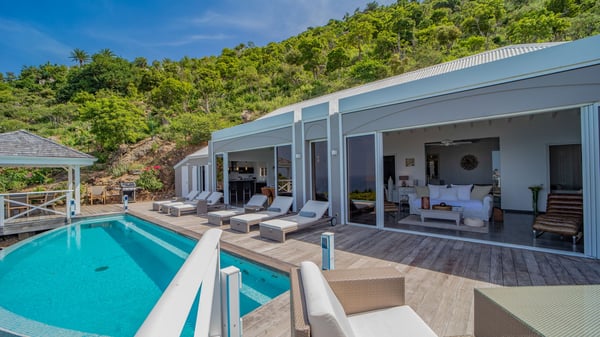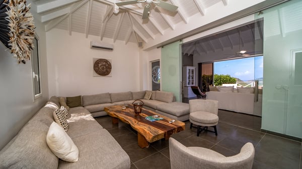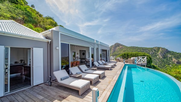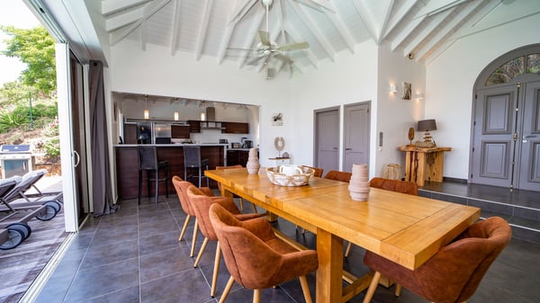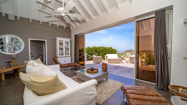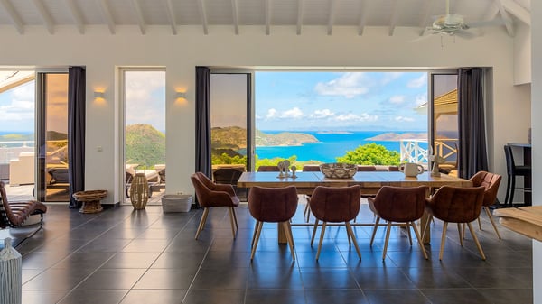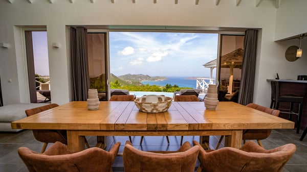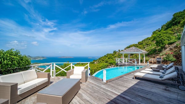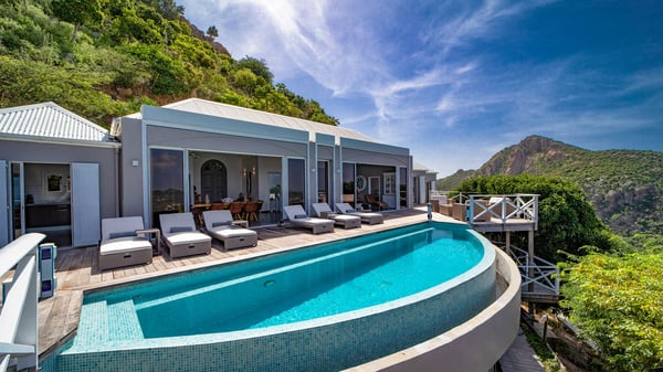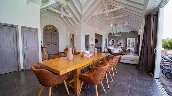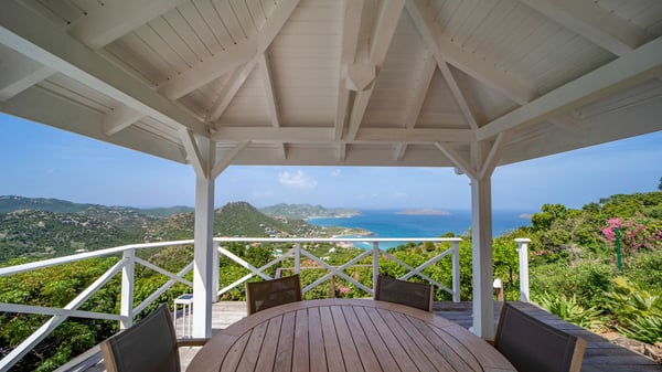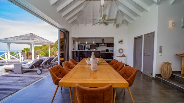 Nestled on a hillside in the quiet Petite Saline neighbourhood, the vacation villa Azetes is a charming property with breathtaking views over Lorient Bay, the islands of St. Martin and Anguilla, and the glorious sunsets. This four-bedroom luxurious rental is the perfect place for an idyllic stay with family or friends in Saint Barths. Designed in a very contemporary style, villa Azetes is well decorated in a refined and warm atmosphere. The large living room is composed of a modern lounge with sofas and armchairs with wood hints. A second living room, which can be closed and air-conditioned, is located at the back in a very private atmosphere, a perfect place for movie nights. The kitchen is well equipped for meals preparation to be enjoyed around the large table that can accommodate up to ten guests under the high vaulted ceiling. With beige and caramel-tone colours, woven fibres and soft cushions, the open-plan living room of villa Azetes is truly dreamy, facing the breathtaking view over the tropical vegetation, the ocean and the neighbouring islands. The front terrace stretches across the width of the villa on a wooden deck featuring a splendid half-moon-shaped heated infinity swimming pool. Deck chairs are set up along the pool facing the ocean view, and a lovely garden lounge is at one end of the deck under a parasol. On the other side of the pool, there is a lovely gazebo with an outdoor dining room for eight guests for alfresco dinners cooked on the barbecue in the mild Caribbean air. All around Villa Azetes, the tropical garden provides a pleasant vegetal touch to the enchanting scenery. The luxurious villa Azetes has four air-conditioned bedrooms with private bathrooms. Two of them are located on the main level and open onto a splendid ocean view. The other two are on the lower level, one of which is slightly smaller, perfect for staff or for a teenager. All are furnished with king-size beds that can be converted into twin beds in a refined and cozy atmosphere. Luxurious and comfortable, villa Azetes is the haven of peace you're looking for for your next stay in St. Barths.