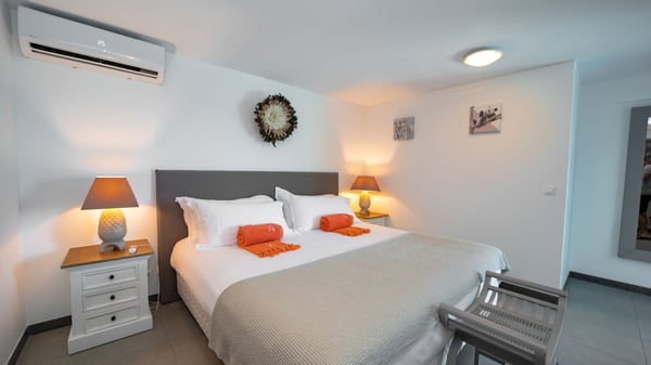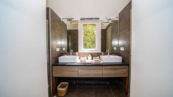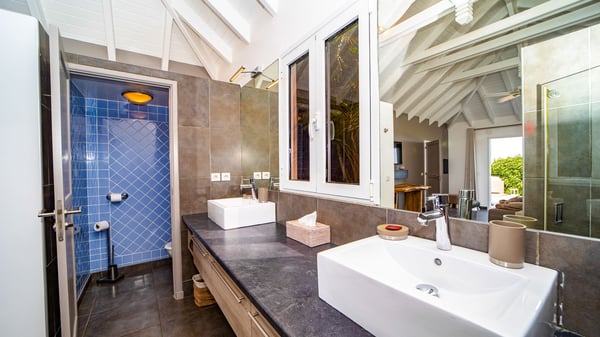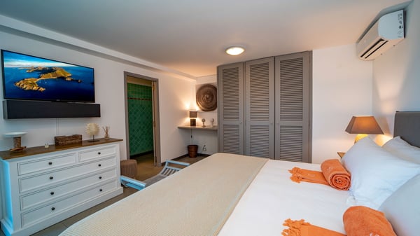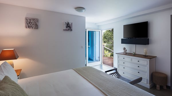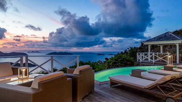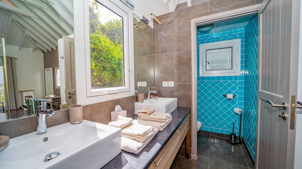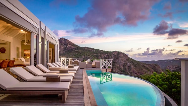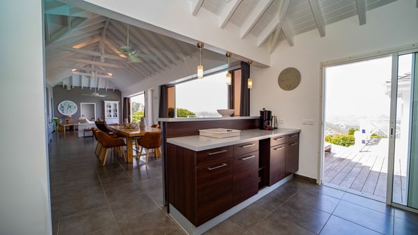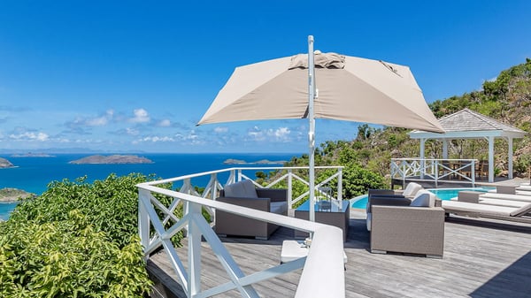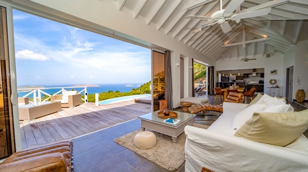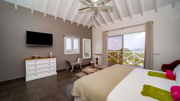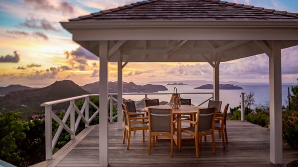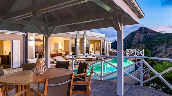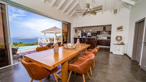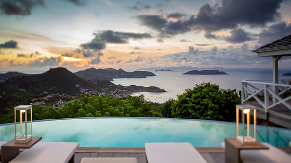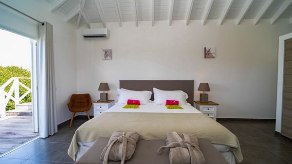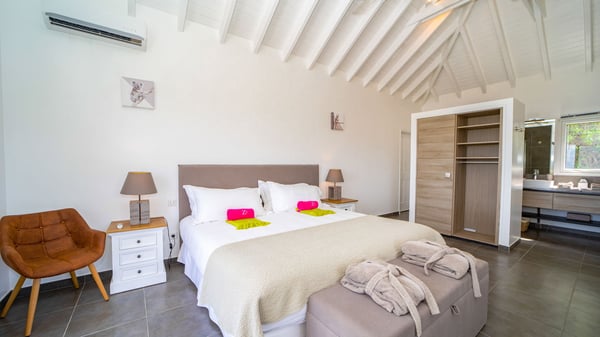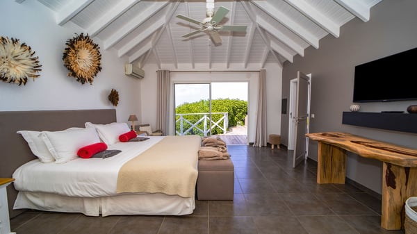 Nestled on a hillside in the quiet Petite Saline neighbourhood, the vacation villa Azetes is a charming property with breathtaking views over Lorient Bay, the islands of St. Martin and Anguilla, and the glorious sunsets. This four-bedroom luxurious rental is the perfect place for an idyllic stay with family or friends in Saint Barths. Designed in a very contemporary style, villa Azetes is well decorated in a refined and warm atmosphere. The large living room is composed of a modern lounge with sofas and armchairs with wood hints. A second living room, which can be closed and air-conditioned, is located at the back in a very private atmosphere, a perfect place for movie nights. The kitchen is well equipped for meals preparation to be enjoyed around the large table that can accommodate up to ten guests under the high vaulted ceiling. With beige and caramel-tone colours, woven fibres and soft cushions, the open-plan living room of villa Azetes is truly dreamy, facing the breathtaking view over the tropical vegetation, the ocean and the neighbouring islands. The front terrace stretches across the width of the villa on a wooden deck featuring a splendid half-moon-shaped heated infinity swimming pool. Deck chairs are set up along the pool facing the ocean view, and a lovely garden lounge is at one end of the deck under a parasol. On the other side of the pool, there is a lovely gazebo with an outdoor dining room for eight guests for alfresco dinners cooked on the barbecue in the mild Caribbean air. All around Villa Azetes, the tropical garden provides a pleasant vegetal touch to the enchanting scenery. The luxurious villa Azetes has four air-conditioned bedrooms with private bathrooms. Two of them are located on the main level and open onto a splendid ocean view. The other two are on the lower level, one of which is slightly smaller, perfect for staff or for a teenager. All are furnished with king-size beds that can be converted into twin beds in a refined and cozy atmosphere. Luxurious and comfortable, villa Azetes is the haven of peace you're looking for for your next stay in St. Barths.