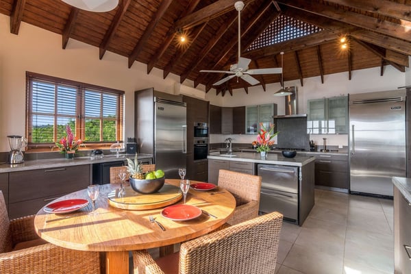 Caribali Villa offers a very spacious living environment in an enviable location. The villa has been built to a very high specification. The interiors feature polished hardwood floors and Balinese-style cathedral ceilings. Caribali has a spacious air-conditioned kitchen featuring top-of-the-line equipment. Located on the south side of the villa are the dining room, the living room and the TV room. On the east side of the property are two bedrooms, and a further two bedrooms are on the west side. French doors from the lounge and dining rooms lead to the sunny pool deck and the large infinity edge pool featuring natural river stones.