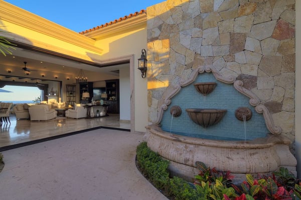 Casa Bella Villa, a spacious six-bedroom sanctuary perched over the Sea of Cortez in Los Cabos, offers a blend of comfort and luxury. Designed with a contemporary flair and colorful local influences, the villa stands out with its retractable floor-to-ceiling windows in most rooms, letting guests enjoy stunning panoramas. The kitchen is a food lover’s dream, equipped with top-tier appliances and a granite prep island, all complemented by a formal dining area. Its outdoor area features a pool, umbrella-shaded chaises, and enchanting fire pits, perfect for relaxing or entertaining. A highlight of the villa includes an outdoor living space under the eaves that doubles as an outdoor terrace, offering an expansive dining table set amidst the calming sounds of the sea.