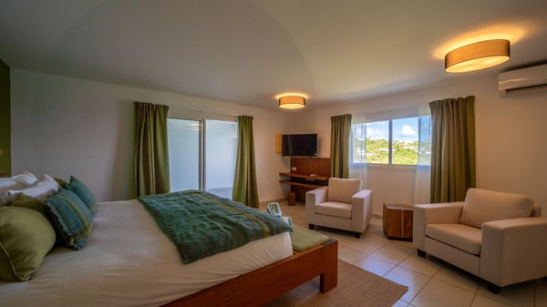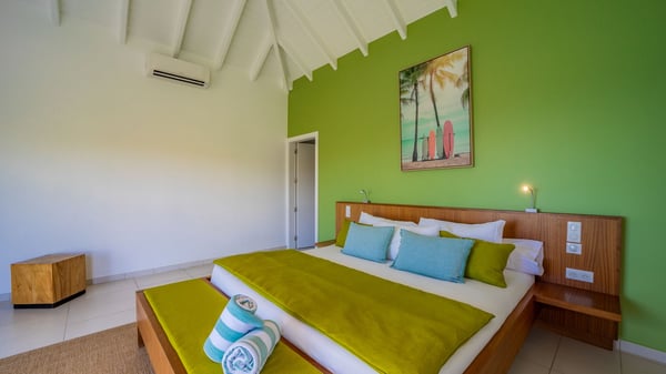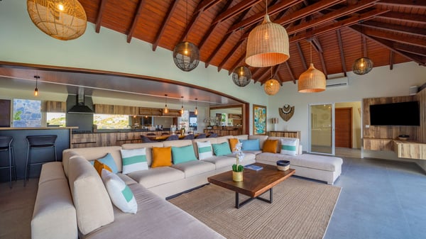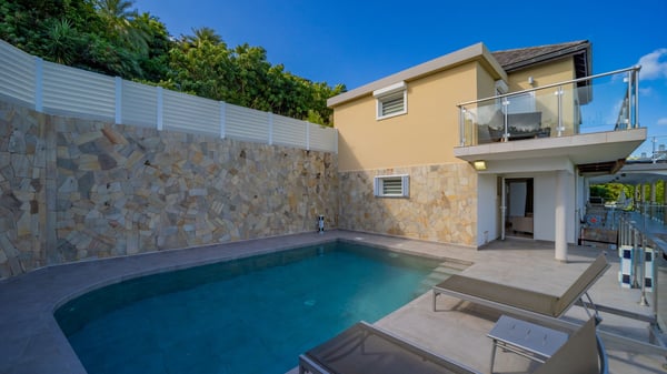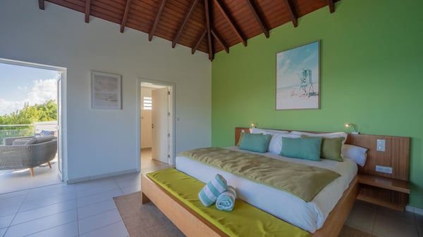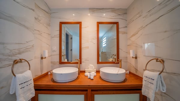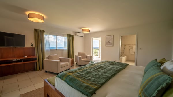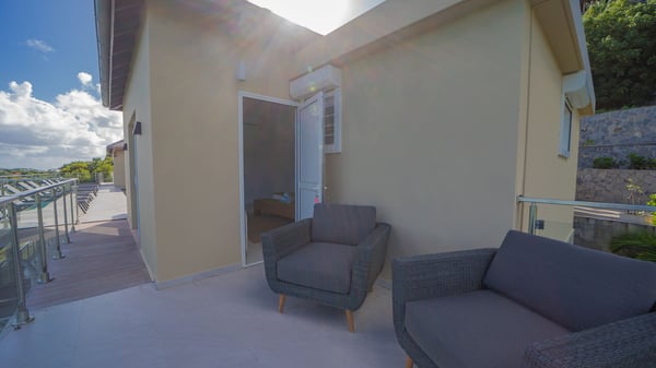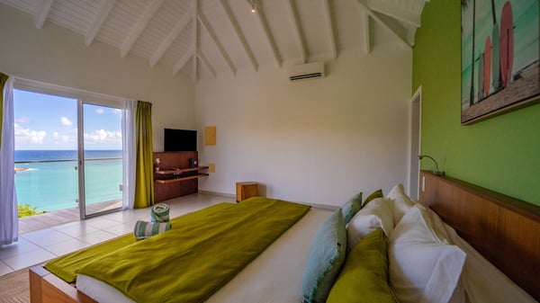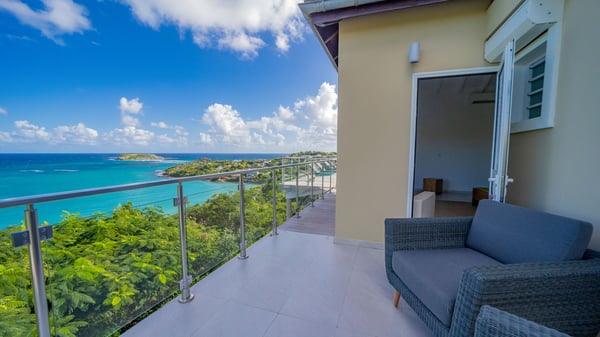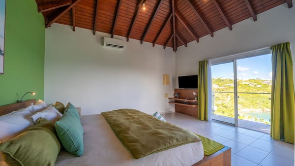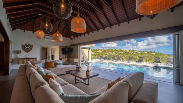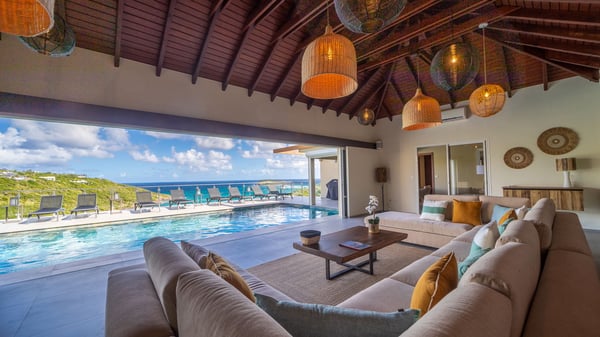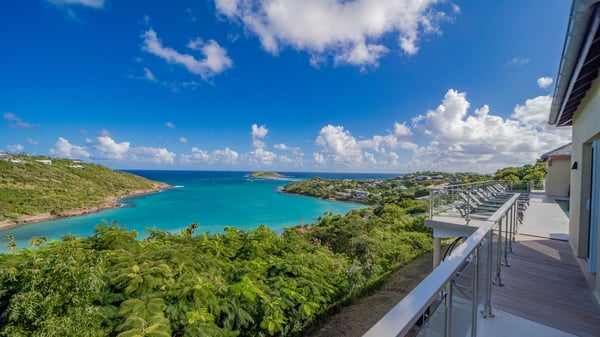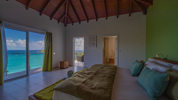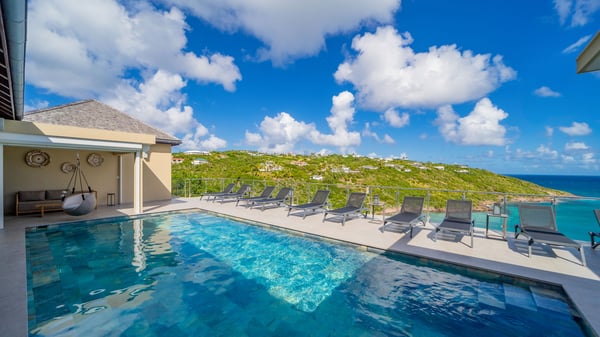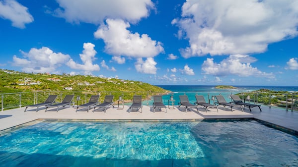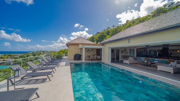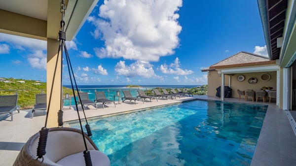Ideally located in Marigot, vacation rental Bellevue offers a breathtaking panorama over the bay and the neighbouring hills. In perfect harmony with the tropical environment, this property built on two levels combines utmost comfort with a refined decoration, enhanced by works of art by the artist Zaza Noah. Vacation rental Bellevue is a spacious and luxurious villa nestled in a serene and relaxing atmosphere. On the main level, the large air-conditioned living room opens onto the ocean and welcomes you with family or friends around comfortable sofas covered with cushions and a large coffee table in driftwood decor. The dining room can accommodate ten guests at the back of the living room in a cozy nook perfect for talking. The spacious kitchen featuring a bar is well equipped to cook delicious meals or to call upon a private chef. At the front, a magnificent heated swimming pool stretches across the width of the house, in front of the living room seeming to dive into it. In a dream setting, lounge chairs and small coffee tables are around the pool, in front of the striking blue horizon. This beautiful vacation villa has five bedrooms, three of which are on the main level and two on the lower level. Four bedrooms open onto stunning ocean views, king-size beds and en-suite bathrooms. On the lower level, one of the two rooms features a private swimming pool and a private terrace. The bedrooms are spacious, clean and welcoming, with a touch of colour on the pillows and paintings; they are ideal for resting in a serene ambiance. Vacation home Bellevue also has a cinema room with a large screen for pleasant movie nights. For sports lovers, an equipped fitness room is at your disposal. Villa Bellevue is a fantastic choice for large groups or families vacationing together for an unforgettable stay in St. Barths.