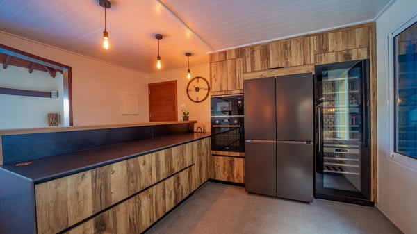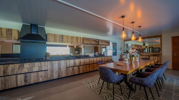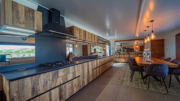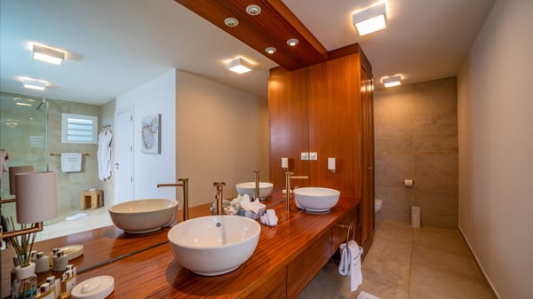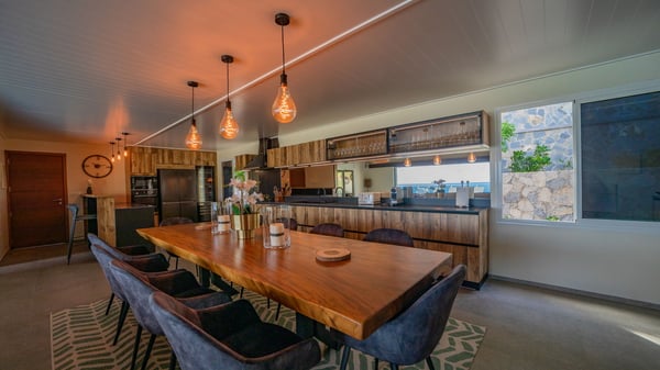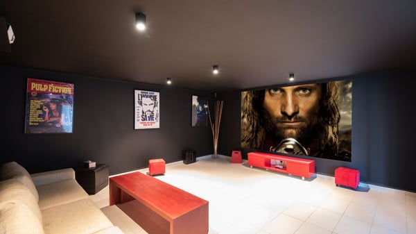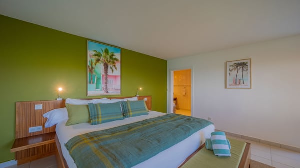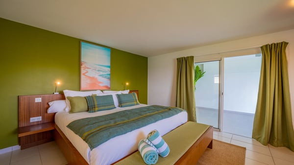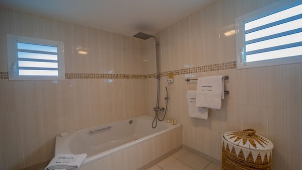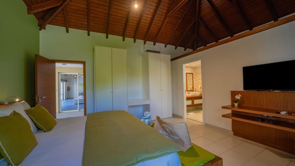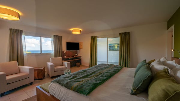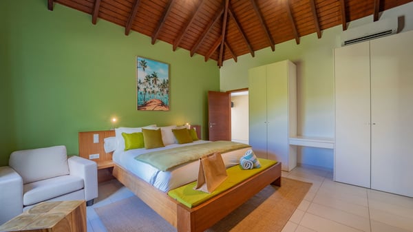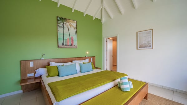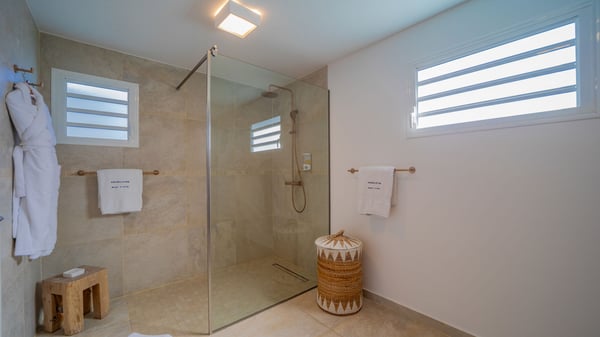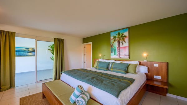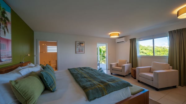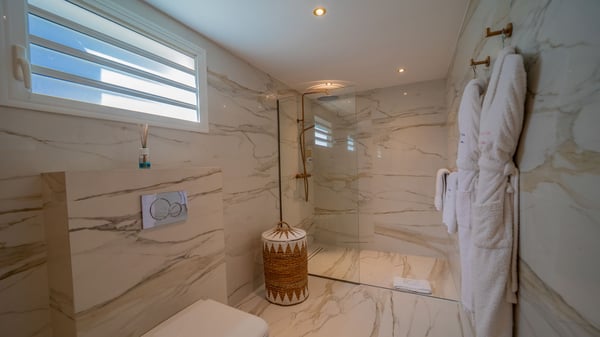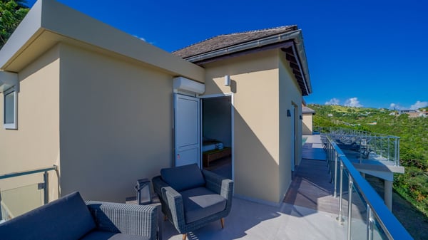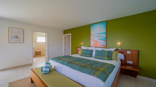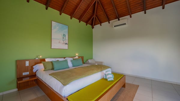 Ideally located in Marigot, vacation rental Bellevue offers a breathtaking panorama over the bay and the neighbouring hills. In perfect harmony with the tropical environment, this property built on two levels combines utmost comfort with a refined decoration, enhanced by works of art by the artist Zaza Noah. Vacation rental Bellevue is a spacious and luxurious villa nestled in a serene and relaxing atmosphere. On the main level, the large air-conditioned living room opens onto the ocean and welcomes you with family or friends around comfortable sofas covered with cushions and a large coffee table in driftwood decor. The dining room can accommodate ten guests at the back of the living room in a cozy nook perfect for talking. The spacious kitchen featuring a bar is well equipped to cook delicious meals or to call upon a private chef. At the front, a magnificent heated swimming pool stretches across the width of the house, in front of the living room seeming to dive into it. In a dream setting, lounge chairs and small coffee tables are around the pool, in front of the striking blue horizon. This beautiful vacation villa has five bedrooms, three of which are on the main level and two on the lower level. Four bedrooms open onto stunning ocean views, king-size beds and en-suite bathrooms. On the lower level, one of the two rooms features a private swimming pool and a private terrace. The bedrooms are spacious, clean and welcoming, with a touch of colour on the pillows and paintings; they are ideal for resting in a serene ambiance. Vacation home Bellevue also has a cinema room with a large screen for pleasant movie nights. For sports lovers, an equipped fitness room is at your disposal. Villa Bellevue is a fantastic choice for large groups or families vacationing together for an unforgettable stay in St. Barths.