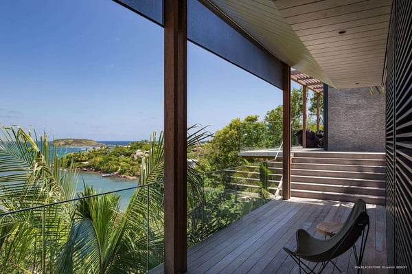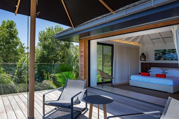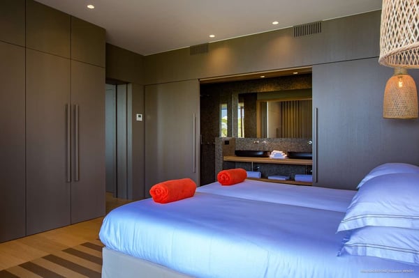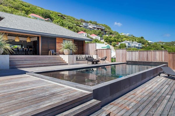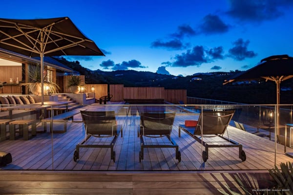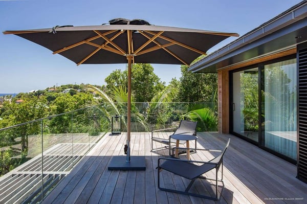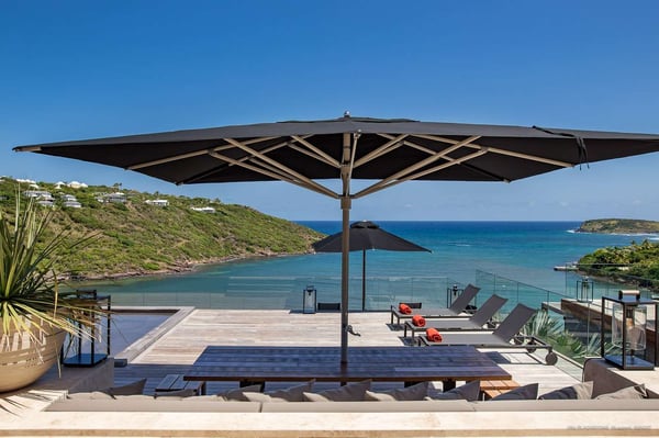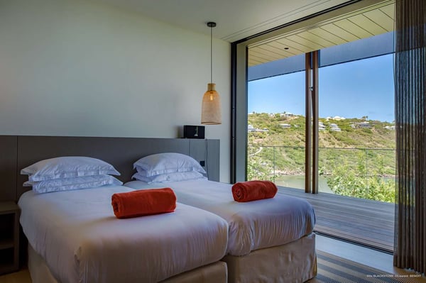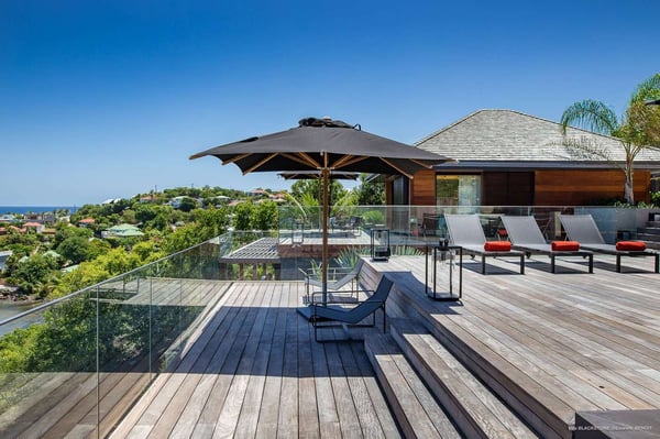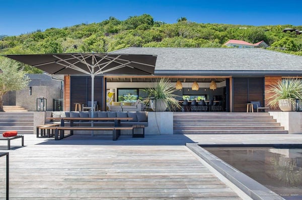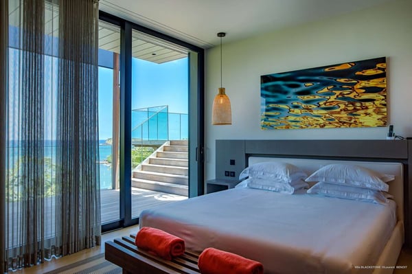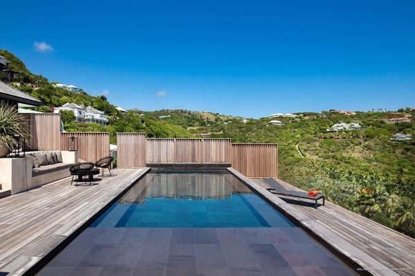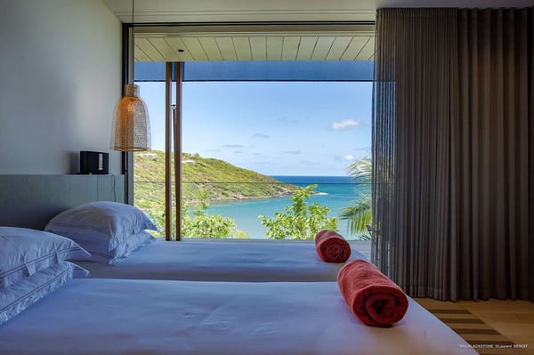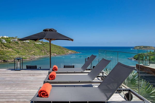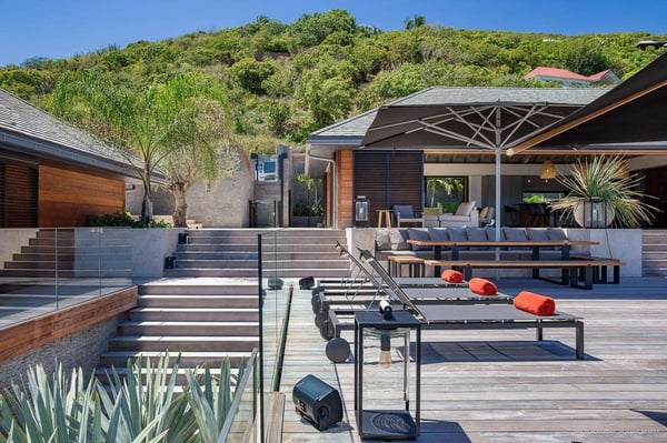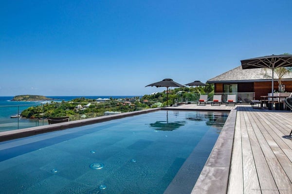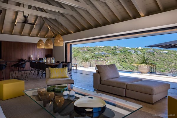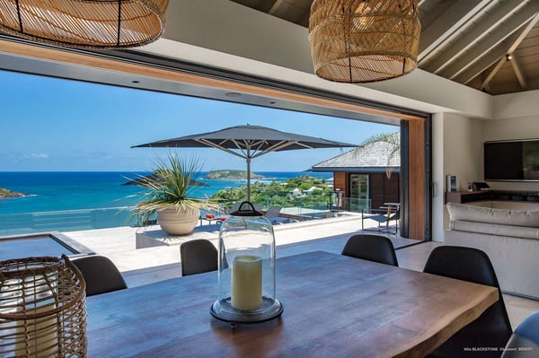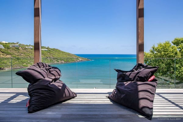 The newly built and luxurious villa rental Blackstone is located in the beautiful Marigot hillside and offers a magnificent view of the bay and the verdant countryside. With a modern and stylish design, the villa boasts a balanced mix of contemporary architecture and Caribbean touches, as well as the perfect blend of black and concrete natural materials with the outside palette of colours. This luxury vacation property in St-Barths has an open and airy living room facing the panoramic view of Marigot Bay. This relaxing area is made of large sofas covered with cushions, under a vaulted ceiling with warm colours and typical Caribbean feels. The dining room accommodates up to twelve people around a spacious wooden table with contemporary black chairs. Behind the dining area, there is a well-equipped kitchen, perfect for having a private chef prepare dinners. You’ll like to enjoy having a hot or cold drink around the breakfast bar, where huge glass doors offer a breathtaking view of the sparkling ocean. Steps lead down to the terrace of Villa Blackstone, with an expansive deck, furnished by chic and modern decor for outdoor living. A beautiful and oversized heated swimming pool stretches out, surrounded by multiple sitting areas, sofas and lounge chairs for a perfect sunny moment. You can have your meals outside around a large table with benches, facing the breathtaking view of the bay behind the transparent glass rails that flank the terrace. Villa Blackstone accommodates up to twelve people in six comfortable air-conditioned bedrooms with vaulted high ceilings. One bedroom is located in a separate bungalow for perfect privacy; another one is attached to the main building, while the other four bedrooms are located on a lower floor. All of them have a beautiful ocean view, and come with king-size beds, except for one of them with twin beds. This specific bedroom connects to a second bedroom, which is an ideal setup for children. Also located on the lower level, the air-conditioned gym facing the sea completes the picture of this luxury villa in St-Barths. Perfect for a large family or group of friends wishing to share a villa rental property, the Villa Blackstone is one the top places for an unforgettable vacation in the Caribbean.