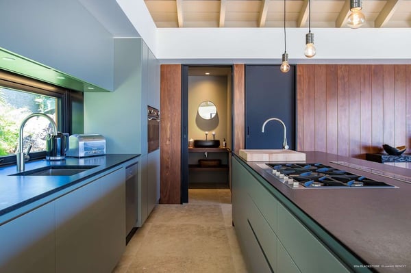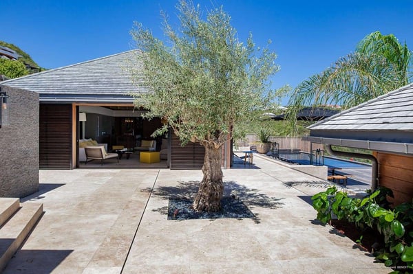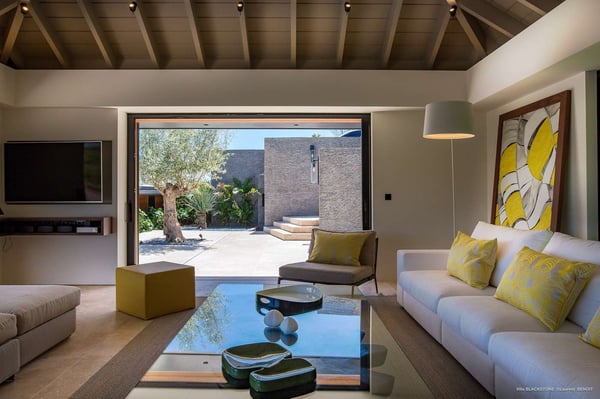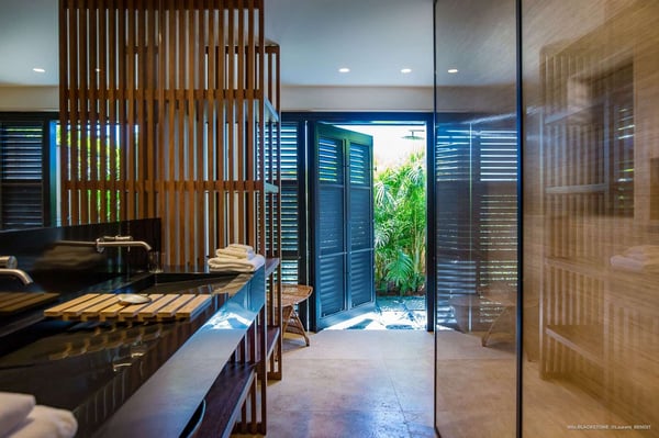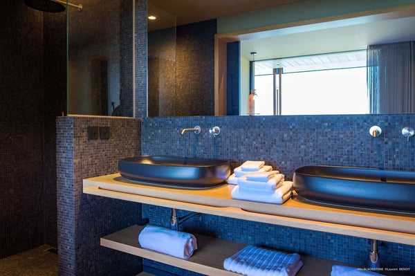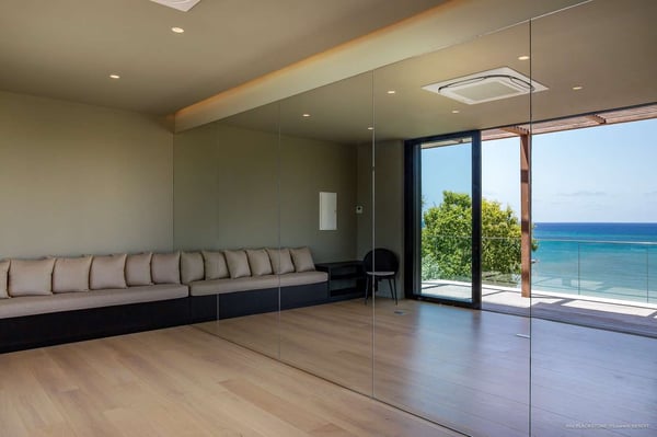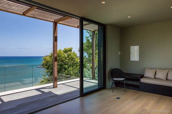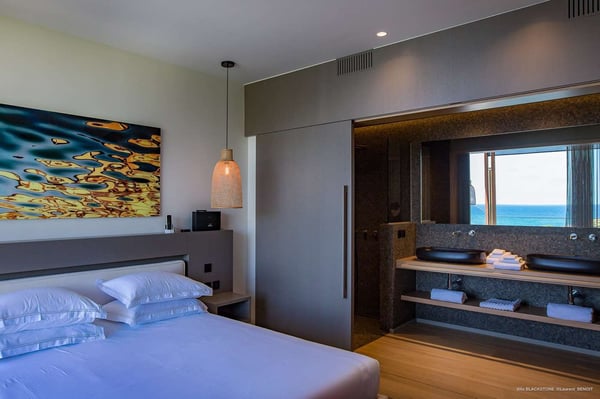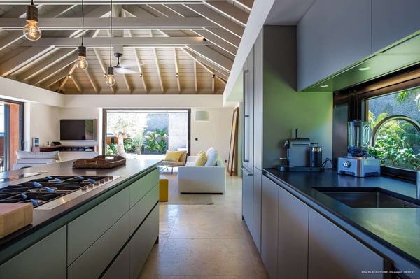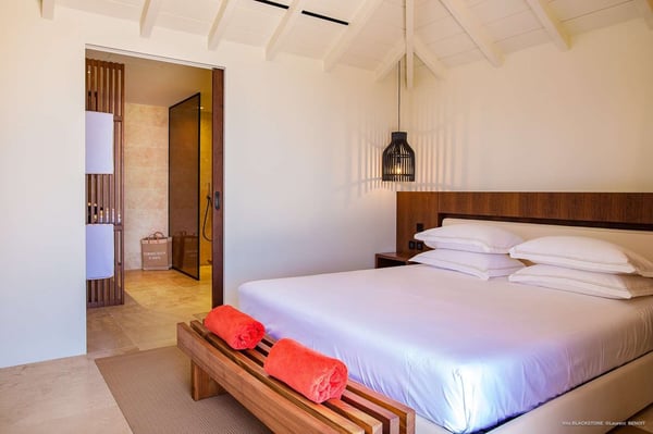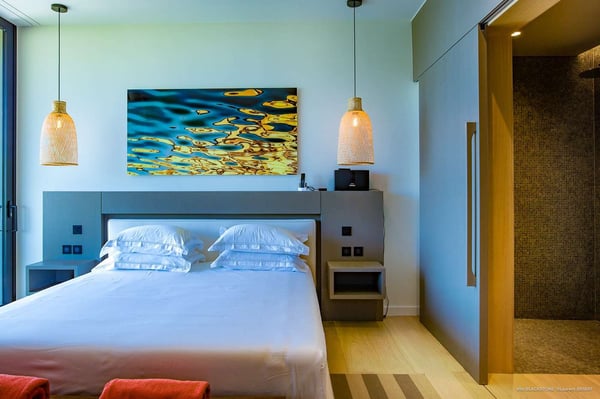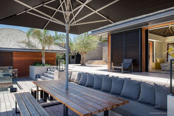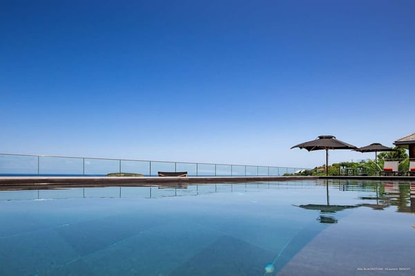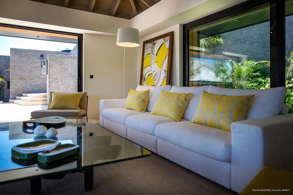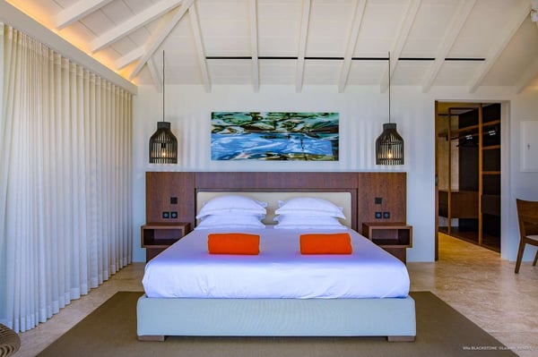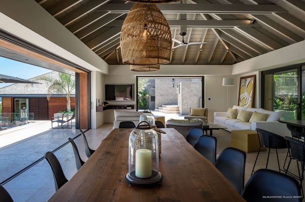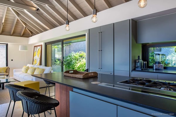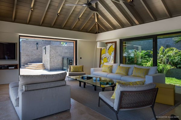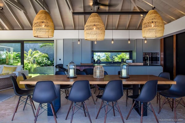 The newly built and luxurious villa rental Blackstone is located in the beautiful Marigot hillside and offers a magnificent view of the bay and the verdant countryside. With a modern and stylish design, the villa boasts a balanced mix of contemporary architecture and Caribbean touches, as well as the perfect blend of black and concrete natural materials with the outside palette of colours. This luxury vacation property in St-Barths has an open and airy living room facing the panoramic view of Marigot Bay. This relaxing area is made of large sofas covered with cushions, under a vaulted ceiling with warm colours and typical Caribbean feels. The dining room accommodates up to twelve people around a spacious wooden table with contemporary black chairs. Behind the dining area, there is a well-equipped kitchen, perfect for having a private chef prepare dinners. You’ll like to enjoy having a hot or cold drink around the breakfast bar, where huge glass doors offer a breathtaking view of the sparkling ocean. Steps lead down to the terrace of Villa Blackstone, with an expansive deck, furnished by chic and modern decor for outdoor living. A beautiful and oversized heated swimming pool stretches out, surrounded by multiple sitting areas, sofas and lounge chairs for a perfect sunny moment. You can have your meals outside around a large table with benches, facing the breathtaking view of the bay behind the transparent glass rails that flank the terrace. Villa Blackstone accommodates up to twelve people in six comfortable air-conditioned bedrooms with vaulted high ceilings. One bedroom is located in a separate bungalow for perfect privacy; another one is attached to the main building, while the other four bedrooms are located on a lower floor. All of them have a beautiful ocean view, and come with king-size beds, except for one of them with twin beds. This specific bedroom connects to a second bedroom, which is an ideal setup for children. Also located on the lower level, the air-conditioned gym facing the sea completes the picture of this luxury villa in St-Barths. Perfect for a large family or group of friends wishing to share a villa rental property, the Villa Blackstone is one the top places for an unforgettable vacation in the Caribbean.