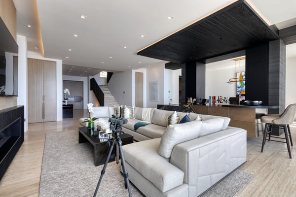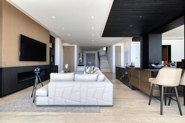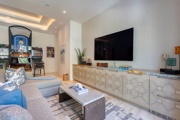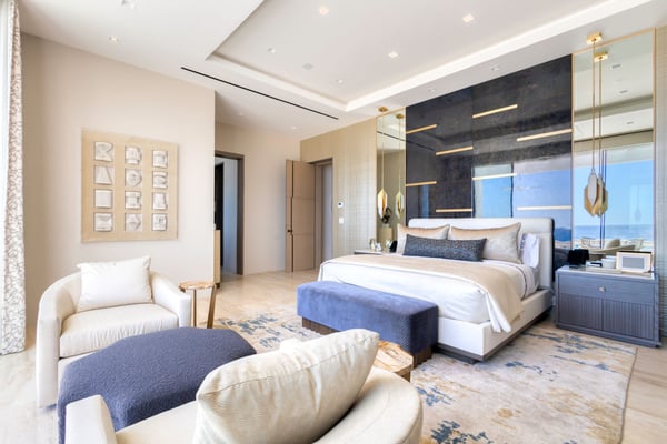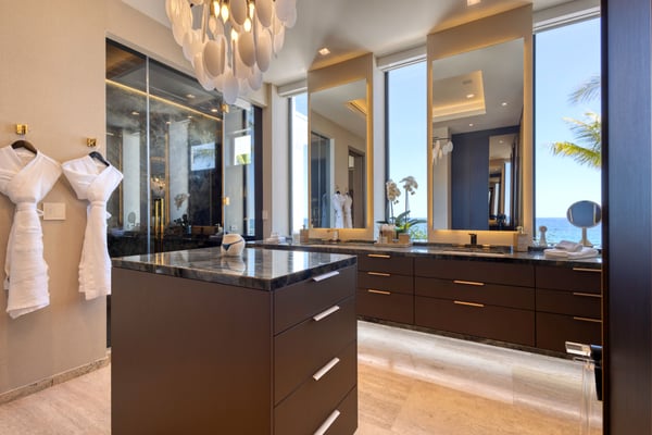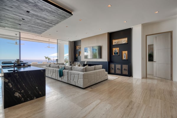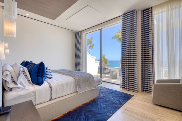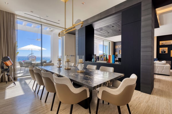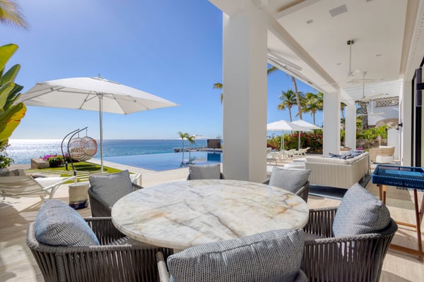 Welcome to a sanctuary of unparalleled luxury with our exquisite oceanfront villa, designed to cater to the most discerning tastes. Each of the three primary bedrooms, including two on the second floor and one on the first, feature full ocean views, king-sized beds, automated sheers, shades, and lighting systems, as well as in-suite bathrooms equipped with steam showers, expansive closets with some automated hanging racks, and hidden TVs and music systems for ultimate privacy and comfort. The second-floor primary suites open to a sprawling terrace with automated sun screen protection and multiple seating areas, all overlooking the mesmerizing ocean. The first-floor primary bedroom offers direct access to a sun-protected seating area with stunning ocean views. The Villa also boasts two additional bedrooms, one with a queen and the other with two queen beds and each with bathrooms. Other areas include an additional family room with TV and music. This villa’s grandeur extends to its expansive open-plan first floor, featuring floor-to-ceiling automated doors that reveal breathtaking ocean vistas. Enjoy a state-of-the-art living space with an Eggersmann bar area equipped with top-tier appliances, ice machine, wine storage, and a dining room that seats twelve, adjoining a sophisticated automated kitchen boasting Miele appliances, including an espresso maker, two large refrigerators, freezers, and dishwashers. The robust living room includes a fireplace, TV, and music. An elevator enhances accessibility between floors, adding a layer of convenience to the sophisticated layout. For entertainment, the villa features a game room equipped with three classic, fully restored pinball machines, an NBA basketball shooting game, and a table for two video game console with dozens of video games. The outdoor amenities are equally impressive, featuring a very expansive chlorine-free pool with a swim-up bar, an integrated hot tub, a unique addition is the cold plunge, perfect for a refreshing dip after a sunny day. A complete outdoor kitchen with a pizza oven for gourmet cooking under the stars, adjacent to an oceanfront dining area for 12, plus and adjoining fire pit. Surrounding the pool are automated umbrellas, and shaded dining and lounge areas with ceiling fans that run the entire length of the covered outdoor patio, providing a luxurious space for relaxation and social gatherings.
