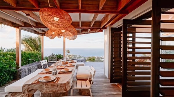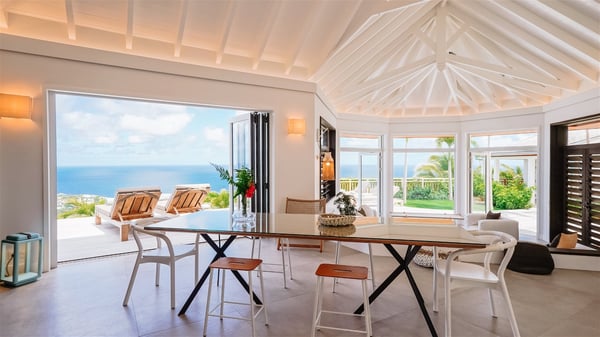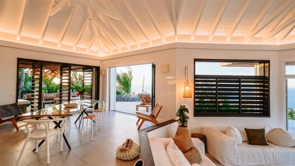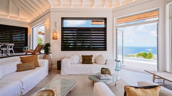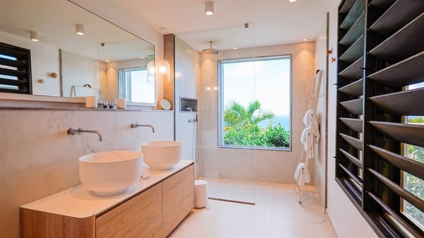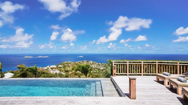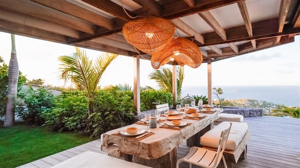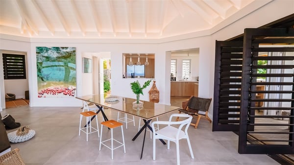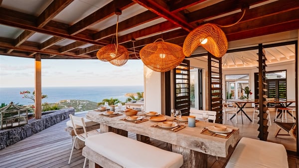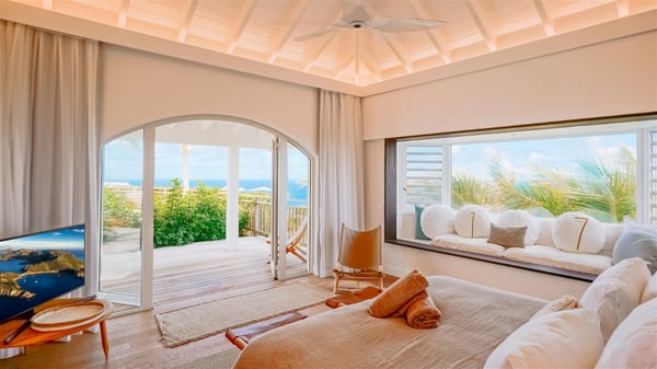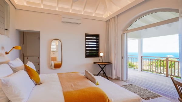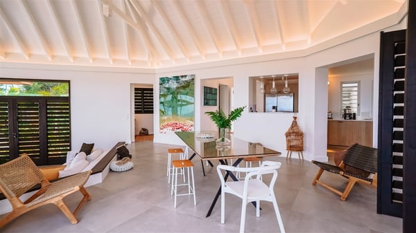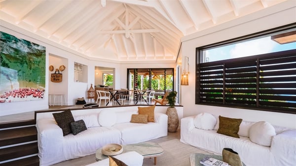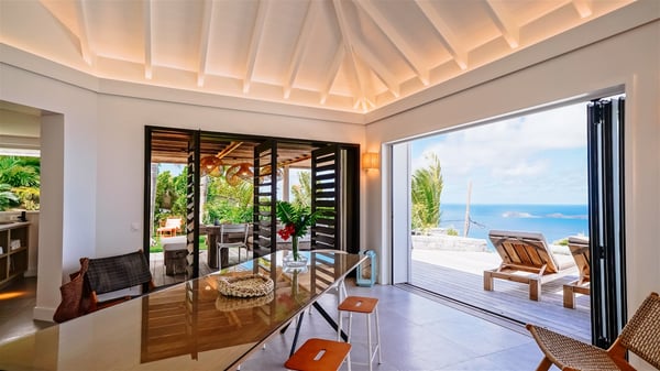 Nestled on a hillside in the quiet Vitet neighbourhood, the luxury rental villa Mamiami in St-Barths is a beautiful new property, which perfectly combines the charm of a classic island-inspired architecture with a refined and contemporary decoration. The property enjoys also a spectacular and panoramic view over the Marigot bay and the neighbouring hills, for unforgettable moments of delight when the sunset time comes. This bright, light-filled house surrounded by lavish tropical greenery, is the ideal place for family or friends wishing to enjoy fantastic holidays in St-Barths. Mamiami is divided into multiple independent pavilions where privacy is not just a word. The main building features a comfortable sunken living area, all in a creamy white tone, furnished with soft sofas and marble tables. The marriage of comfort and elegance is perfect, and the tasteful decoration creates a soothing and relaxing atmosphere. Large windows open onto the terrace with an amazing view over the tropical garden and the ocean. The indoor dining room is a few steps above and encompasses a modern dining table, chairs, stools and armchairs, refreshed by the natural breezes that waft their way through the openings. On the back, the wooden and cream-toned kitchen is well equipped and opens onto the outside, a setup that brings a soft natural daylight. Under the covered terrace, there is a welcoming outdoor dining area furnished with a massive wooden table and benches covered with cushions. The honey colour is dominant in this warm and refined atmosphere, in the heart of the tropical vegetation. Outside, guests discover a splendid heated infinity swimming pool facing the panoramic view for delightful moments. Sun decks and an outdoor lounge are set up to emphasize the outdoor experience under the Saint-Barts’ sun, while comfortably seated in front of the view. The vacation rental Mamiami has three beautiful air-conditioned bedrooms with queen size beds and en-suite bathrooms. Each is located in a separate pavilion with a splendid view of the ocean and the lush vegetation. Linen and wood tones are dominant in this elegant atmosphere decorated with benches and cushions. Each room offers access to the terrace, as the perfect place to enjoy the beauty of St-Barths island and its natural environment.