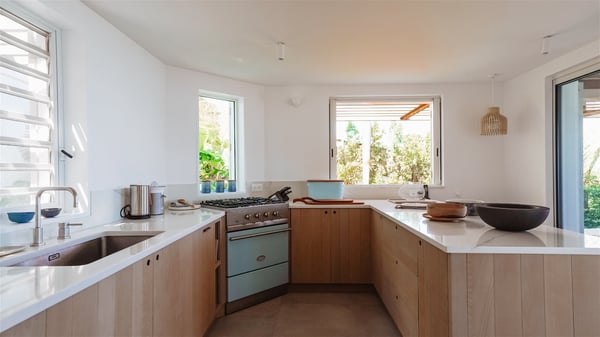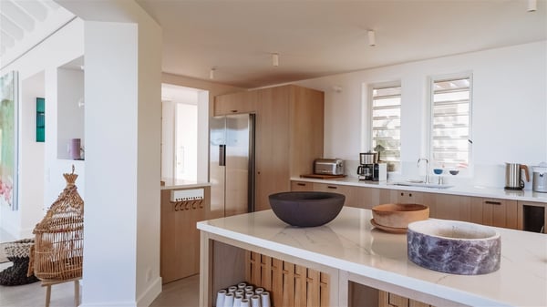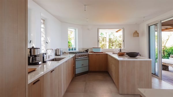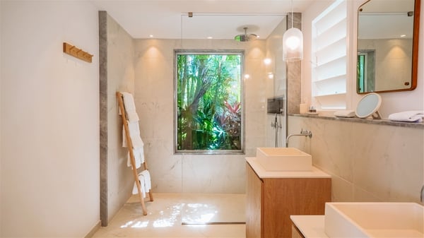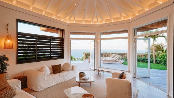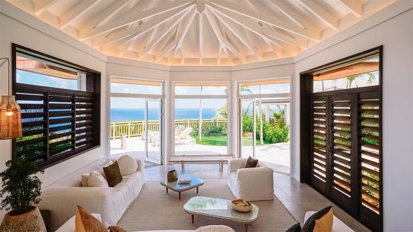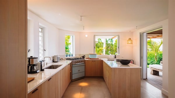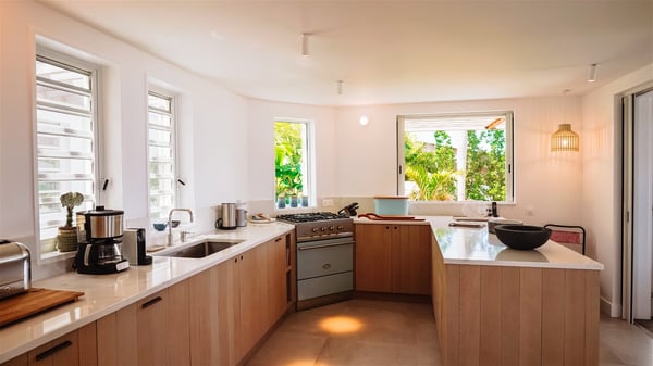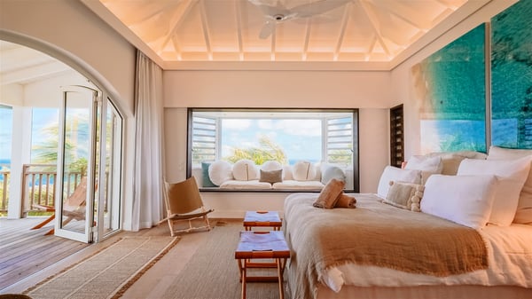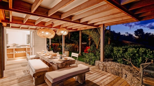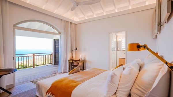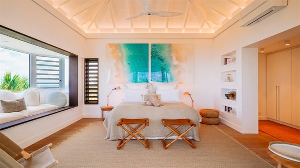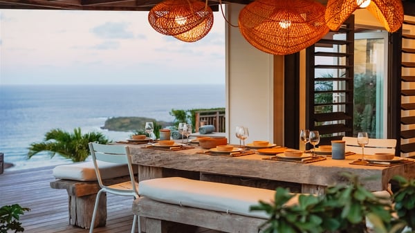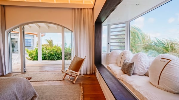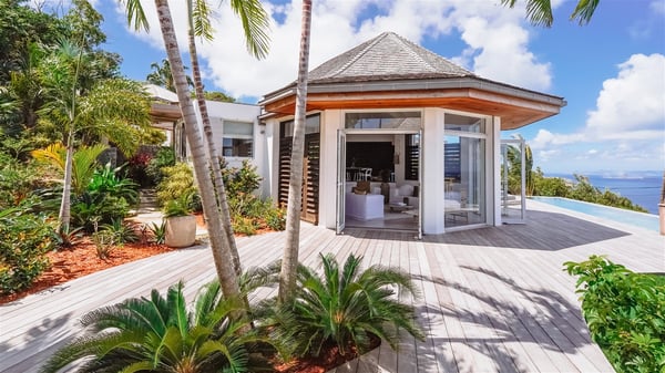 Nestled on a hillside in the quiet Vitet neighbourhood, the luxury rental villa Mamiami in St-Barths is a beautiful new property, which perfectly combines the charm of a classic island-inspired architecture with a refined and contemporary decoration. The property enjoys also a spectacular and panoramic view over the Marigot bay and the neighbouring hills, for unforgettable moments of delight when the sunset time comes. This bright, light-filled house surrounded by lavish tropical greenery, is the ideal place for family or friends wishing to enjoy fantastic holidays in St-Barths. Mamiami is divided into multiple independent pavilions where privacy is not just a word. The main building features a comfortable sunken living area, all in a creamy white tone, furnished with soft sofas and marble tables. The marriage of comfort and elegance is perfect, and the tasteful decoration creates a soothing and relaxing atmosphere. Large windows open onto the terrace with an amazing view over the tropical garden and the ocean. The indoor dining room is a few steps above and encompasses a modern dining table, chairs, stools and armchairs, refreshed by the natural breezes that waft their way through the openings. On the back, the wooden and cream-toned kitchen is well equipped and opens onto the outside, a setup that brings a soft natural daylight. Under the covered terrace, there is a welcoming outdoor dining area furnished with a massive wooden table and benches covered with cushions. The honey colour is dominant in this warm and refined atmosphere, in the heart of the tropical vegetation. Outside, guests discover a splendid heated infinity swimming pool facing the panoramic view for delightful moments. Sun decks and an outdoor lounge are set up to emphasize the outdoor experience under the Saint-Barts’ sun, while comfortably seated in front of the view. The vacation rental Mamiami has three beautiful air-conditioned bedrooms with queen size beds and en-suite bathrooms. Each is located in a separate pavilion with a splendid view of the ocean and the lush vegetation. Linen and wood tones are dominant in this elegant atmosphere decorated with benches and cushions. Each room offers access to the terrace, as the perfect place to enjoy the beauty of St-Barths island and its natural environment.