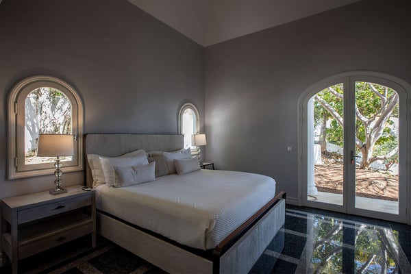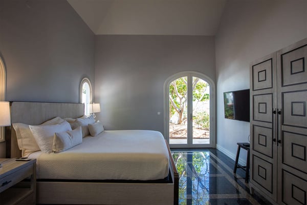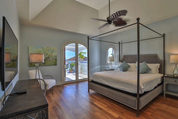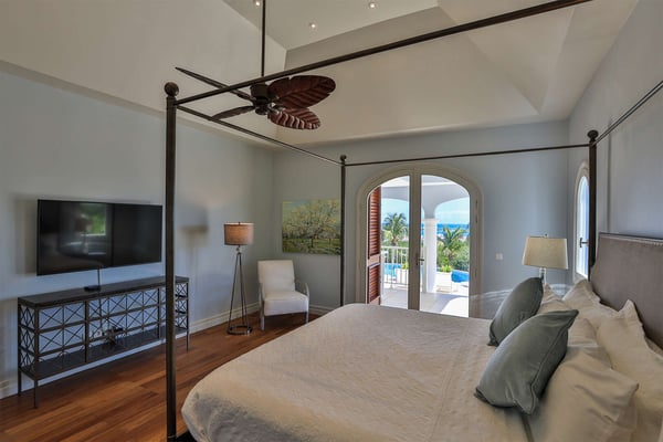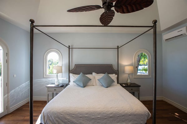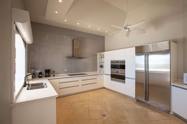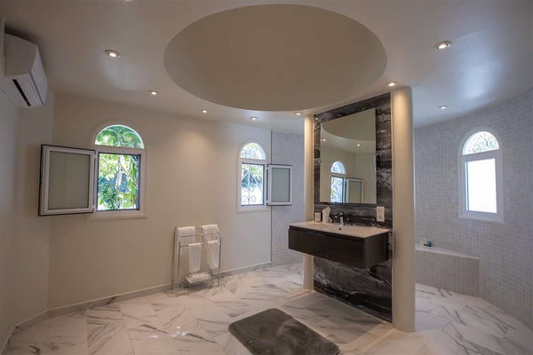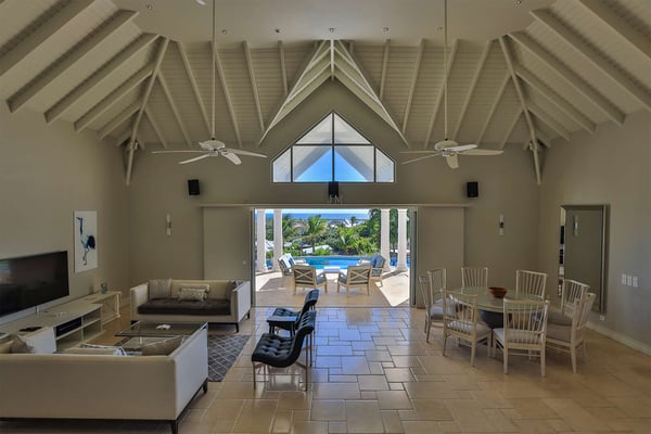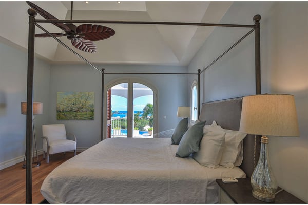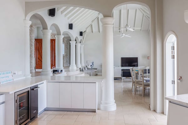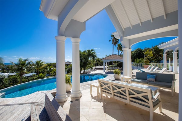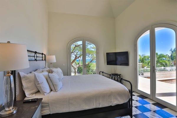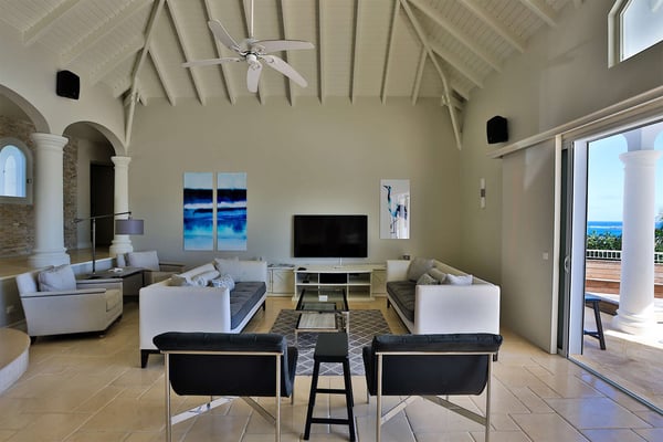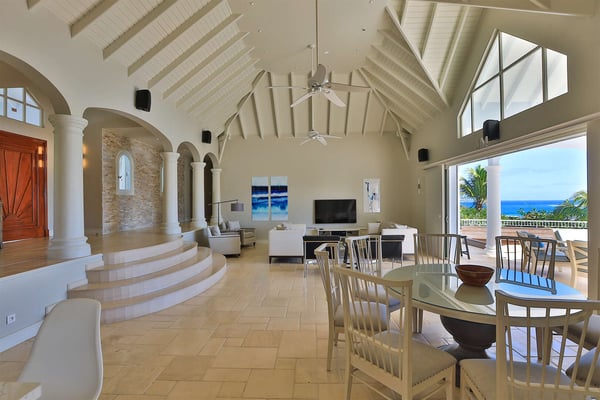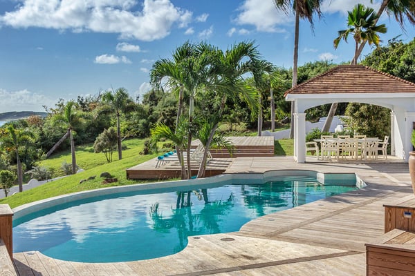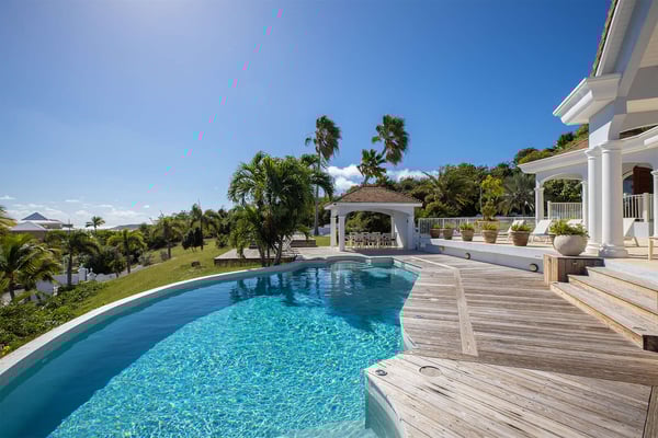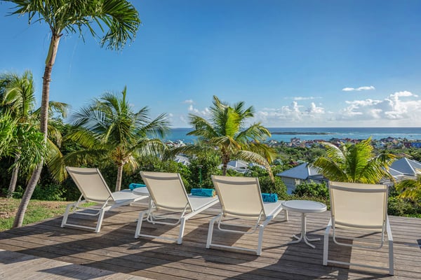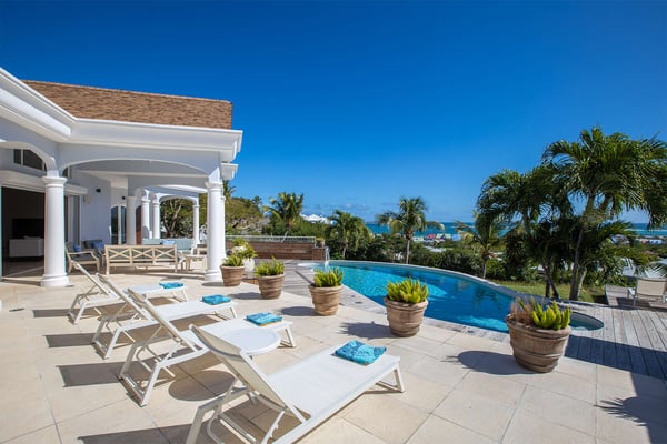 The French word "Beauvoir" means "Beautiful View" and Villa Beauvoir more than lives up to its name. With its location in the hills of Parc de la Baie Orientale, the views not only sweep over Bai Orientale and the waters of the Atlantic Ocean, but they also include wonderful views of Tintamarre and Pinel. A four-bedroom gem of island design and décor, Villa Beauvoir is a destination all on its own. Situated in a gated community, the house follows the curve of the landscape, surrounded by tropical vegetation. The structure is a unique blend of tropical architecture, modern design and classical style. Situated on a small hillock, the large plot provides lots of private outdoor spaces. Savour the views from the shade of the covered pool terrace that sits at the front of the structure and provides space for multiple outdoor lounging spaces. There is the elegantly shaped pool framed by the immense wooden deck. Also enjoy the small deck furnished for sunbathing and another designed specifically for al fresco dining. Multiple lounge areas are tucked beneath the verandah. The grill and barbecue area, and a gazebo, round out the outdoor spaces. Inside, elegant arched doorways lead to the modern and tastefully decorated great room. This room has high cathedral ceilings and a colour palette dominated by shades of cream and white. As the sun begins to rise this room allows for tons of sunlight creating a bright yet soothingly cool space. It exudes a breezy airiness perfect for retreat and escape. This area comprises the living room with an entertainment system and comfy, oversized sofas, and a formal dining room. Adjacent to the great room is a modern, gourmet kitchen that has direct access to the terrace. The kitchen features top-of-the-line, smart appliances by SMEG. The same cool, soothing colour palette of the great room can be found in the kitchen, with its white walls and white marble countertops. The four bedrooms are all designed as private retreats with king-sized beds and large, modern baths. Most open directly to the terrace or the grounds, and one suite is oversized with a private mezzanine furnished as the ideal children’s room. The Villa Beauvoir is just a short walk to the beach and Village Square at Orient Bay and a short drive to the fun and excitement of Grand Case. Villa Beauvoir's spacious rooms, privacy, security, and list of amenities make it the perfect choice for mid-sized families and groups of friends. This property sleeps eight adults and there are two twin beds available for two additional children.