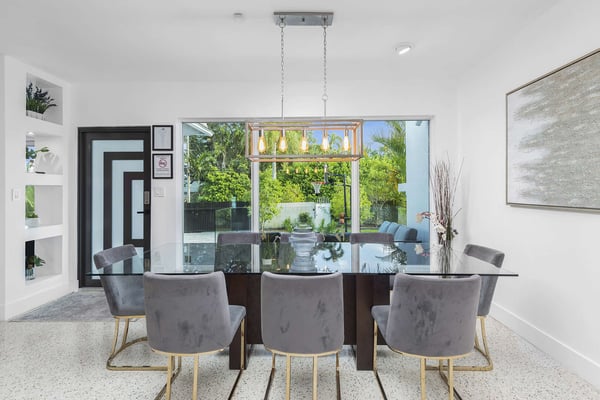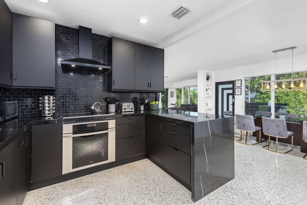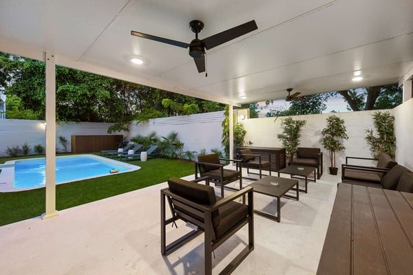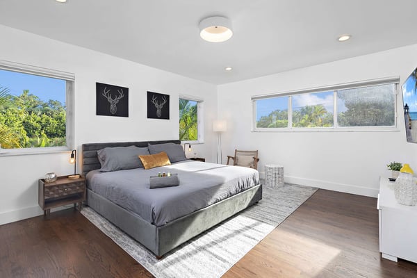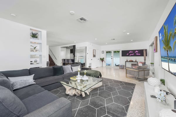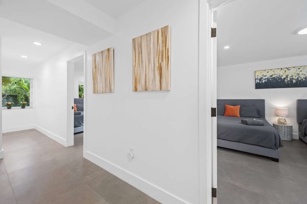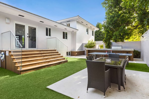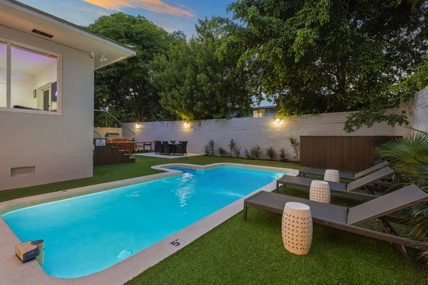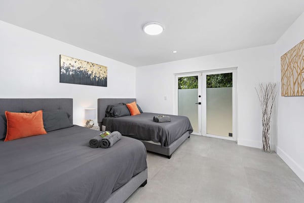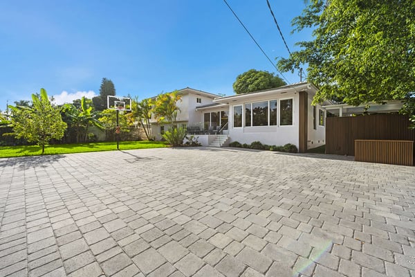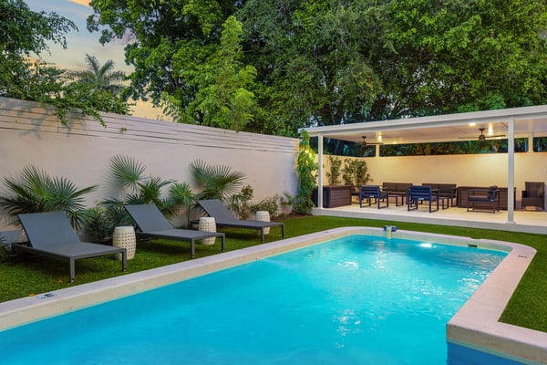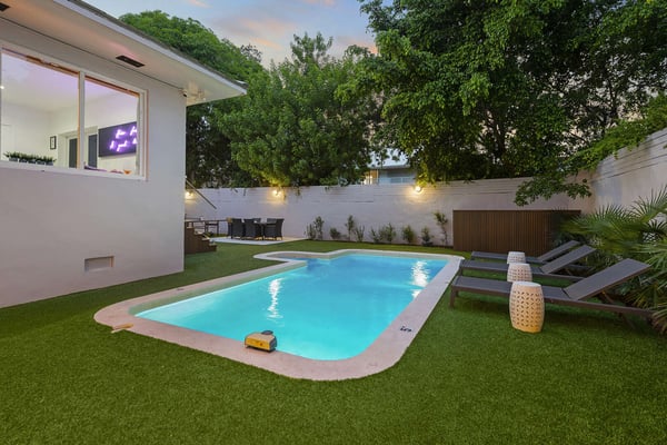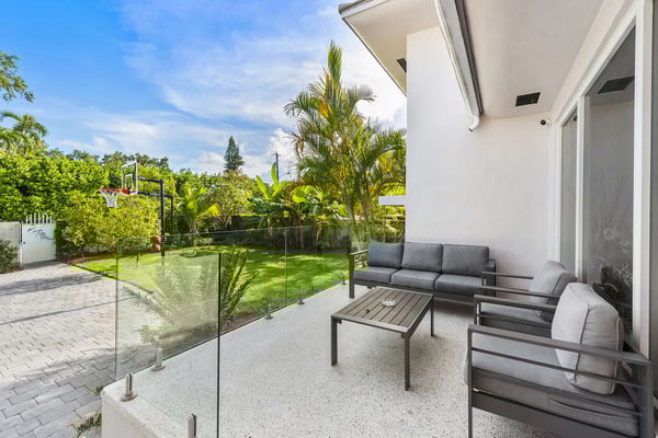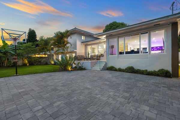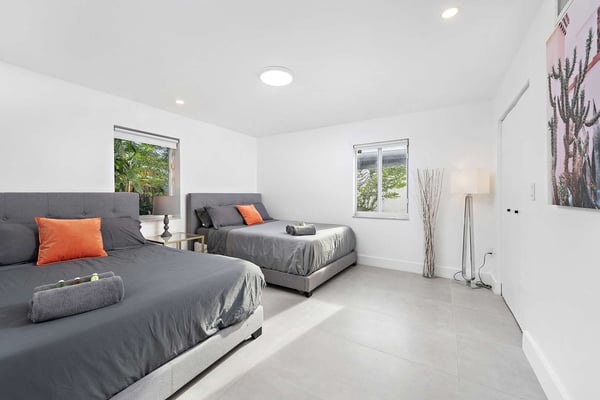 Minutes from Biscayne Boulevard and the 79th St Causeway, you're within easy reach of Wynwood, downtown Miami, and Miami Beach. This property is completely walled in for extra security and privacy. Access the property through the electric gate and keypad entry. Great outdoor space for kids to play, includes the basketball hoop, corn hole (bean bag toss), ping pong, barbecue and outdoor kitchen, outdoor dining tables, heated pool, and a covered area off of pool to lounge as well. Great floor plan for entertaining with an open layout on the main level with brand new kitchen and half bath. Two primary suites located upstairs one including a huge tub. The lower level has one full bath, two bedrooms both with two queen beds in each, and one queen bed in the other guest bedroom. The laundry room is located on the lower level with a full washer and dryer.