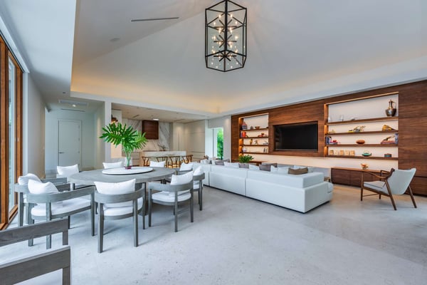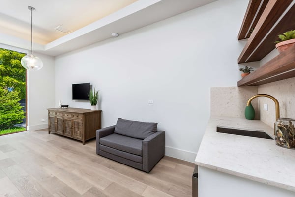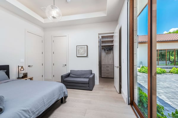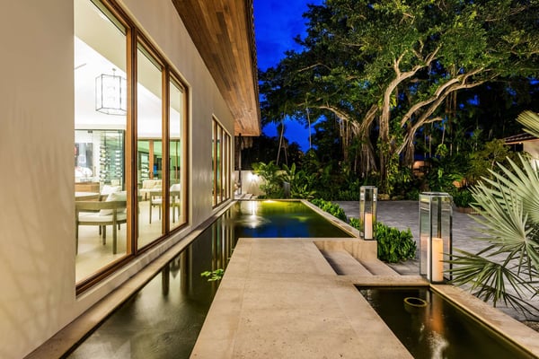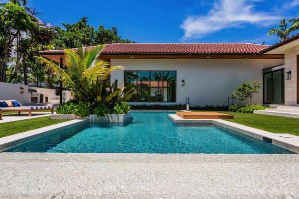 Step across the koi pond in the entryway of Villa Marya and discover a Bali-style oasis in the heart of Miami Shores. Sleek contemporary lines and an open-concept layout create an airy, fluid space amid the lush foliage of Southern Florida, perfect for enjoying cocktails around the pool or private meals from the gourmet kitchen. Minutes from Biscayne Boulevard and the 79th St. Causeway, you’re within easy reach of Wynwood, downtown Miami, and Miami Beach. The villa’s terrace and interior are seamlessly fused, with ample living areas in the sun or shade. Play under the palms or relax on hand-carved chairs from Indonesia. Spark the grill in the afternoon and gather for meals on the veranda. Linger outdoors under the evening sky, dipping into the floodlit pool and sipping drinks. The interior offers a cool counterpart to the sun-kissed terrace, with smooth marble floors, natural wood accents, and superb touches of Balinese decor and contemporary artistry. Enjoy quiet afternoons or festive evenings in the TV lounge, and savor a special dinner before a night on the town. The single-level home features 6 bedrooms. The primary suite with a king bed overlooks the pool and includes an ample ensuite bathroom. The bedroom arrangements are perfect for families, business travelers, and groups of friends seeking extra privacy amid the city’s myriad delights.
