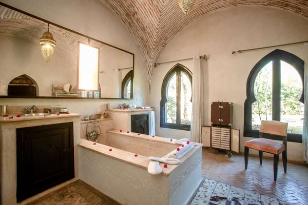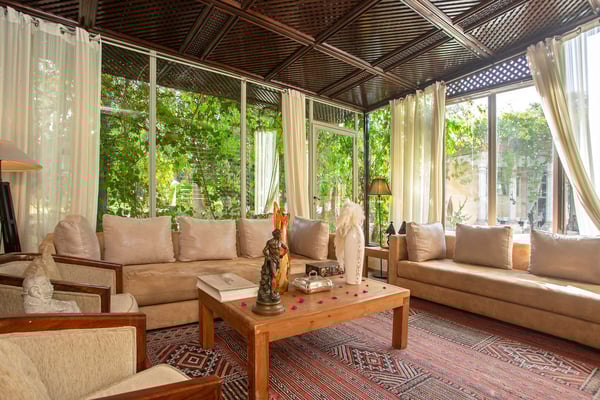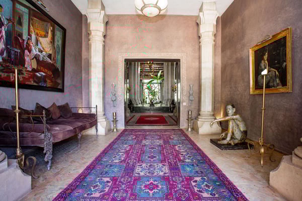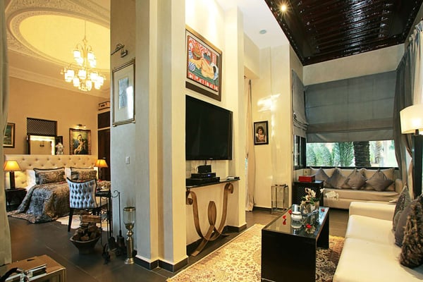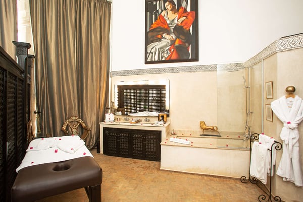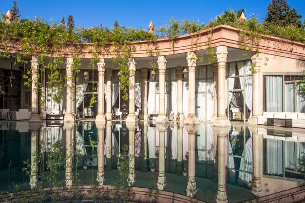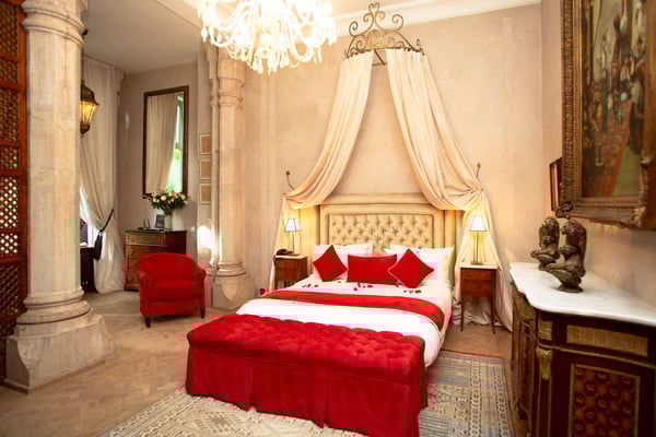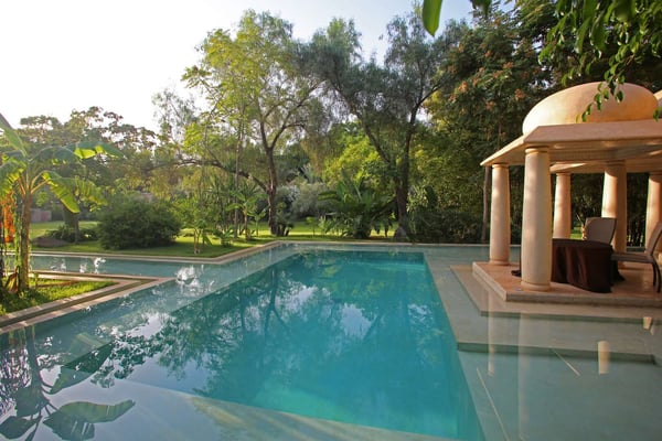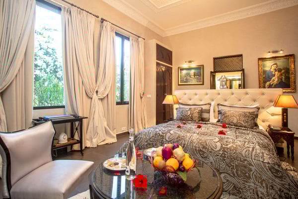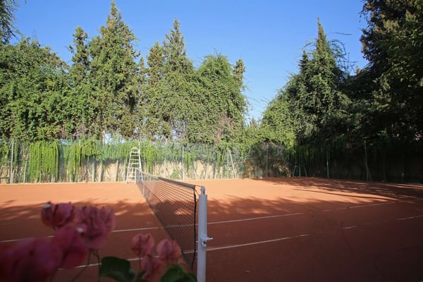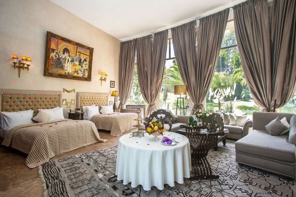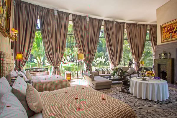 Nestled in a haven of greenery, totally secured, L'Abyssin is a mythical, very elegant and luxurious palace. The palace offers 16 bedrooms, 16 bathrooms, two outdoor swimming pools, one indoor pool, a hammam, and a tennis court, located at the door of the Red City, Marrakech. Ideal for big parties, large events, weddings, and family gatherings of up to 50 people at the palace. No charge for children under the age of five. Art lovers will enjoy an exclusive and exceptional private collection gathered by the owner who is a real ambassador of art.