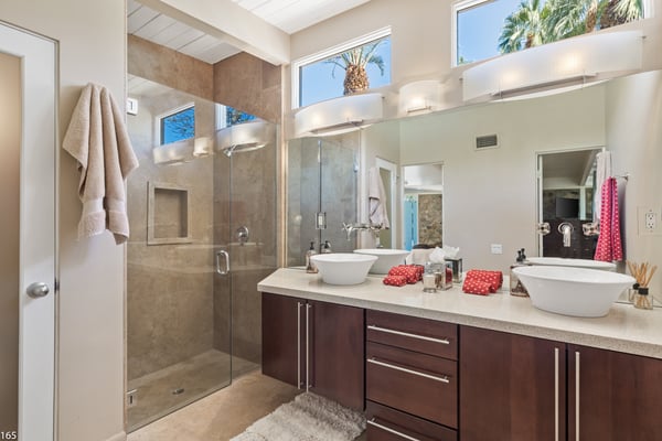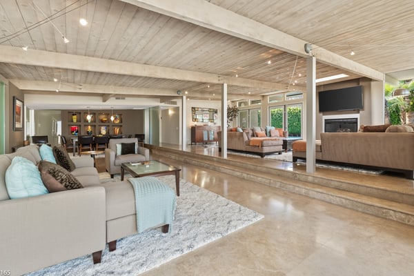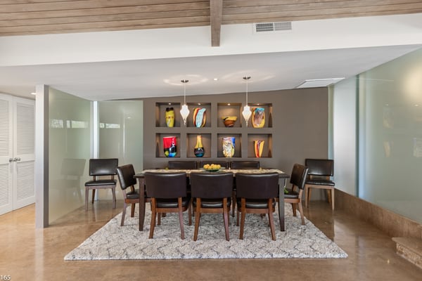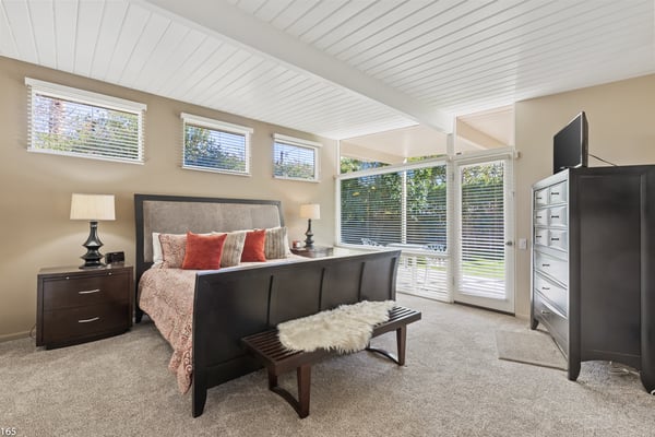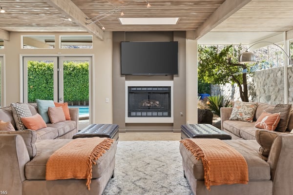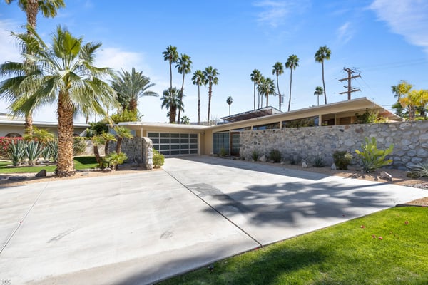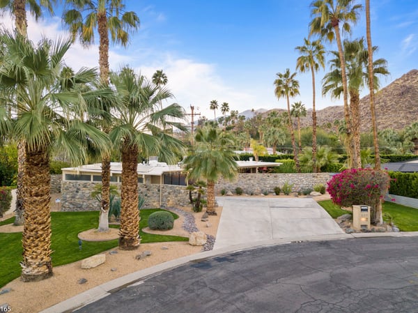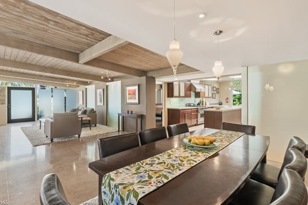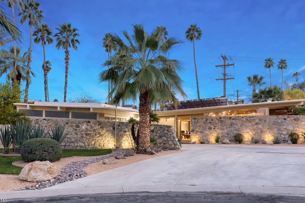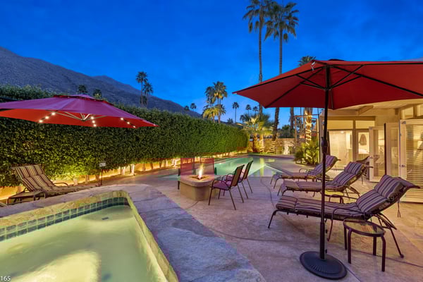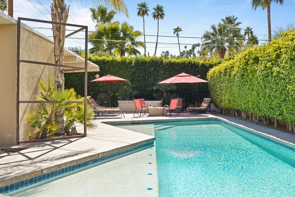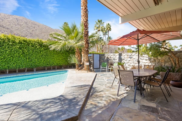 Designed by Donald Wexler, father of “desert modern” architecture, Casa Tranquillo -- once featured on HGTV -- sits at the base of the San Jacinto mountains in The Mesa, a historic neighborhood 5 minutes from downtown Palm Springs. A showcase of Wexler’s signature butterfly roof style, the home’s swimming pool also mirrors the distinctive shape. Landscaped with soaring palm trees, a ficus privacy wall and a lush side lawn with a lemon tree, the newly renovated home has kept the integrity of the Wexler design with modern updates, including tanning ledges and water features in the swimming pool. The sprawling backyard, which also has a hot tub, fire pit and 6-seat dining area with a BBQ grill, is ideal for small gatherings. Stroll along flagstone patios, soak up the famed Palm Springs sun on chaise lounge chairs, or enjoy a drink at the shaded patio table with close-up mountain views. Inside, find distinctive mid-century design elements, including travertine floors and a lighted opaque glass wall. In the unique step-up living room, sink into one of two sectional sofas by the large-screen TV and a cozy fireplace. In a separate, sunken sitting area, another sectional and coffee table offers a place to relax with a cocktail or laze with a magazine. Exposed stone and glass walls throughout create a feeling of indoor/outdoor living. For dinner indoors, seat up to 10 guests at the formal dining table, which sits next to an inspiring gallery wall of blown glass vases. Just off this area is the gourmet kitchen, which combines modern amenities with mid-century design. Find hardwood cabinets, stainless steel appliances, and four swivel chairs for leisurely mornings over coffee. Each of the bedrooms offers room to relax with an indoor or outdoor sitting area. With parking for five cars in the driveway, easily explore the surrounding area from downtown Palm Springs, a 5-minute drive, to Joshua Tree National Park, an hour away. The home also lies just 4 minutes from Indian Canyons Golf Resort and a mile from local hiking trails. As an authentic showcase of mid-century modern style in a central location, Casa Tranquillo offers a chance to experience Palm Springs architecture with easy access to its culture and recreation. Permit #165