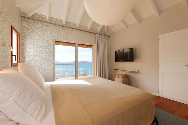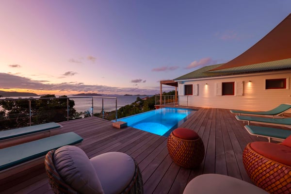 Manava is situated on the hillside of Pointe Milou. The view over the ocean, the islands and the bays of Saint Jean and Anse des Cayes is amazing. Sun lovers will be able to admire the wonderful sunsets. The pool and the terrace are overhanging the sea. The living opens onto the terrace and the view. Two of the bedrooms are accessible by the living, the two others are on the lower level. Manava is a perfect villa for vacations in Saint Barthelemy with friends or a family with teenagers.