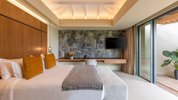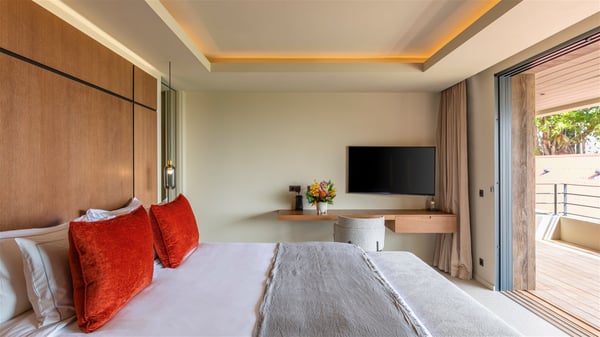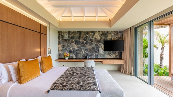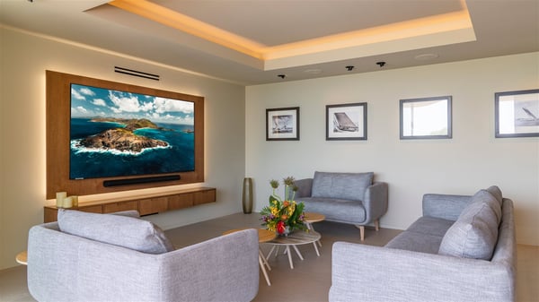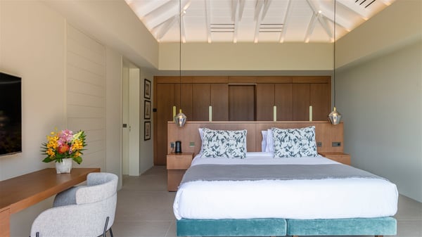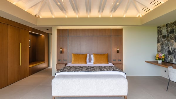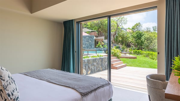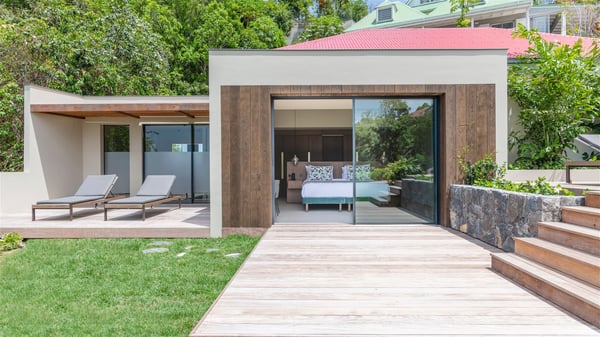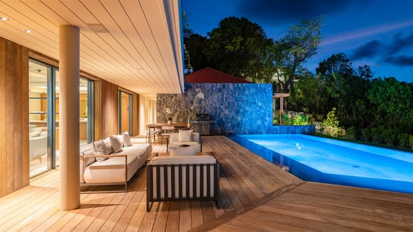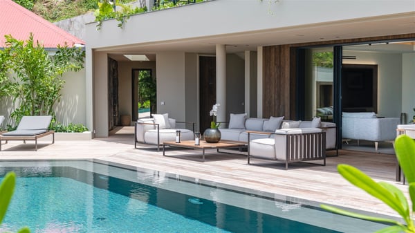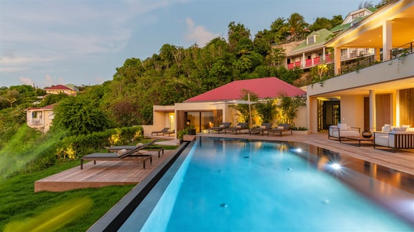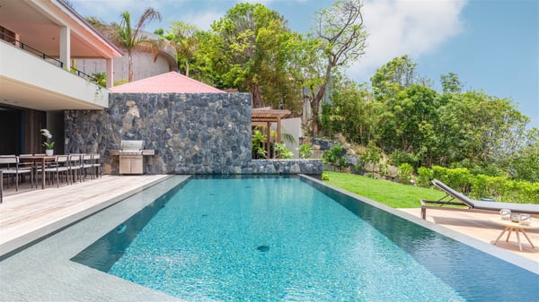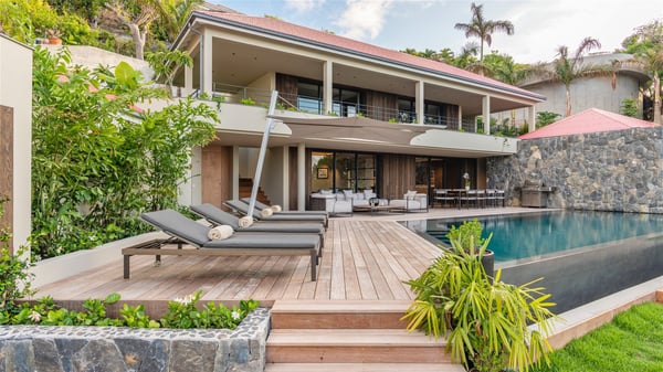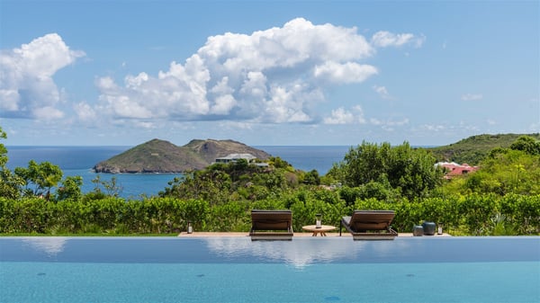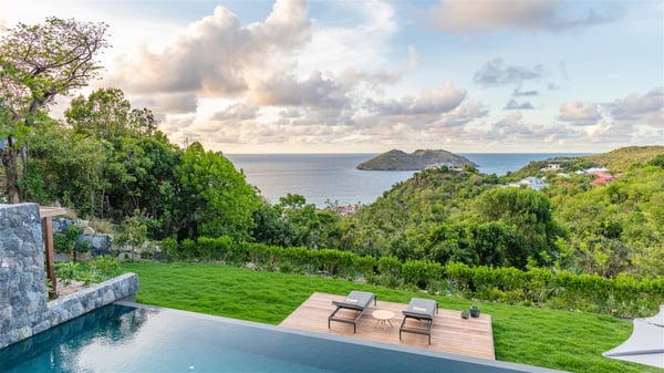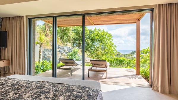 Villa Eva is a five-bedroom property located in Colombier. Surrounded by tropical vegetation, this luxurious vacation home offers a breathtakingly beautiful view over Flamands Bay and Bonhomme Islets. Spacious and fully air-conditioned, Villa Eva in St Barths welcomes families and groups of friends wishing to spend an unforgettable stay in the Caribbean. Built over two levels, the vacation rental Villa Eva is a true gem in front of the ocean. It features an air-conditioned living room open onto the terrace, and welcomes guests with comfortable sofas and an HDTV with Dish Network. The indoor space is very cozy, with bright hints that are both warm and relaxing. The kitchen is well equipped to cook meals and cocktails to be sipped either on the terrace or in the most refined lounge. Through the openings, the lush vegetation brings an elegant touch, making Villa Eva the perfect place to enjoy the mildness of St Barths. At the front, the terrace opens onto a magnificent panorama, with the sparkling waters and the islets Bonhomme on the horizon. The heated infinity swimming pool reflects the island's glow in the gentle trade winds, close to loungers and umbrellas. The nice lawn provides a romantic freshness to the whole in the extension of the wooden deck. Under the covered part of the terrace, there is a dining room which can accommodate up to ten guests near the outdoor living room with comfy sofas where you’ll enjoy the fantastic ocean view. What's more, a wall covered with gray stone brings a fine mineral touch to this outdoor space, where you will enjoy the mild air. Villa Eva consists of five air-conditioned bedrooms with bathrooms and king beds. Three of them are on the main level and open onto the terrace, while the other two bedrooms are located on the upper level accessible via a staircase, and open onto a terrace with a breathtaking view over the ocean and the idyllic environment of St Barths. You will love staying in these five very private bedrooms featuring vaulted ceilings, soft fabrics, many closets and lovely colours, after beautiful days exploring the island’s treasures. With splendid ocean views in idyllic scenery, Villa Eva is the perfect place for a luxurious vacation in St Barths with family or friends.