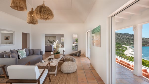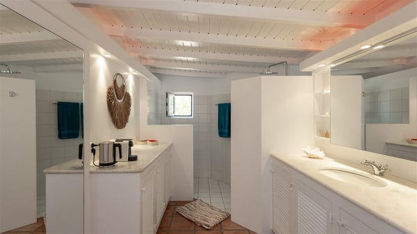 Villa Chant De L'Ocean is a three-bedroom property ideally located in Toiny in front of a breathtakingly beautiful ocean view. It overlooks the beach and offers upscale services as well as large spaces in a very private environment. Between sky and sea, villa Chant De L'Ocean welcomes groups of up to six people for an unforgettable stay in St-Barths. The holiday rental villa Chant De L'Ocean is built over three buildings and two levels. As soon as you come into the living room, you will marvel at the beauty of the stunning ocean view that can be seen from the wide openings leading to the front terrace. The lounge features a fine sofa and armchairs, with a separate television area. The kitchen is located on the side of this building and is well-equipped to cook delicious meals. It also opens onto the terrace with ocean view through a bar where you can sip a cocktail or chat, sitting on the stools outside. The terracotta floor brings a peaceful atmosphere for pleasant moments of relaxation. At the front, the terrace borders the two buildings on the main level. The outdoor dining room for eight welcomes guests to dine al fresco under the covered area in front of the spectacular view over St-Barths’ sparkling waters. The lovely swimming pool area features loungers with cushions to relax under the Caribbean sun. There is also an additional terrace below the bungalow with two of the three bedrooms, located at the end of the long, main terrace. The scenery is charming and comfy, with banquettes in front of the breathtaking view over the horizon, the perfect place to enjoy the beauty of nature. Villa Chant De L'Ocean consists of three bedrooms with en-suite bathrooms over two levels. Two bedrooms are in the building close to the swimming pool, one of which has a private lounge. The third one is in the bungalow above and can be accessed via an exterior stone staircase. The three bedrooms open onto terraces, the third of which is private. Under the vaulted ceilings, the atmosphere is soothing and the decoration is refined. Ideally located in Toiny, the vacation rental villa Chant De L'Ocean welcomes groups of up to six people in the tropical beauty for an unforgettable stay in St-Barths.