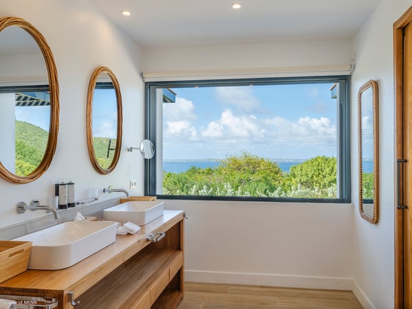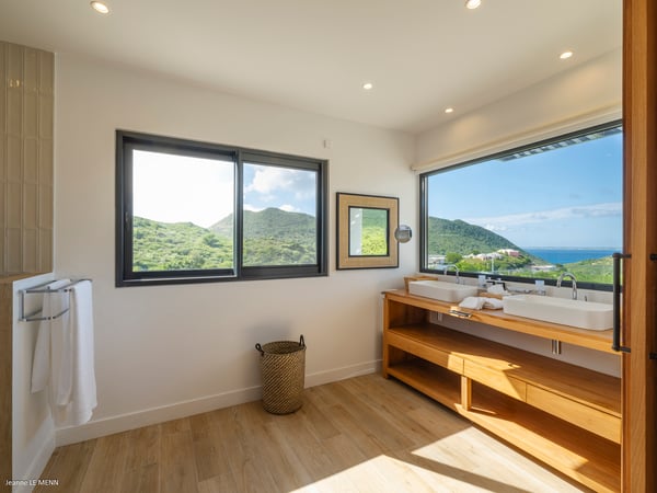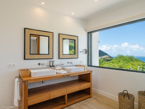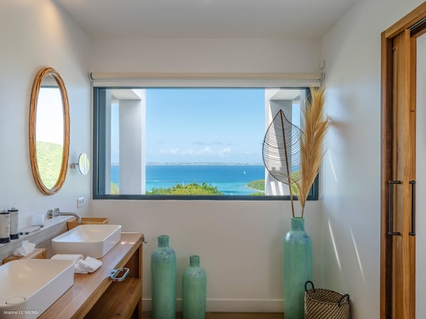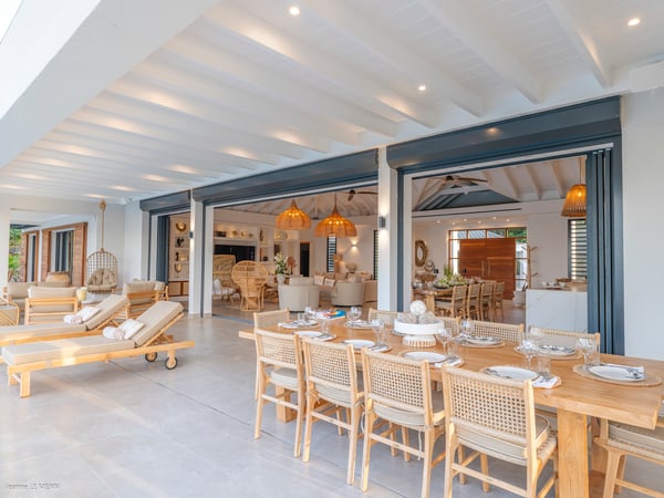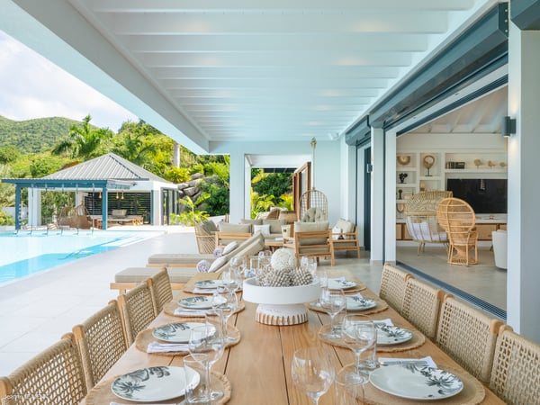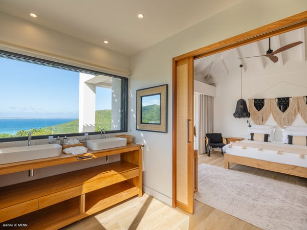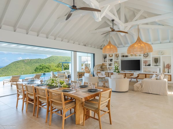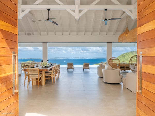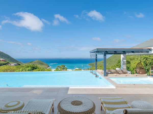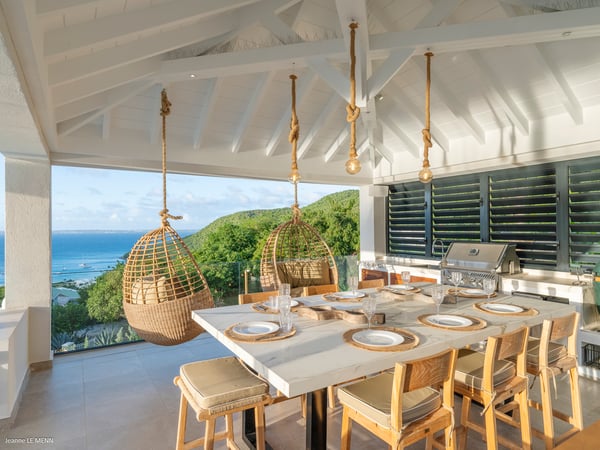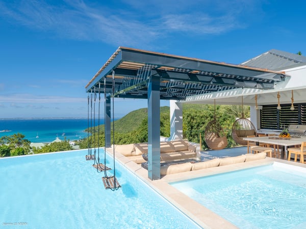 Villa Abaca is an exceptional retreat nestled in the heights of Anse Marcel, offering an idyllic setting where luxury and comfort blend seamlessly. This sumptuous five-bedroom residence captivates with its elegance and openness to the ocean, providing breathtaking views from both the shared living spaces and the private suites. From the moment you step inside, the open and luminous architecture creates a natural transition between the indoors and outdoors, evoking a sense of space and freedom. The expansive living room, bathed in natural light, enhances this harmony by seamlessly connecting to the infinity pool. The outdoor areas combine conviviality and relaxation. An elegant pergola shelters a fire pit, creating an ideal setting for enchanting evenings. Suspended swings over the water harmoniously link the pool to the outdoor living area, crafting a unique space that adapts effortlessly to your desires. Two open-air dining areas invite you to savour shared moments in this paradisiacal setting, one of which features a barbecue for exceptional gourmet experiences. The five bedrooms, all opening onto the horizon, offer absolute privacy. Each is equipped with a bright en-suite bathroom, ensuring both comfort and well-being. The primary suite stands out with a walk-in closet, designed for an elevated luxury experience. To enhance your stay, the villa offers premium leisure and wellness amenities. A fully equipped gym and a pétanque court complete the property, providing inviting spaces for moments of relaxation and conviviality with family and friends. Villa Abaca is a true invitation to escape, where every detail has been meticulously designed to offer a unique experience. In perfect harmony with the gentle way of life in Anse Marcel, it promises an exceptional stay in an intimate yet spectacular setting.