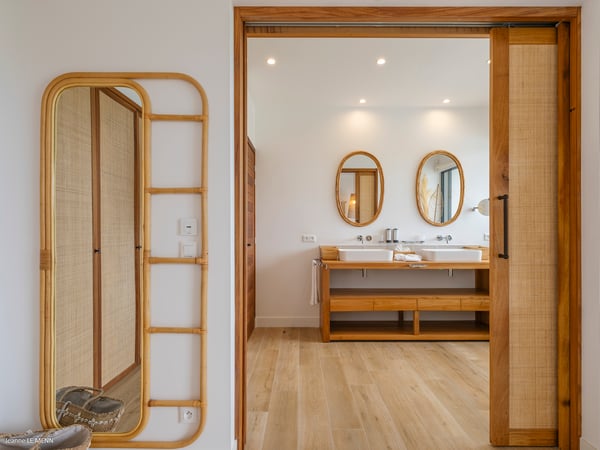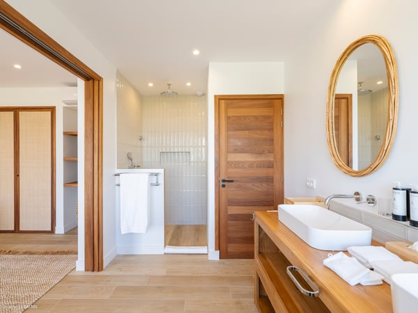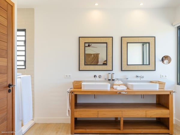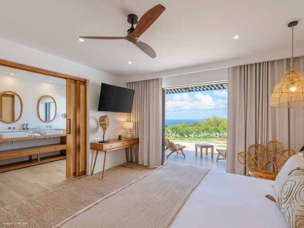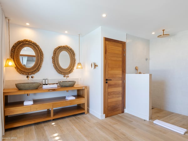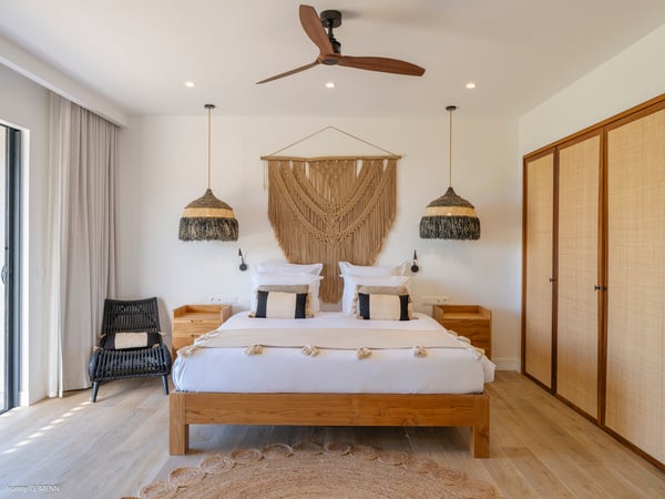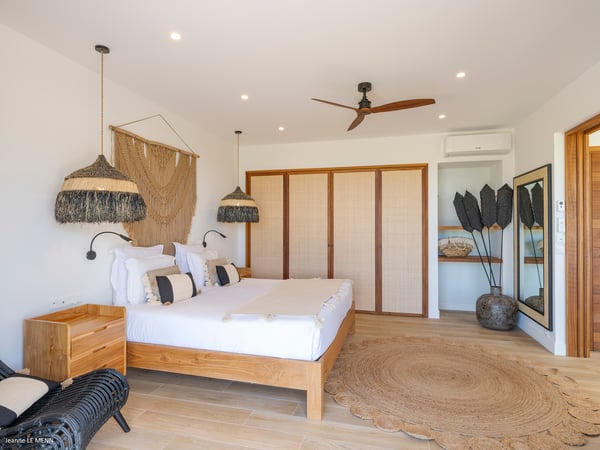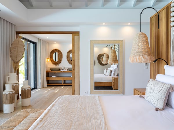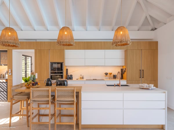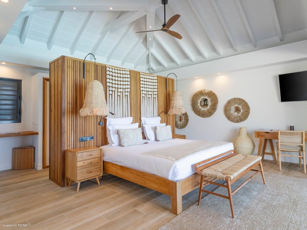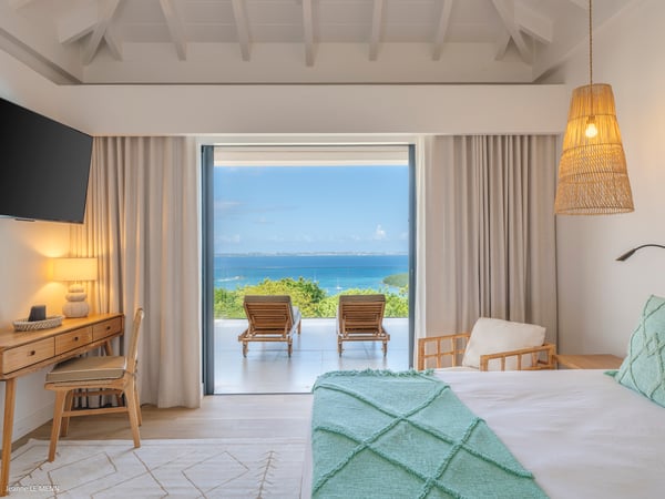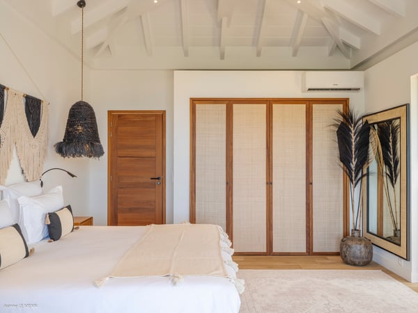 Villa Abaca is an exceptional retreat nestled in the heights of Anse Marcel, offering an idyllic setting where luxury and comfort blend seamlessly. This sumptuous five-bedroom residence captivates with its elegance and openness to the ocean, providing breathtaking views from both the shared living spaces and the private suites. From the moment you step inside, the open and luminous architecture creates a natural transition between the indoors and outdoors, evoking a sense of space and freedom. The expansive living room, bathed in natural light, enhances this harmony by seamlessly connecting to the infinity pool. The outdoor areas combine conviviality and relaxation. An elegant pergola shelters a fire pit, creating an ideal setting for enchanting evenings. Suspended swings over the water harmoniously link the pool to the outdoor living area, crafting a unique space that adapts effortlessly to your desires. Two open-air dining areas invite you to savour shared moments in this paradisiacal setting, one of which features a barbecue for exceptional gourmet experiences. The five bedrooms, all opening onto the horizon, offer absolute privacy. Each is equipped with a bright en-suite bathroom, ensuring both comfort and well-being. The primary suite stands out with a walk-in closet, designed for an elevated luxury experience. To enhance your stay, the villa offers premium leisure and wellness amenities. A fully equipped gym and a pétanque court complete the property, providing inviting spaces for moments of relaxation and conviviality with family and friends. Villa Abaca is a true invitation to escape, where every detail has been meticulously designed to offer a unique experience. In perfect harmony with the gentle way of life in Anse Marcel, it promises an exceptional stay in an intimate yet spectacular setting.