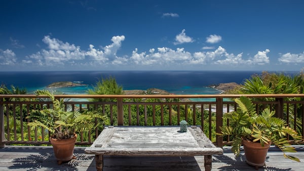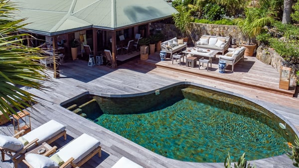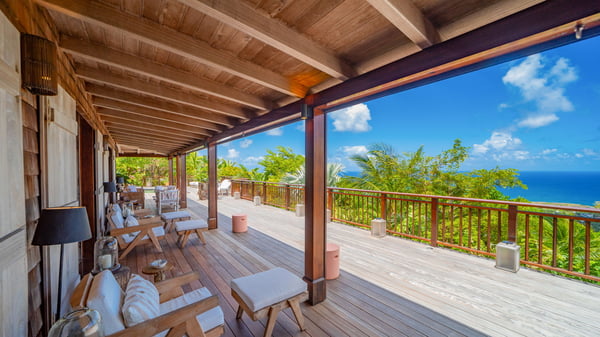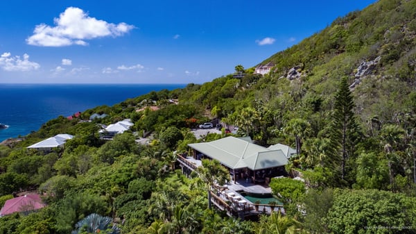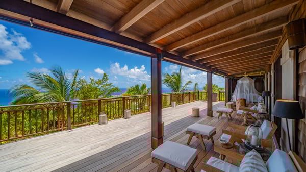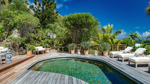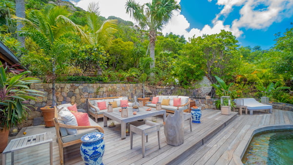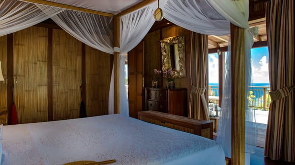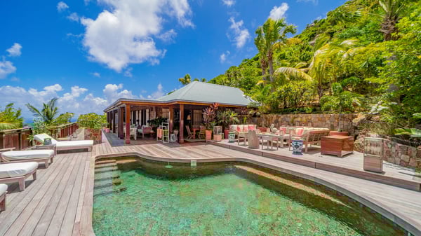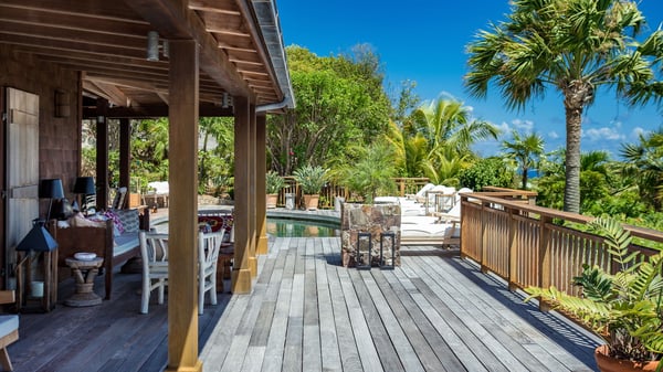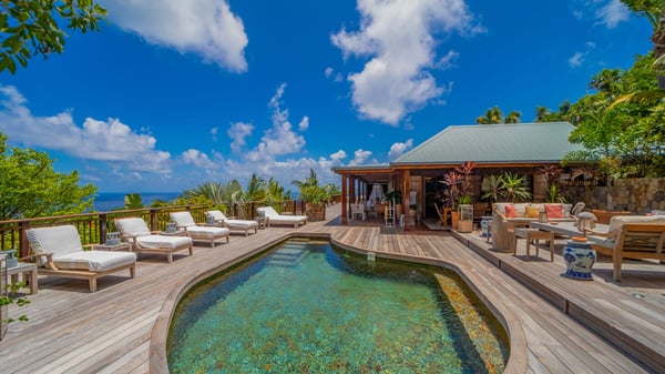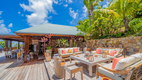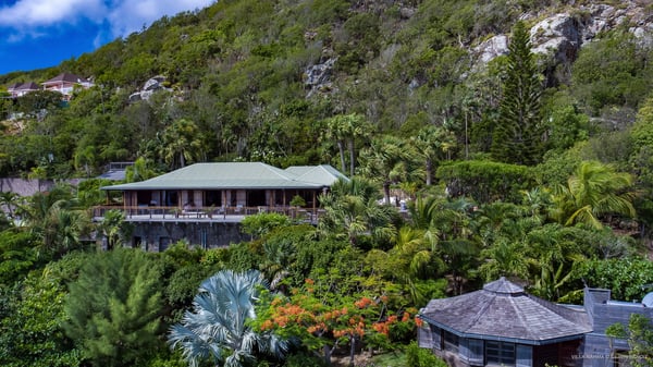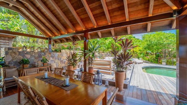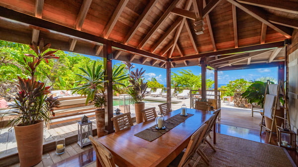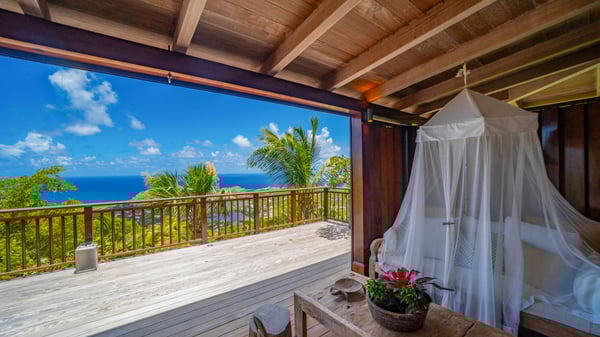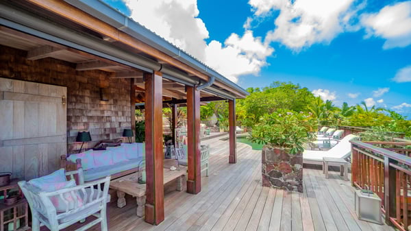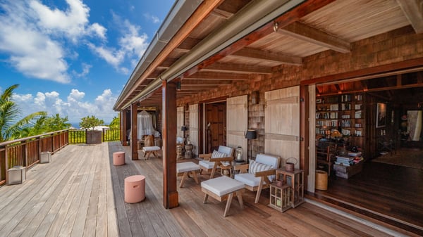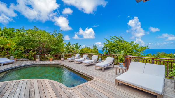 Villa Nahma is a luxurious property nestled in the beautiful natural environment of St-Barths. Spacious and very private, this four-bedroom home with a swimming pool offers upscale amenities for a fantastic Caribbean getaway. Ideally located in Vitet with a splendid ocean view, the villa rental Nahma is the dream location for an idyllic stay for eight in St-Barths. Built over two levels and featuring a main building and a bungalow, villa Nahma welcomes its guests in a typical Caribbean ambiance. The use of wood, exposed beams and great libraries create a cozy atmosphere. The living area is furnished with sofas and armchairs, softened lit lamps, and weathered-wood items, and the bright, fully-equipped kitchen is illuminated by a skylight. A long hallway leads to the outside, allowing a gentle light to shine through this comfy indoor space, perfect to rest and quietly relax. At the front and side of the villa, you’ll find the lovely terrace amidst the rolling hills of St-Barths. The heated swimming pool shines bright on the deck, which is furnished with sun loungers covered with cushions. A step higher, connected to the indoor space, the al fresco dining area welcomes you under the covered part of the terrace, in a setting of wood and cushions, close to the outdoor lounge with sofas and a coffee table. From here, the ocean view is breathtakingly beautiful. On the front façade gently blown by the trade winds, a covered terrace furnished with colourful sofas and cushions opens to a spectacular ocean panorama. The vacation rental Nahma consists of four air-conditioned bedrooms with en-suite bathrooms and king-size or twin beds. Located near the living room, the primary bedroom is furnished with a canopy bed and offers a beautiful sea view. Behind the primary, the second bedroom has a private entrance from the garden. The third bedroom is in a separate bungalow accessible via a garden path, and the fourth bedroom with a private terrace is located on the lower level of the main building. The mahogany floors, marble bathrooms, and decor featuring original items create a unique atmosphere for a fantastic stay at Villa Nahma. In a lush, fantastic environment, villa Nahma is the perfect place for an unforgettable stay for eight people in St-Barths.