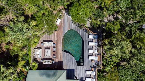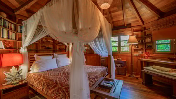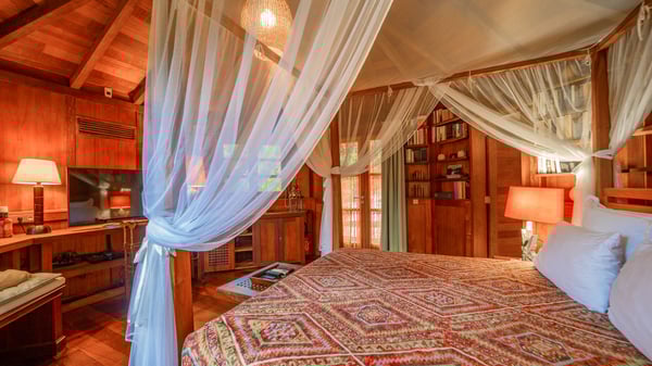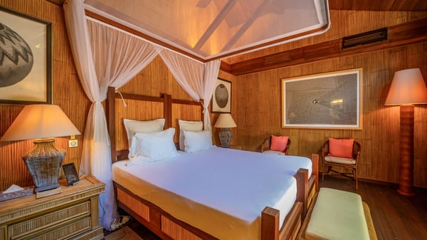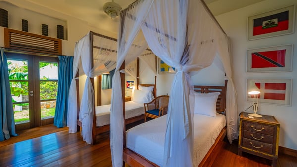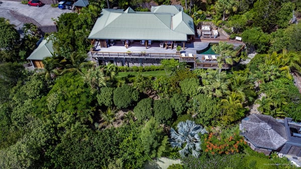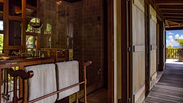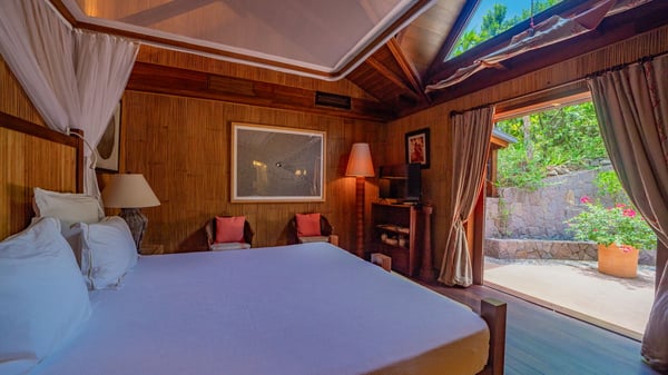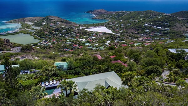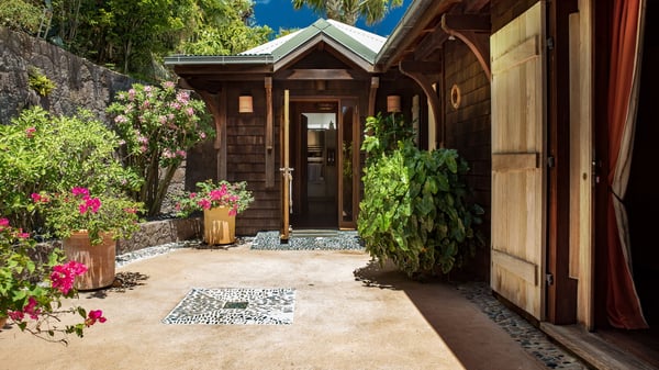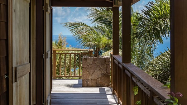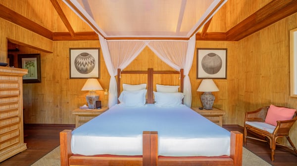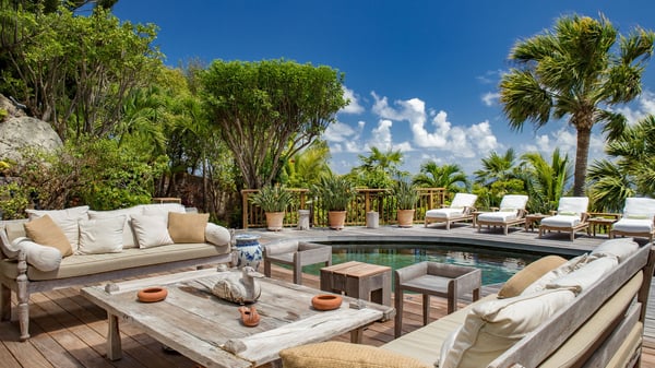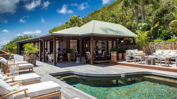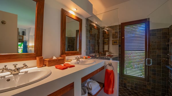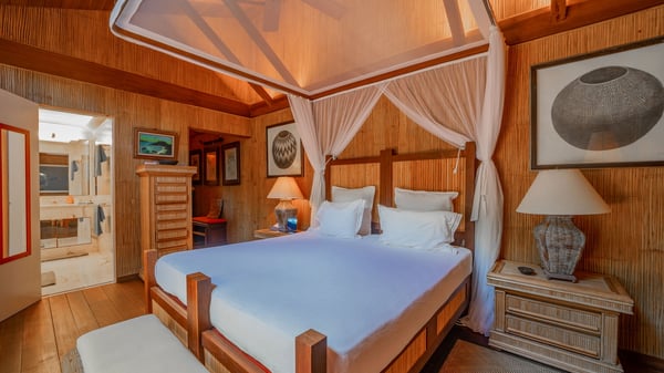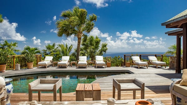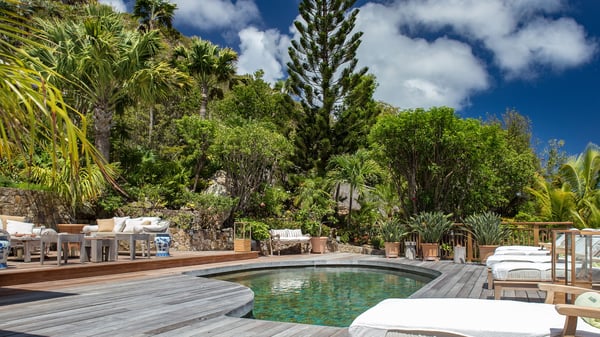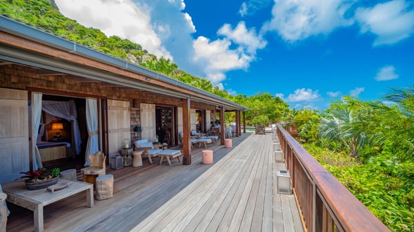 Villa Nahma is a luxurious property nestled in the beautiful natural environment of St-Barths. Spacious and very private, this four-bedroom home with a swimming pool offers upscale amenities for a fantastic Caribbean getaway. Ideally located in Vitet with a splendid ocean view, the villa rental Nahma is the dream location for an idyllic stay for eight in St-Barths. Built over two levels and featuring a main building and a bungalow, villa Nahma welcomes its guests in a typical Caribbean ambiance. The use of wood, exposed beams and great libraries create a cozy atmosphere. The living area is furnished with sofas and armchairs, softened lit lamps, and weathered-wood items, and the bright, fully-equipped kitchen is illuminated by a skylight. A long hallway leads to the outside, allowing a gentle light to shine through this comfy indoor space, perfect to rest and quietly relax. At the front and side of the villa, you’ll find the lovely terrace amidst the rolling hills of St-Barths. The heated swimming pool shines bright on the deck, which is furnished with sun loungers covered with cushions. A step higher, connected to the indoor space, the al fresco dining area welcomes you under the covered part of the terrace, in a setting of wood and cushions, close to the outdoor lounge with sofas and a coffee table. From here, the ocean view is breathtakingly beautiful. On the front façade gently blown by the trade winds, a covered terrace furnished with colourful sofas and cushions opens to a spectacular ocean panorama. The vacation rental Nahma consists of four air-conditioned bedrooms with en-suite bathrooms and king-size or twin beds. Located near the living room, the primary bedroom is furnished with a canopy bed and offers a beautiful sea view. Behind the primary, the second bedroom has a private entrance from the garden. The third bedroom is in a separate bungalow accessible via a garden path, and the fourth bedroom with a private terrace is located on the lower level of the main building. The mahogany floors, marble bathrooms, and decor featuring original items create a unique atmosphere for a fantastic stay at Villa Nahma. In a lush, fantastic environment, villa Nahma is the perfect place for an unforgettable stay for eight people in St-Barths.