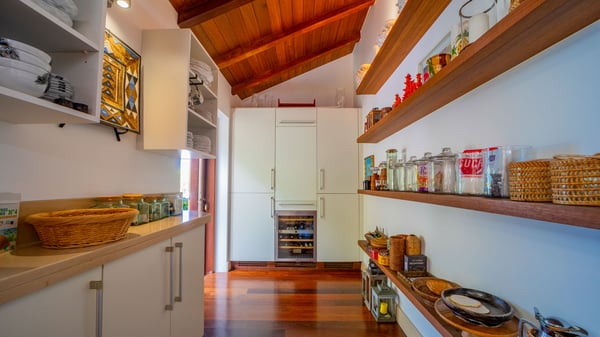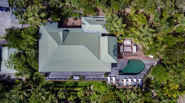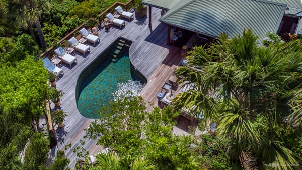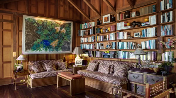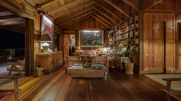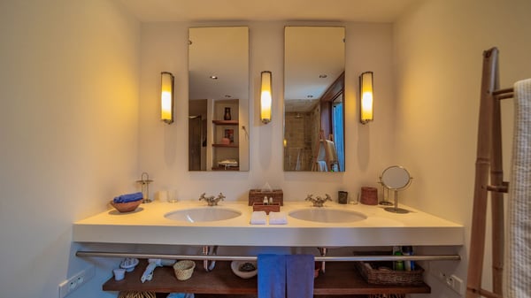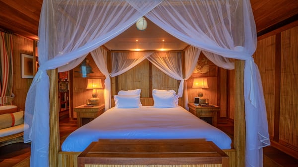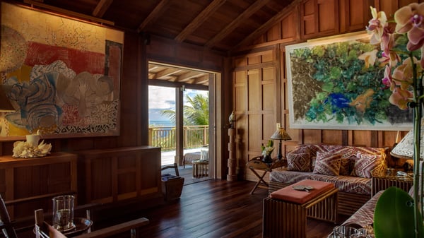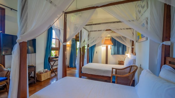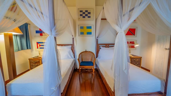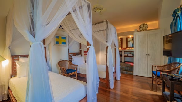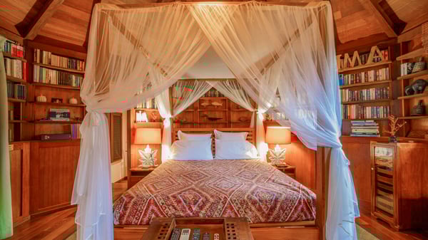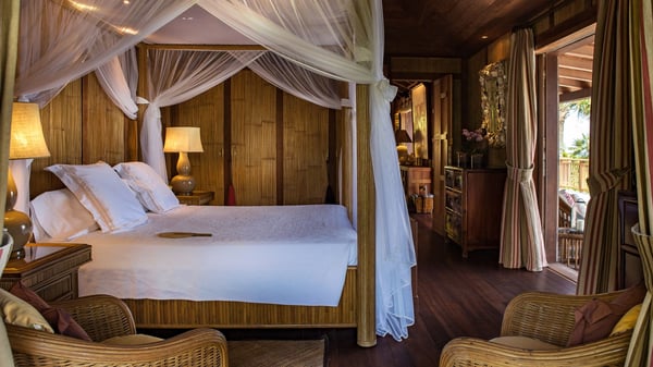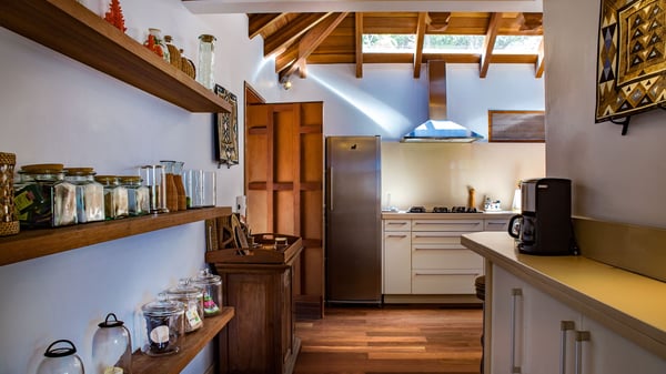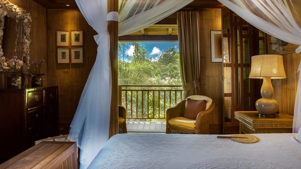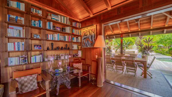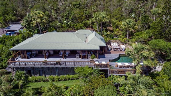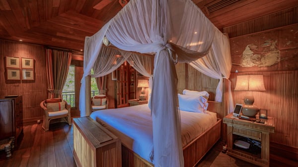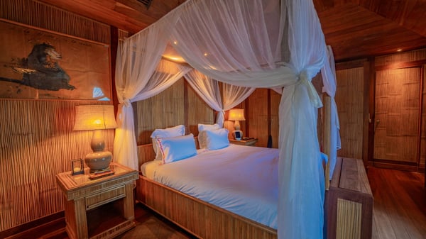 Villa Nahma is a luxurious property nestled in the beautiful natural environment of St-Barths. Spacious and very private, this four-bedroom home with a swimming pool offers upscale amenities for a fantastic Caribbean getaway. Ideally located in Vitet with a splendid ocean view, the villa rental Nahma is the dream location for an idyllic stay for eight in St-Barths. Built over two levels and featuring a main building and a bungalow, villa Nahma welcomes its guests in a typical Caribbean ambiance. The use of wood, exposed beams and great libraries create a cozy atmosphere. The living area is furnished with sofas and armchairs, softened lit lamps, and weathered-wood items, and the bright, fully-equipped kitchen is illuminated by a skylight. A long hallway leads to the outside, allowing a gentle light to shine through this comfy indoor space, perfect to rest and quietly relax. At the front and side of the villa, you’ll find the lovely terrace amidst the rolling hills of St-Barths. The heated swimming pool shines bright on the deck, which is furnished with sun loungers covered with cushions. A step higher, connected to the indoor space, the al fresco dining area welcomes you under the covered part of the terrace, in a setting of wood and cushions, close to the outdoor lounge with sofas and a coffee table. From here, the ocean view is breathtakingly beautiful. On the front façade gently blown by the trade winds, a covered terrace furnished with colourful sofas and cushions opens to a spectacular ocean panorama. The vacation rental Nahma consists of four air-conditioned bedrooms with en-suite bathrooms and king-size or twin beds. Located near the living room, the primary bedroom is furnished with a canopy bed and offers a beautiful sea view. Behind the primary, the second bedroom has a private entrance from the garden. The third bedroom is in a separate bungalow accessible via a garden path, and the fourth bedroom with a private terrace is located on the lower level of the main building. The mahogany floors, marble bathrooms, and decor featuring original items create a unique atmosphere for a fantastic stay at Villa Nahma. In a lush, fantastic environment, villa Nahma is the perfect place for an unforgettable stay for eight people in St-Barths.