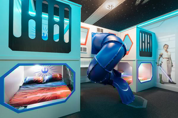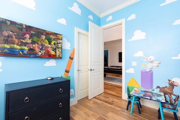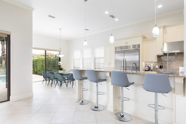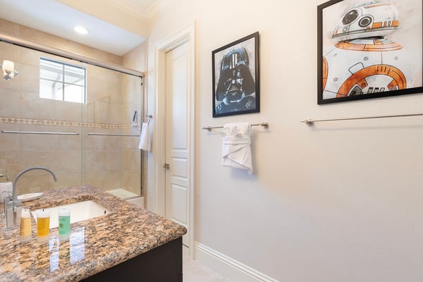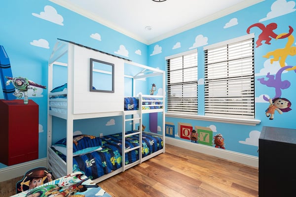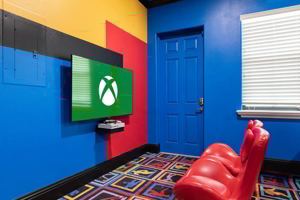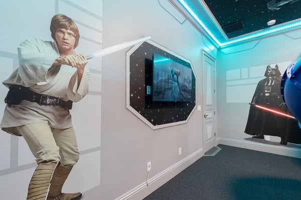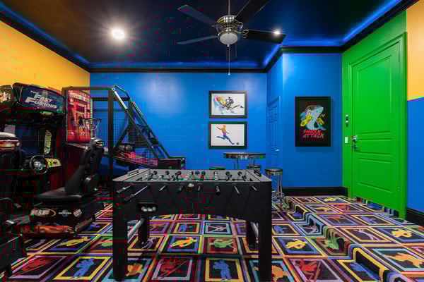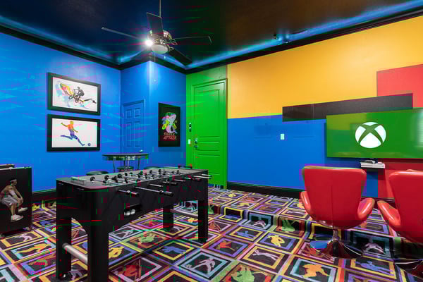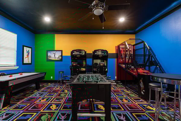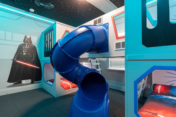This elegant and sophisticated 6-bedroom villa is designed to offer you and your family the ultimate Orlando vacation experience. The open-concept living area serves as the heart of the home, perfect for family gatherings. It features plush seating, including a cozy sectional and stylish accent chairs, all centered around a beautiful fireplace—an ideal spot to recount the day's adventures. The fully equipped kitchen includes a four-seat breakfast bar for casual dining, as well as a spacious dining table for eight, perfect for meals at any time of day. Additionally, a formal dining table that seats ten provides an elegant setting for special occasions. Accommodating up to 16 guests, this home offers well-appointed bedrooms across two floors. The ground floor boasts a luxurious king-sized suite, while the second floor features a bedroom with two queen-sized beds and an adjoining bathroom. Upstairs, you'll also find two lavish king-sized suites, a galactic-themed bedroom with two sets of bunk beds (four full-sized beds), and an en suite Jack and Jill bathroom connecting to another themed bedroom with bunk beds (two twin-sized beds). Endless entertainment awaits within this home, starting with the upstairs loft, which is equipped with a pool and shuffleboard table. The games room offers even more fun, featuring an air hockey and foosball table, basketball shooting game, and two arcade racing games for hours of friendly competition. Outside, the private deck invites you to unwind with a refreshing swimming pool and spillover spa, as well as a BBQ and fire pit, perfect for hosting gatherings and enjoying the Florida sunshine.