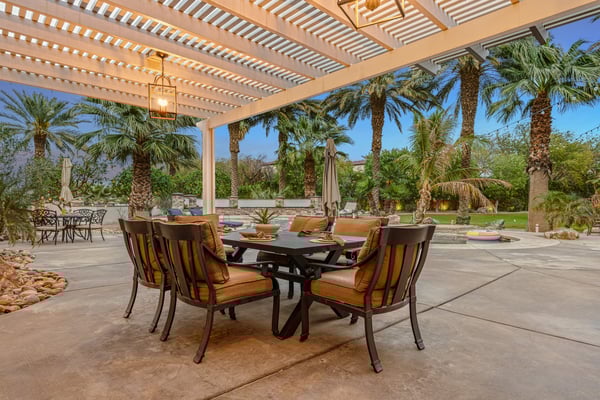 Nestled in the exclusive enclave of Bermuda Dunes, Coachella Dunes Estate is a private paradise where luxury meets the breathtaking beauty of the Coachella Valley. Designed for grand gatherings, unforgettable celebrations, and serene retreats, this multi-million-dollar estate offers a sophisticated escape just moments from world-renowned music festivals, championship golf courses, and the desert's most sought-after attractions. Step into an expansive outdoor haven that seamlessly blends elegance with relaxation. The private, resort-style pool sparkles under the California sun, inviting you for a refreshing dip before unwinding in the bubbling hot tub. Tall, swaying palm trees create a lush and intimate ambiance, while an outdoor fireplace sets the perfect mood for starlit conversations. Gather your guests around the sprawling patio with ample seating, enjoy al fresco meals in the outdoor dining area, and sip cocktails at the grilling and prep station with barstool seating, ensuring the cook is never without company. For a little friendly competition, take advantage of the pickleball net set up in the barn—perfect for an impromptu match and some active fun during your stay. Inside, the estate showcases contemporary-chic design with classic architectural details, including striking beamed ceilings that add warmth and character. The living room invites relaxation with plush seating and a large television, perfect for unwinding after a day of exploring. Gather around the banquet-style dining table for elegant dinners, or enjoy a more casual meal at the charming breakfast nook. The fully equipped gourmet kitchen boasts top-of-the-line appliances, generous counter space, and everything needed to prepare meals for large groups with ease. You'll also find a drip coffee maker and Keurig K-cup machine to get your coffee fix. Five beautifully appointed bedrooms provide each guest with a private sanctuary. The primary suite is a true retreat, featuring a spa-like ensuite bathroom complete with a huge soaking tub, perfect for indulgent relaxation. A dedicated bunk room offers flexible sleeping arrangements, making it ideal for kids or groups. Every room is designed with comfort in mind, ensuring restful nights and refreshed mornings. Situated just a short drive from Coachella and Stagecoach festival grounds, Coachella Dunes Estate offers an unmatched home base for music lovers seeking an upscale retreat during festival season. Golf enthusiasts will appreciate the proximity to world-class courses, while foodies and shoppers will delight in nearby Palm Desert's El Paseo, known as the "Rodeo Drive of the Desert." With endless outdoor adventures, renowned spas, and stunning desert landscapes at your fingertips, every moment at Coachella Dunes Estate is an opportunity to experience the magic of the Coachella Valley. Whether you're planning a sun-soaked getaway or a serene retreat, Coachella Dunes Estate delivers an unparalleled experience of privacy, luxury, and effortless sophistication. Book your stay and discover the ultimate desert escape. Located 100 miles east of Los Angeles, Coachella Valley is an oasis for those looking for an escape from the daily grind. Surrounded by picturesque vistas and mountains, as well as an abundance of golf courses, spas, and hiking trails–this desert destination is a must-visit. It's also the location for the nation's most famous music event, the Coachella Music & Arts Festival. No matter what time of year, there's always something exciting going on. This is a smoke-free property. Violation of the no-smoking policy will result in forfeiture of the security deposit, a $300 smoking fee, and liability for any fire or property damage costs. As part of our commitment to being good neighbours, occupancy limits and quiet hours (9pm-8am) are strictly enforced. No speakers or sound systems will be provided for use in our properties. Violation of any noise ordinances will be subject to fines that can reach up to $10,000 per violation. Events or parties are not allowed without prior written approval and an additional fee. Any unauthorized parties or events will be shut down, and a fine will be assessed. Please inquire for more information about our event policies and fees. We've enhanced our cleaning and sanitation protocols and are taking extra care to disinfect all surfaces between reservations with hospital-grade disinfecting solutions. STR Permit No. P-003594