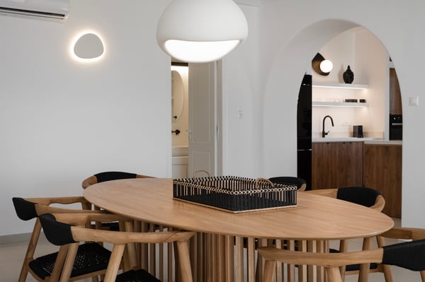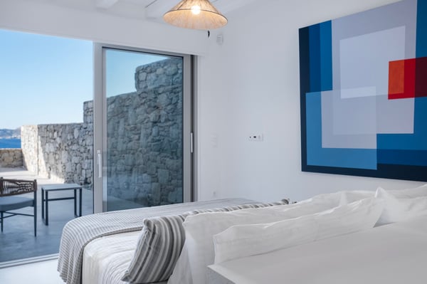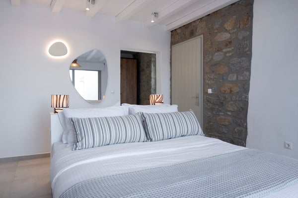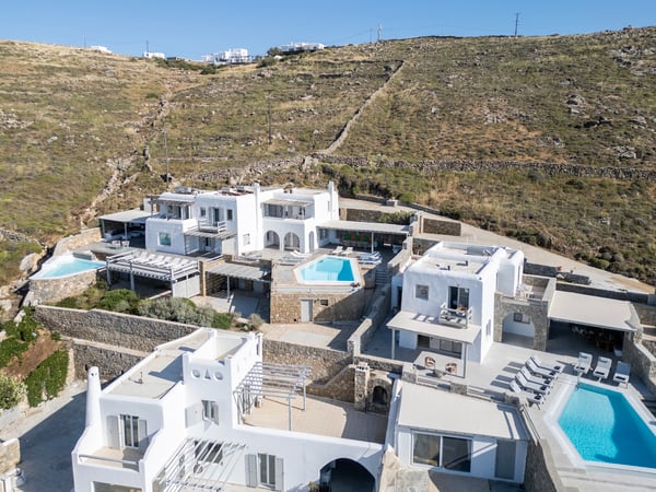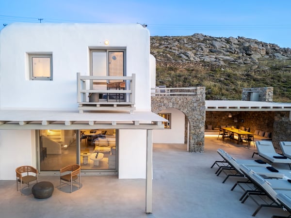Set in the prestigious area of Kanalia in Mykonos, this newly built luxury villa offers a refined retreat just minutes from Mykonos Town. Positioned at the top of the hill, it ensures exceptional privacy while capturing uninterrupted sunset views over the Aegean Sea and the iconic island of Delos. Designed to reflect the essence of the Cycladic aesthetic, the property blends clean architectural lines with abundant natural light and expansive sea vistas, delivering an authentic yet elevated Mykonian living experience. Spanning 160 sq. m. on a 500 sq. m. plot, the villa accommodates up to eight guests across four well-appointed bedrooms and four bathrooms. The entrance level features a bright living area with large openings leading directly to the pool terrace, a dining space, a fully equipped kitchen connected to the outdoor dining area, and an independent guest suite with a private bathroom and sea views. Upstairs, the primary bedroom offers an en-suite bathroom and private balcony, while two additional double bedrooms share a bathroom and enjoy direct views to the Aegean. Outdoors, a private swimming pool, sun loungers, a shaded pergola dining area, and lounge spaces create a seamless indoor-outdoor lifestyle. The property includes private parking for two cars, daily maid service, premium amenities, and full maintenance support.