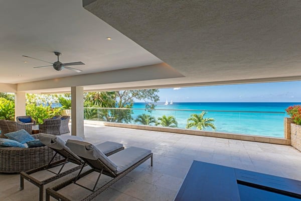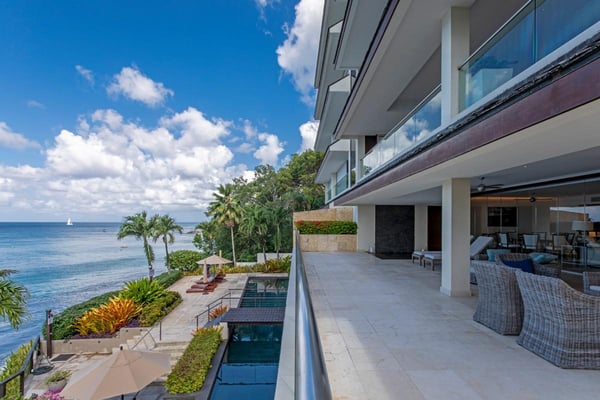Portico 1 is an impressive oceanfront property offering three bedrooms, three and a half bathrooms within 3,500 square feet of living space featuring cutting-edge finishes, luxurious furnishings and outstanding amenities. The apartment features a 40 ft. wide private terrace with a plunge pool and glass balustrade, providing unparalleled views of the ocean. Enjoy the private gym and sauna, 80-foot lap pool. Winner of three prestigious, 5-star International Property Awards for Best Architecture, Best Development and Best Apartment in the Caribbean. Portico is distinguished by its outstanding finishes, revolutionary design and modern take on island living. Located on the serene and picturesque Prospect Bay in St. James, Barbados. Portico stands as a true personification of sophistication and state-of-the-art living that is distinct from any other residential development on the island's West Coast. The development's extraordinary architecture makes way for a lifestyle that will be enjoyed by a select few; with just two units on each of the 5 floors, owners are sure to enjoy a level of privacy and exclusivity unparalleled on the island. The tropical modern style was conceptualized to merge the interior living space with the property's stunning environs; glass balustrades and ample windows offer uninterrupted views of the stunning Caribbean Sea. The remarkable lifestyle that Portico offers will undoubtedly surpass expectations, with an impressive array of amenities, 5-star concierge services and steadfast dedication to both personal and environmental well-being. The uniqueness of Portico extends beyond its architecture and indulgent lifestyle. Its facilities are nothing short of spectacular, ensuring residences the best that innovation has to offer.