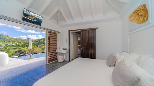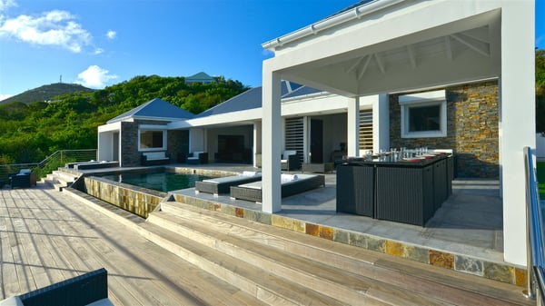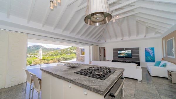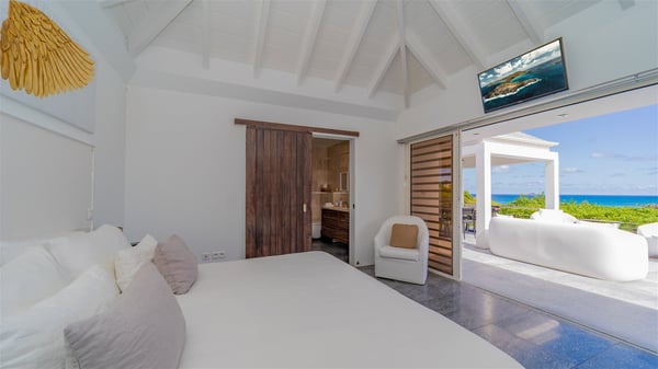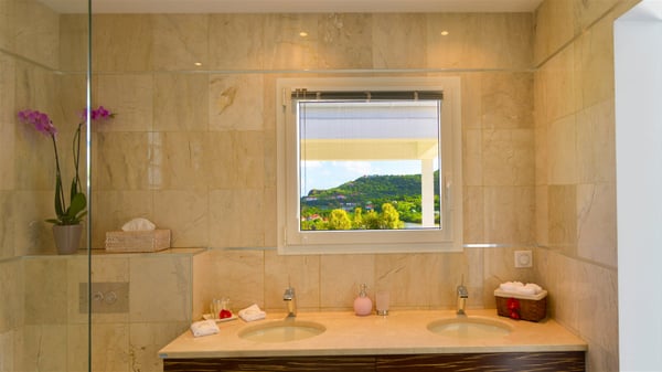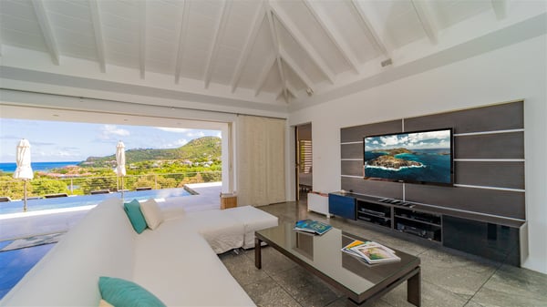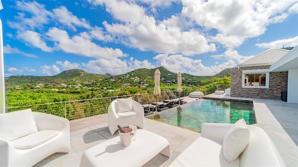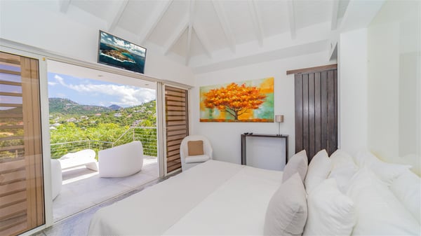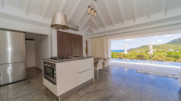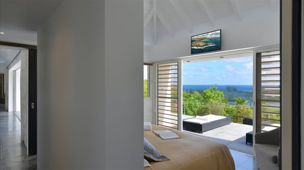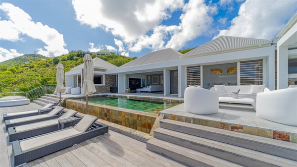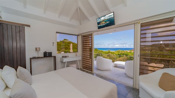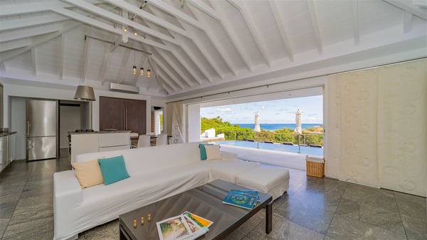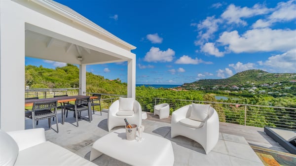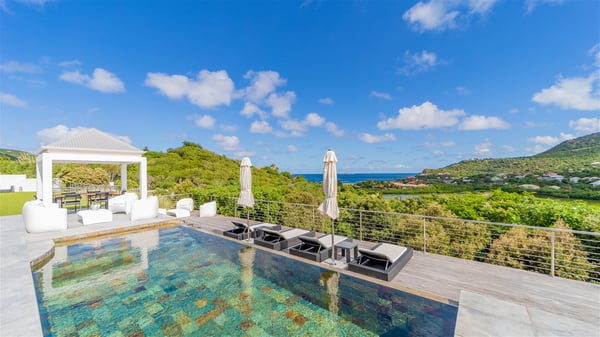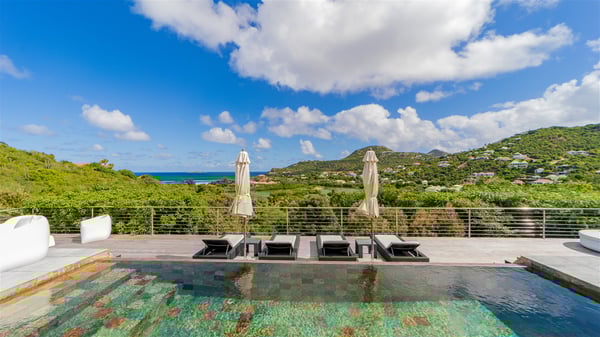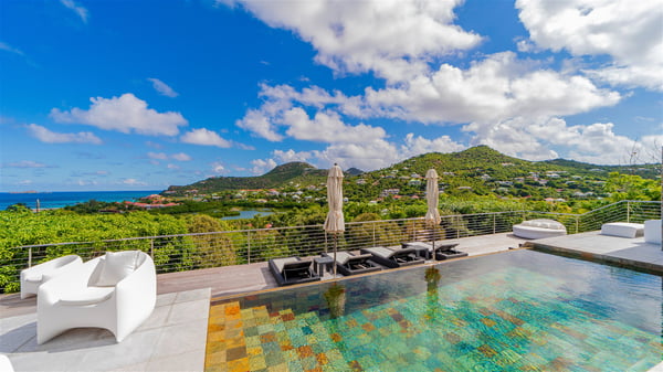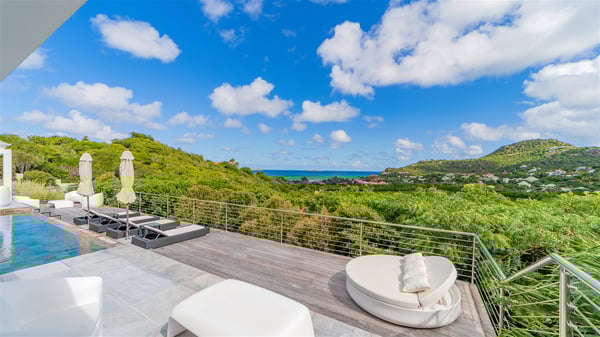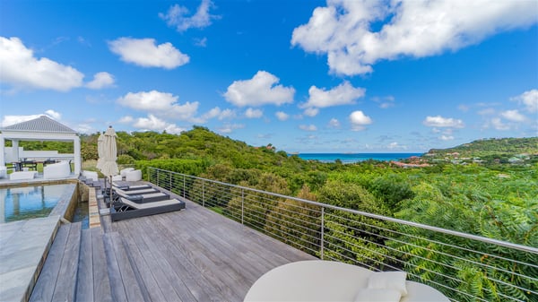 Located in Saint Jean, nestled on a hillside, Aya offers an amazing view over the bay and the deep blue ocean. Close to the beaches and shops, this charming two-bedroom vacation home is the ideal place for a fantastic stay in the Caribbean with family or friends. The comfortable and bright living room of Aya opens onto the terrace through large windows that let the view over the ocean and the surrounding nature shine through. Comfy sofas and benches are around a coffee table perfect for relaxing moments reading a book or talking over a coffee. In the extension, there is a beautiful, well-equipped kitchen coming with a welcoming dining space for four people. It overlooks the terrace in the mild air that sweeps the island of St Barths: in this soft and very quiet atmosphere, you and your guests will enjoy dining, resting and relaxing. Take a few steps outside, and you'll marvel at the incredible charm of the terrace extending over the width of the house. A sumptuous tiled infinity swimming pool opens onto the breathtakingly beautiful panorama. Sun loungers and outdoor furniture covered with soft cushions are set up for pleasant moments admiring the beauty of the island and enjoying the gentle trade winds. You'll love dining under the gazebo around the table that seats up to eight guests, in an idyllic scenery of lush vegetation while the deep blue ocean seemingly blends with the sky. Aya welcomes two couples going on vacation together, or a family. It is composed of two comfortable and very cozy bedrooms. Each one opens onto a beautiful view over the environment and the ocean. The two bedrooms have king beds and adjoining bathrooms with rain showers. You can access the terrace from the large bay windows of the bedrooms. The warm comfort and the soothing decoration of the night space creates an enjoyable and soft atmosphere. In a most idyllic tropical environment, Aya is the perfect place for a fantastic stay with family or friends in St Barths, the pearl of the Caribbean.