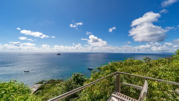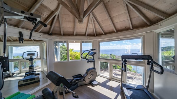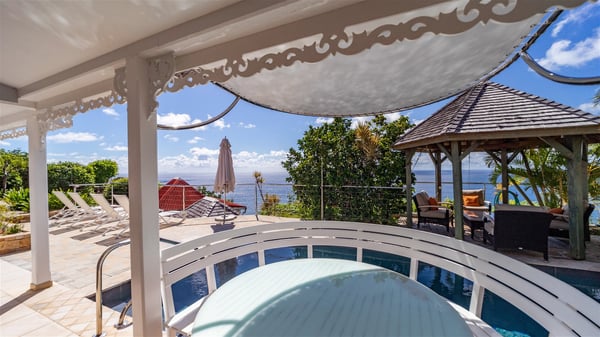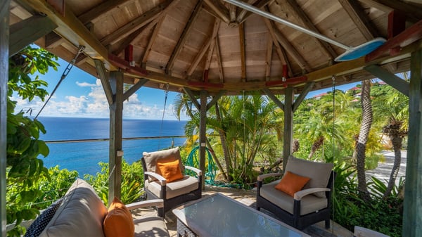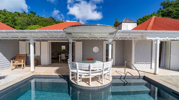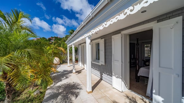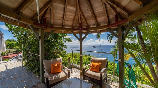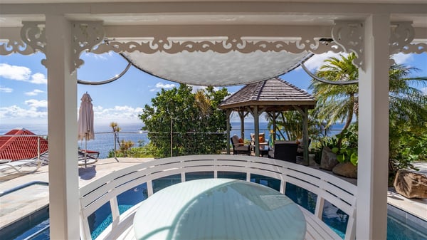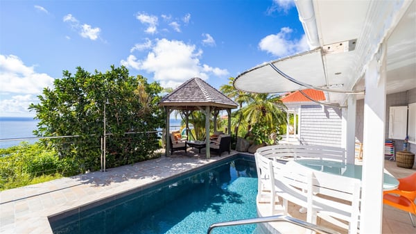 Located in Colombier, Villa Grain de Folie offers a fabulous view over the ocean and the glorious sunsets. Perfect for a family or a group of friends, it is also the ideal choice for a couple wishing to spend a romantic stay in St-Barts. Vacation villa Grain de Folie is a beautiful single-story house built in Saint-Barts’ typical architectural style. All around the property, lush tropical gardens create a relaxing, vegetal atmosphere. The air-conditioned, large living room and the modern, well-equipped kitchen open onto the outside to enjoy the gentle natural breeze. The living room is furnished with a beautiful leather sofa and has a home cinema system for movie nights, close to the formal indoor dining room. You may prefer to enjoy your meals grilled on the gas barbecue around the alfresco dining areas located behind the kitchen and under the gazebo, watching the amazing ocean view. The terrace offers a breathtaking view of the ocean and the harbour. There is a lovely swimming pool area on the deck set up with loungers for delightful sunbathing sessions. A lovely gazebo features the outdoor dining area for delightful moments in St. Barths’ mild air, facing the sumptuous sunsets. The terrace and the house are nestled in a lush tropical garden planted with palm trees, shrubs and orchids. Vacation villa in St. Barths, Grain de Folie has two beautiful air-conditioned bedrooms located on either side of the living room. Both are furnished with king-size beds and a television with American satellite, as well as large en-suite bathrooms with showers. They offer a beautiful sea view and open onto the terrace, where guests can enjoy the beauty of the island at any time of the day or night. A pathway leads to the small air-conditioned fitness room located in a separate bungalow with a splendid ocean view. Close to all amenities, Villa Grain de Folie is the ideal place for an unforgettable vacation facing the sunsets of Saint Barths.