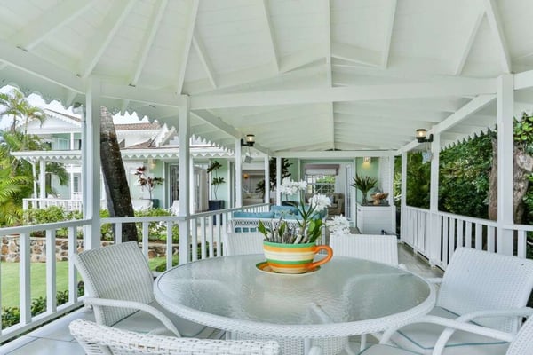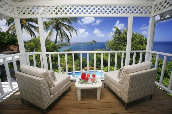 The very private and secluded Saline Reef Villa in Cap Estate is bright and modern with a beach house feel and panoramic ocean views. The 3 BR, 3.5 BA villa seamlessly blends indoor and outdoor living, with numerous gateways to destinations for dining, reading, sunning or quiet contemplation. The spacious Great Room with an entertainment center, vaulted ceilings, large windows and a convenient powder room, opens to the pool, patio and covered porch via four sets of double French doors. The springy lawn welcomes bare feet and features four comfortable vintage French loungers perfect for sunsets and stargazing. Steps away are beautifully landscaped private grounds with furnished sea-view areas to enjoy sun or shade, including a seaside BBQ/dining spot. Each of the 3 air-conditioned bedrooms (two seaside) has an ensuite bathroom and a walk-in closet. The lower seaside suite has direct pool access via a furnished covered porch. The upper seaside suite has a furnished private balcony. Adjoining the seaside suites is the double-deck gazebo with private seating and 180⁰ views. A well-equipped eat-in kitchen on the upper level frames sparkling seascapes through the large, custom-designed windows. Saline Reef Villa is minutes from two 18-hole golf courses (Cabot and Sandals), beaches, a full-service marina, shopping, dining and activities in Rodney Bay.