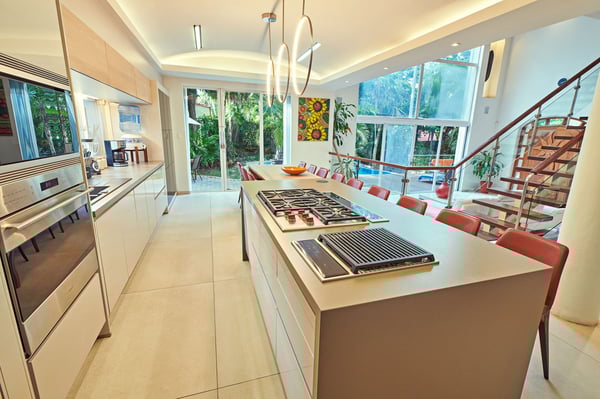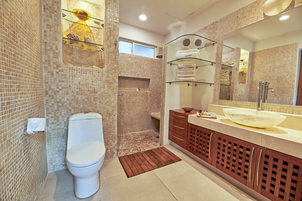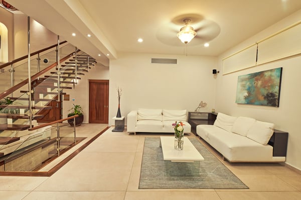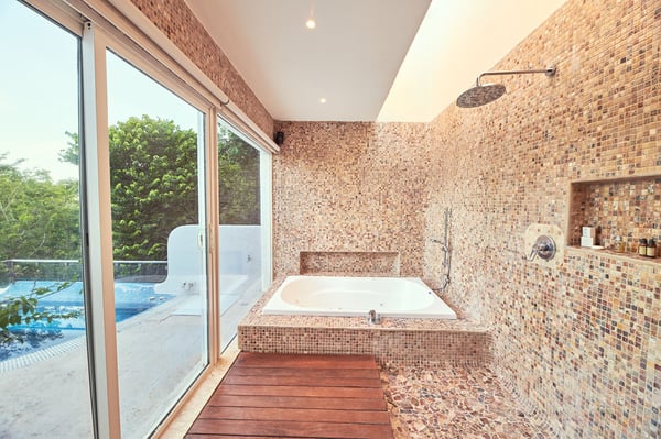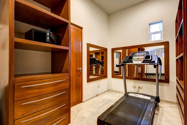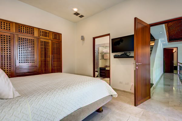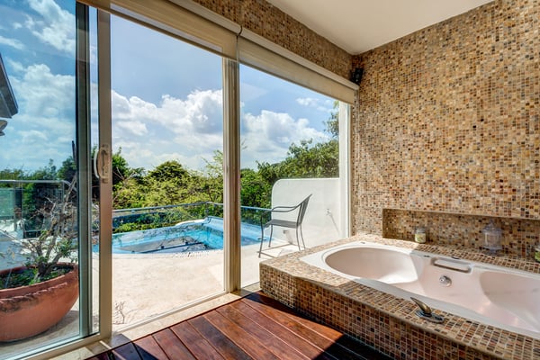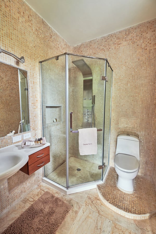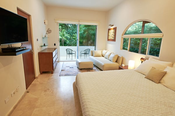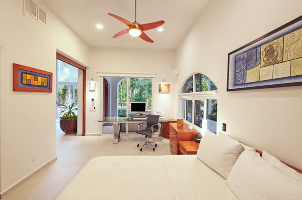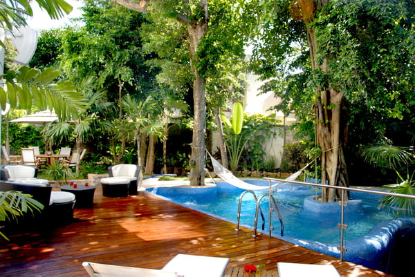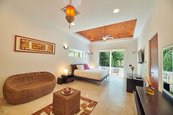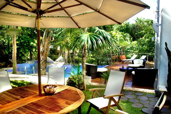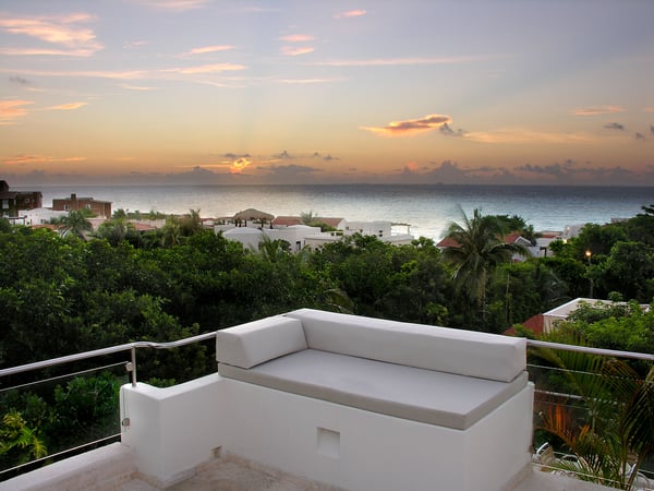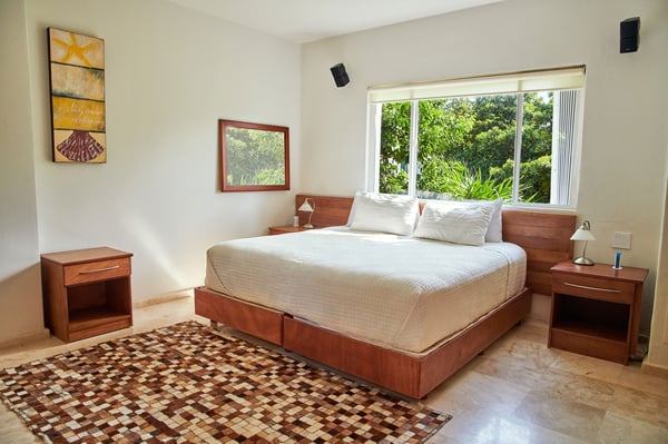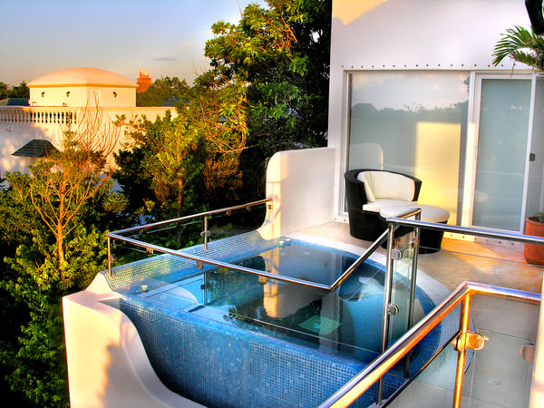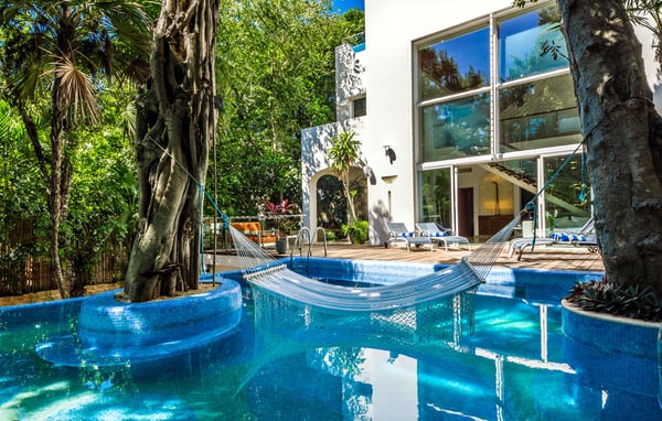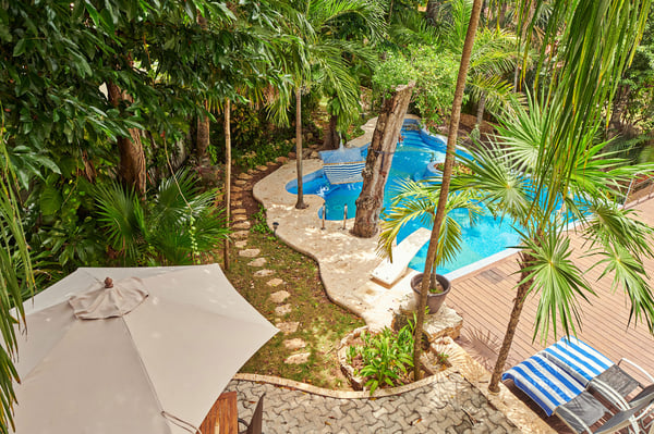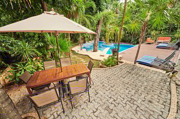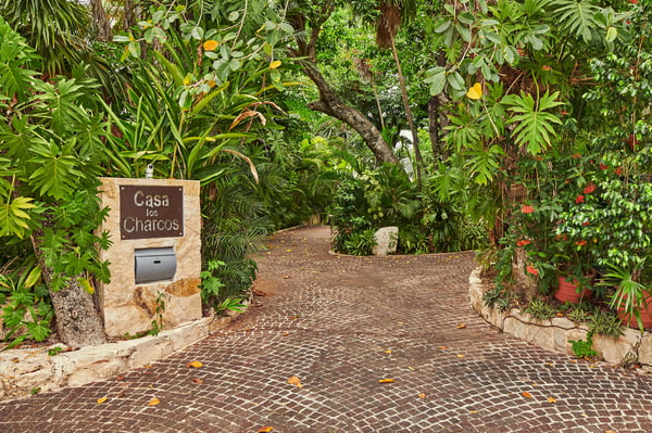Casa Los Charcos (loosely translated means House of Ponds) is a uniquely secluded hideaway surrounded by lush, tropical gardens. Charcos is an Eden paradise promising privacy, tranquility, serenity, white sandy beaches, wild natural beauty, and a sophisticated, luxurious lifestyle. Privacy, security, and excellence of service are guaranteed round the clock. It is a place where you can relax ocean side or pool side in a serene haven of your own while only minutes away from the exciting daytime activities and famous night life of Quinta Avenida (Fifth Avenue). Watch golden sunsets from the amazing master bedroom of your Mediterranean-style villa while listening to a background of exotic jungle sounds, or amble barefoot along the beautiful Caribbean and the expansive white-sand beaches. Charcos has an amazing view of the Caribbean and the island of Cozumel from one of the more than 1,000 square feet of terraces. The lot is approximately 8,000 square feet, and because of its shape and intense vegetation, it is virtually impossible to see the house and pool area from the street. Casa Los Charcos is the most private villa in all of Playacar. The house itself is a modern, magical marvel; the perfect tropical retreat, it offers a stunning location for guests to relax and experience the peace and tranquility of the Mexican Riviera. The 625-square-foot pool is heated and reaches seven feet at its deepest. It has a diving board and 6-seat Jacuzzi-style seating area with water massage. The pool also contains a 5.5 horsepower Swim-Jet system that produces a current so that you can “do laps” while swimming in place. The house has central air-conditioning and Direct TV satellite service in all the bedrooms *Please be aware that, due to warming weather and fluctuating ocean currents, the Riviera Maya may experience the presence of naturally occurring seaweed during the hotter months of the year.