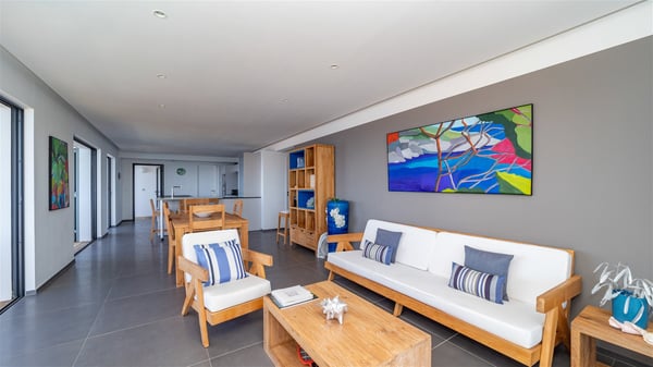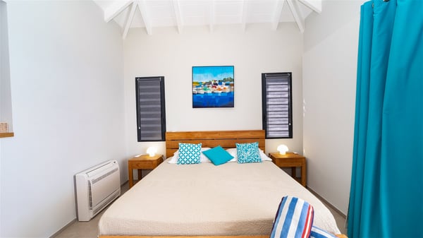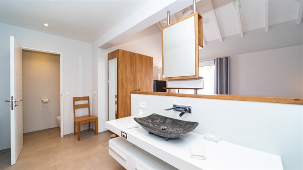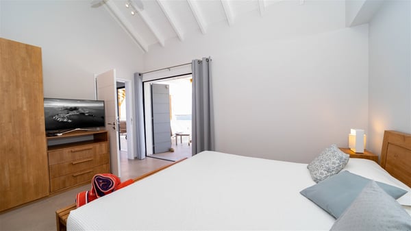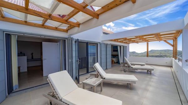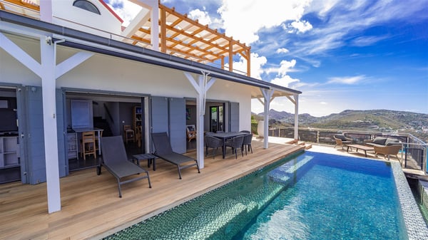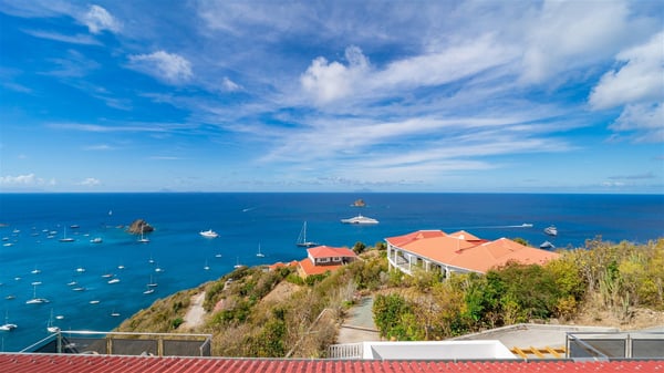 Located on the heights of Colombier, the beautiful vacation rental Belharra in St. Barths overlooks the deep blue ocean and opens onto a breathtaking view over Colombier Bay and Gustavia harbour. The ocean view from the terrace of Villa Belharra creates a serene and peaceful atmosphere you’ll enjoy during your stay in Saint-Barths. Built on two levels, Villa Belharra is composed of a modern and spacious living room decorated in warm tones. On the stone floor, the living room features comfortable contemporary sofas and coffee tables for relaxing moments in a refined setup; large windows are all around this living area with an amazing ocean view. This living space opens onto the modern, well-equipped white and mineral gray-toned kitchen. A dining area welcomes guests with high chairs and an extended bank. As you wish, you may prefer to dine alfresco around the large table set on the terrace, opening onto the breathtaking panorama. At the front of the house, you will enjoy the comfortable outdoor lounge and the deck chairs on the sunny terrace overlooking Gustavia and Colombier. The tiled infinity swimming pool is breathtakingly beautiful with crystal-clear water seeming to be a prelude to the infinite ocean. In the evening, you’ll marvel at St. Barth's incredible sunsets with glowing rays, a glorious and sumptuous show. On the first floor of Villa Belharra, there are two charming air-conditioned bedrooms equipped with king-size beds under whitewashed mansard ceilings. On the walls, the island-inspired paintings bring the deep blue waters of Saint Barths’ hints. Each room has its own private bathroom and opens onto the roof terrace furnished with lovely sunbeds. Nestled in a charming, lush tropical environment, the vacation rental Belharra is an ideal choice for a small family or a couple wishing to enjoy a romantic stay or a honeymoon in St. Barths, in front of a stunning panoramic view.
